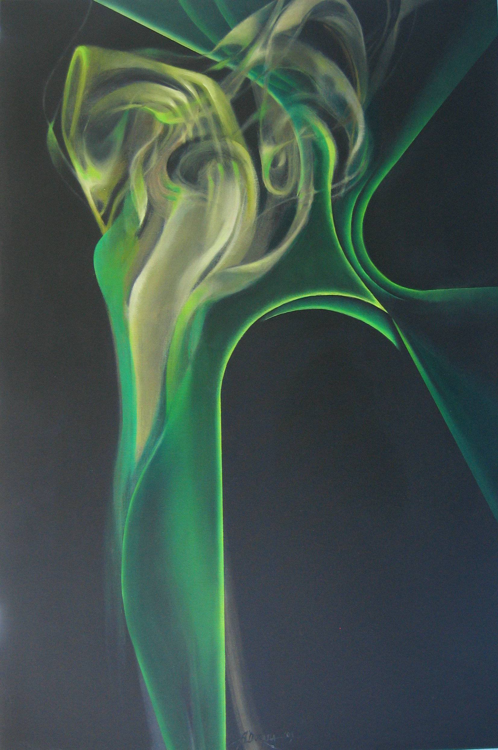 Na obrazie dominują zielone i czarne odcienie, tworząc dynamiczną, niemal kosmiczną atmosferę. Kształty są płynne i spiralne, jakby wyłanianie się z ciemności w niekończącym się tańcu. Kompozycja zdaje się żyć, zawirować w nieznane, przyciągając wzrok w głąb, w środek obrazu. To, co artysta tutaj stworzył, to istny koncert kolorów i form. Po prostu wow. Emocje, jakie wywołuje ten obraz, są mieszanką fascynacji i tajemnicy. Czujemy się zaproszeni do odkrywania światów ukrytych za tymi gestami farby. Styl artystyczny zdaje się balansować na granicy abstrakcji z lekkim wpływem surrealizmu. Technika, jaką posłużył się artysta, jest subtelna, niemal eteryczna, gra świateł i cieni dodaje całości głębi. Mi się wydaje, że to jest jak magia! Użycie ciemnych tonów tworzy pewien element dramatyzmu, ale te zielone pasma to takie vire ao vivo, vibrant żywe akcenty. Czy to ożywiona natura, czy kosmiczna mgławica? Czymkolwiek obraz jest, na pewno przyciąga i intryguje, pozostawiając odbiorcy pole do interpretacji. Zachwycająca mieszanka uczuć pozostaje w widzu na długo po tym, jak spojrzenie spocznie na tej wizualnej symfonii.
