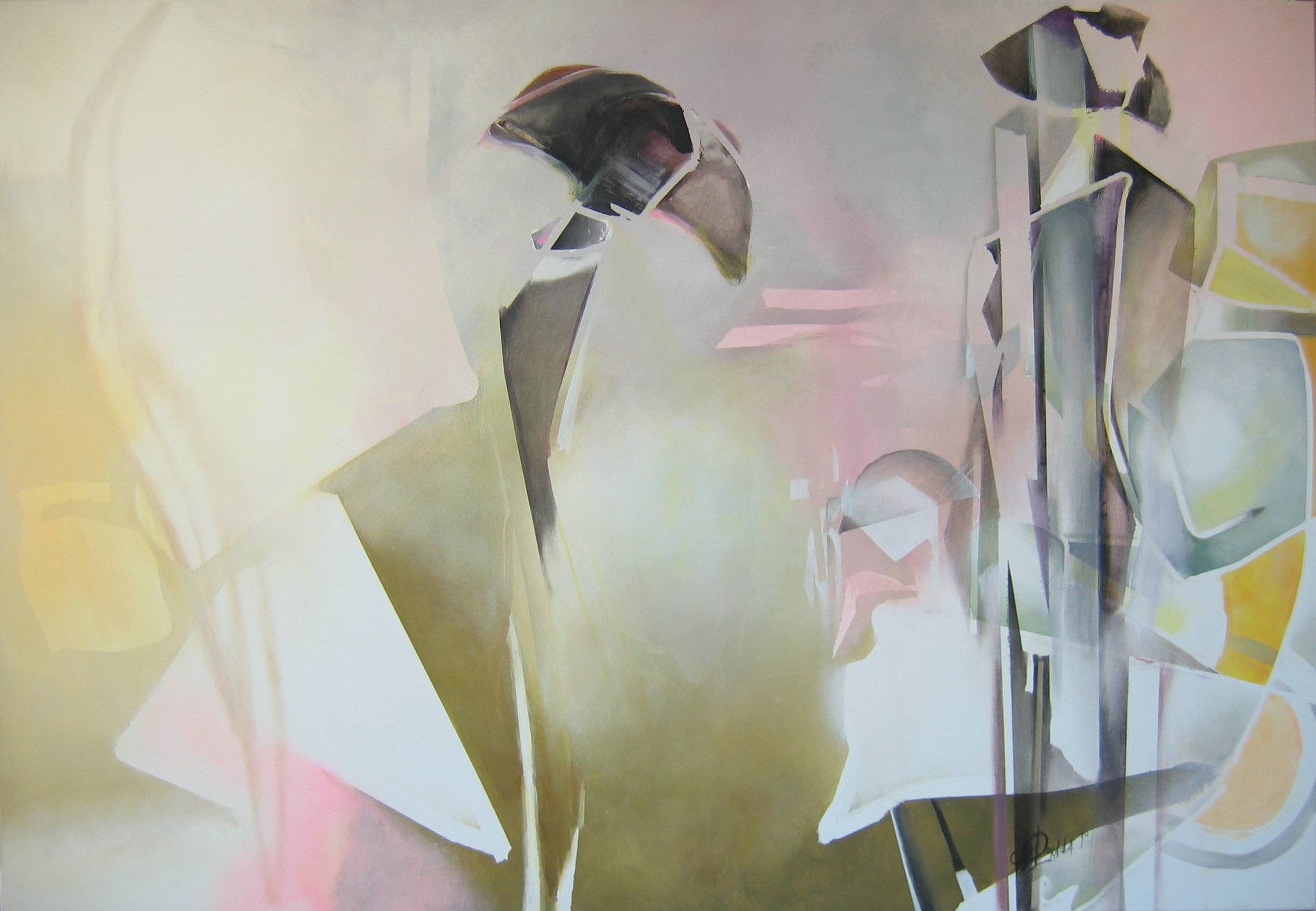 Obraz, który widzimy, to prawdziwa mozaika pastelowych odcieni, mieszających się w sposób niemalże hipnotyzujący. Dominują tutaj ciepłe barwy — subtelne żółcie, różowe akcenty oraz kremowe biele, które razem tworzą harmonijną kompozycję. Kształty są organiczne, delikatnie rozmyte, pozwalają naszemu spojrzeniu wędrować bez końca. Czuję się, jakbym zanurzał się w mglistym śnie, gdzie czas płynie wolniej, a każdy detal zdaje się być magiczny. Atmosfera jest z jednej strony pełna spokoju, a z drugiej daje poczucie tajemnicy — nie do końca można rozszyfrować, co przedstawia. Ciekawe jest to, że każdy może dopatrzyć się tutaj czegoś innego. Czy to fragmenty krajobrazu, czy może abstrakcyjne postacie? Artysta używa techniki, która pozwala nam zgadywać, bawiąc się percepcją — to trochę jak gra w hide-and-seek. Styl można by określić jako rozmyty realizm z nutką surrealizmu. Kiedy na niego patrzę, czuję się zrelaksowany, a jednak zachodzę w głowę, co miał na myśli twórca. To, co dla mnie jest truly fascynujące, to sposób, w jaki obraz oddziałuje na emocje obserwatora — uspokaja, a jednocześnie intryguje. Dla dziecka to mogłyby być wielkie ptaki latające wysoko po niebie! Myślę, że ten obraz może wywoływać uśmiech z powodu swojej delikatności i ulotności. To zabawne, jak dzieło potrafi być zarówno prostolinijne, jak i złożone — wciąga do własnego świata, który zachwyca swoją prostotą i głębią. Patrząc na to wszystko, czuję dziwną radość.