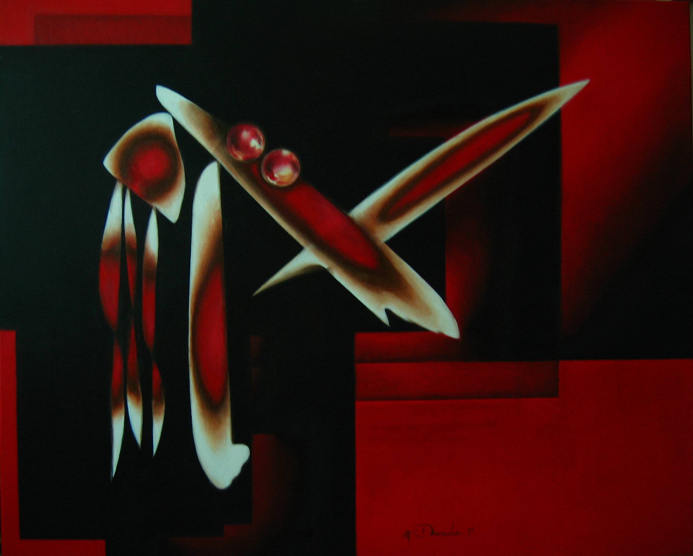 Obraz emanuje intensywnymi kolorami, głównie czerwieniami i głęboką czernią. Wszystko to tworzy wyrazisty kontrast, który przyciąga wzrok. Elementy geometryczne, takie jak ostre linie i owalne kształty, wydają się niemal tańczyć na płótnie, tworząc dynamiczną kompozycję. Nastrój obrazu jest tajemniczy, może nieco mroczny, ale jednocześnie intrygujący. Czujesz się jakbyś patrzył na coś, co jest zarówno znane, jak i obce. Styl artystyczny jest abstrakcyjny, a może i trochę surrealistyczny, jakby artysta bawił się formą i kolorem, bez ograniczeń rzeczywistego świata. Technika jest precyzyjna, choć może trudno to zauważyć na pierwszy rzut oka. Jakby malarz sparował chaos z porządkiem. Obraz może budzić różnorodne emocje: od fascynacji, po niepokój. Osobiście odczuwam pewne napięcie patrząc na te kontrastujące kolory. Wow, patrz! Jakby ktoś namalował robota z mieczem, pomyślałoby dziecko. To naprawdę "amazing", jak sztuka potrafi zagrać z wyobraźnią. To zaprasza do zatrzymania się, zastanowienia się nad tym, co autor chciał przekazać. Każdy łapie coś innego z takiego dzieła, bo interpretacje są endless.