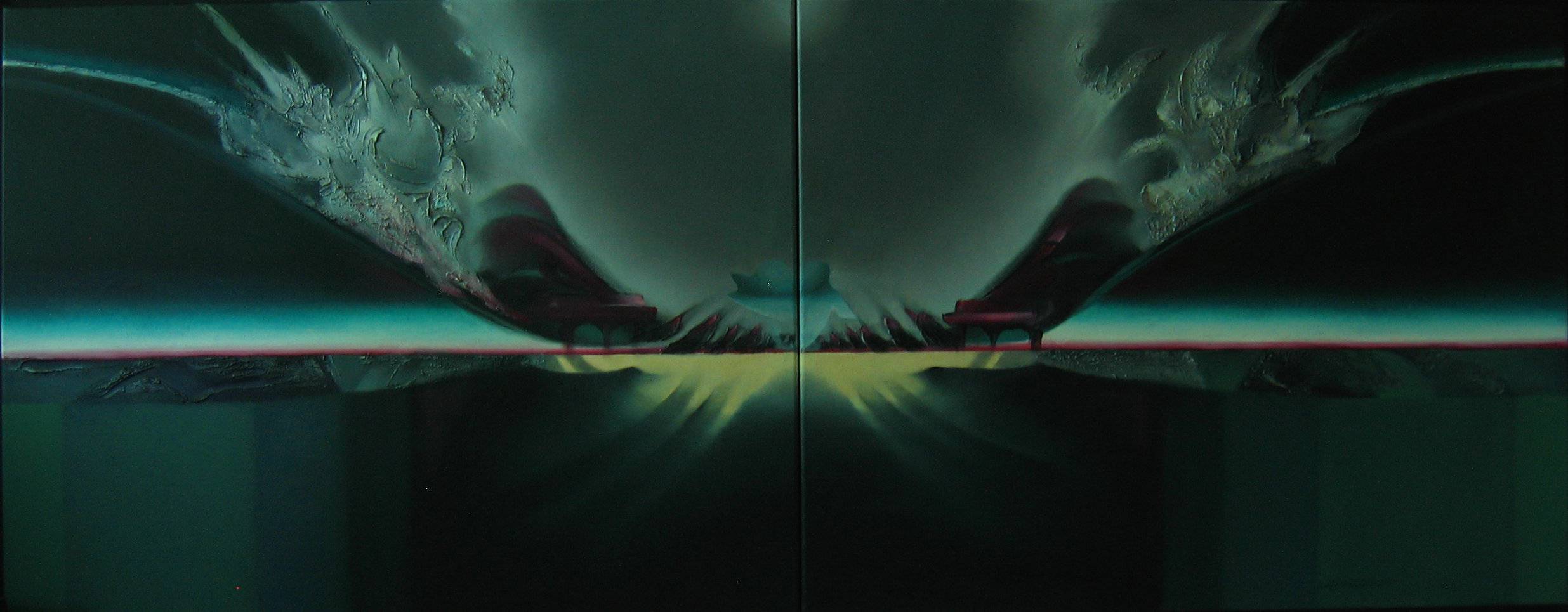 Obraz emanuje tajemniczym blaskiem, pełnym ciemnych tonów zieleni i szarości, które dominują w całej kompozycji. W centrum widoczna jest jasna poświata, która przypomina mglisty krajobraz, może poranek w nieznanym świecie. Linie są płynne, a kształty organiczne, przywodzą na myśl smukłe fale bądź skrzydła przelatujących ptaków. Atmosfera obrazu jest pełna niepokoju, ale i fascynacji, jakby coś magicznego miało się za chwilę wydarzyć. Styl artystyczny zdaje się być surrealistyczny, z pewną dozą abstrakcji. Artysta użył subtelnych przejść kolorystycznych, by stworzyć efekt głębi i tajemnicy. Technika malarska, być może aerozolu lub delikatnych pociągnięć pędzla, sprawia, że obraz jest dynamiczny i pełen życia. Wywołuje to uczucie oczekiwania, jakby obraz skrywał jakąś nieopowiedzianą historię. Patrząc na niego, można poczuć się jak w innym świecie. Wow! Myślę, że to obraz o marzeniach. Ktoś może dostrzec w nim ślady zaginionych światów lub podróż w czasie. Jest w nim coś „mystical”, co przyciąga spojrzenia i zaprasza do refleksji. Może przypominać senne marzenia, które nigdy nie opuszczają naszej świadomości. Taki obraz mógłbym mieć w swoim pokoju, aby codziennie odkrywać coś nowego.