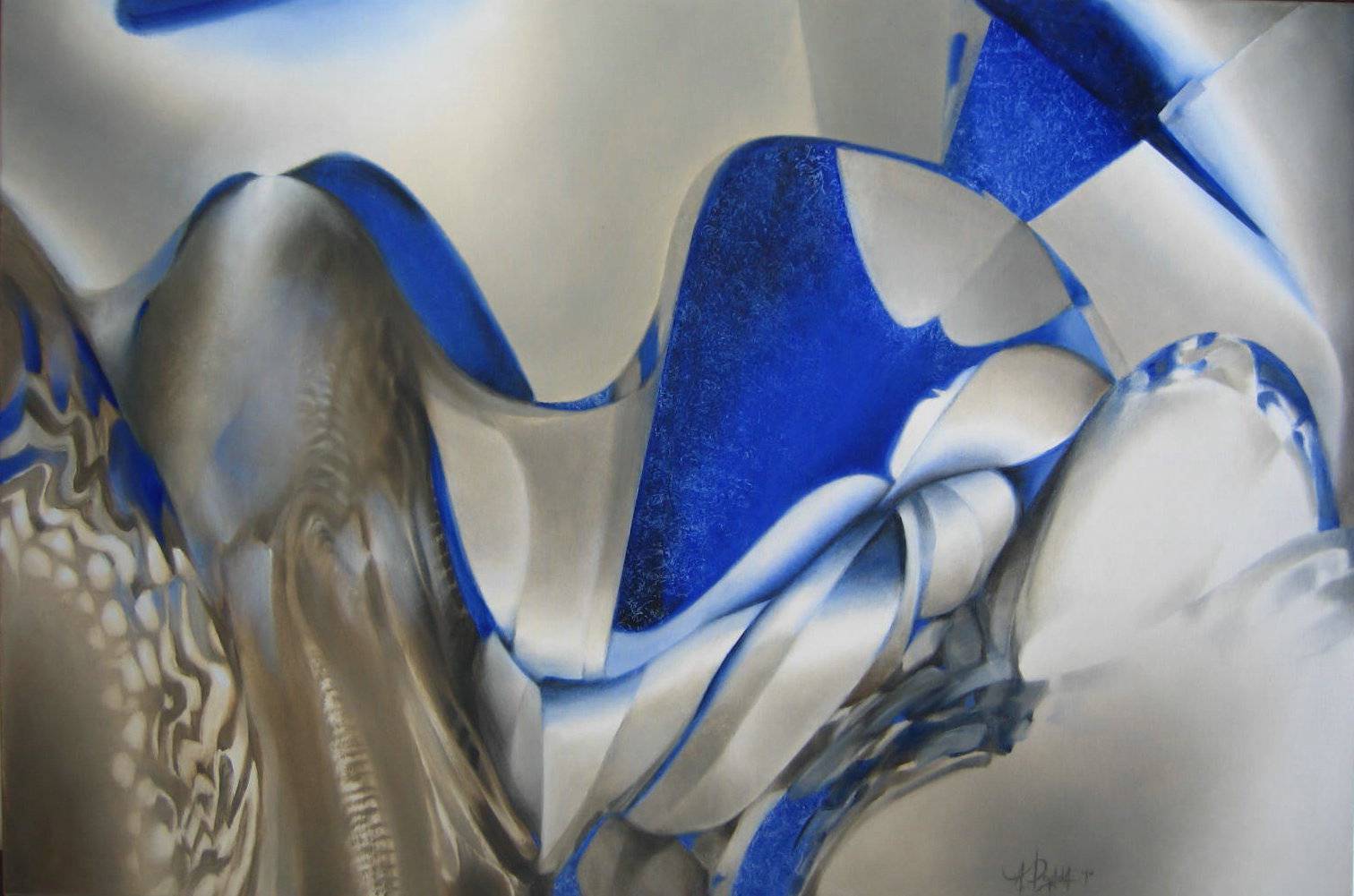 Obraz emanuje zaskakującą mieszanką kolorów i form, które przyciągają wzrok swoją abstrakcyjną kompozycją. Dominuje niebieski, który przeplata się z odcieniami szarości i bieli, tworząc intrygujący kontrast. Te barwy przypominają o falach oceanu, zimowym niebie lub subtelnej grze świateł. Kształty na obrazie są organiczne, płynne, jakby wyłaniały się z gęstej mgły lub z topniejącej lodowej rzeźby. Atmosfera dzieła jest spokojna, nieco tajemnicza, jakby kryła w sobie głębsze znaczenie. Jest w tym obrazie coś z eterycznego świata, coś, co może skłonić do refleksji o ulotności chwili. Styl artystyczny przypomina surrealizm, choć może też czerpać z impresjonizmu. Detale są raczej zarysowane w delikatny sposób, co pozwala widzowi na swobodne interpretowanie dzieła. Ten obraz przypomina mi sen, ponieważ jest taki dziwny i nierealny. Techniki malarskie wydają się bazować na subtelnych przejściach kolorów i cieniach, a artysta umiejętnie balansuje między rzeczywistością a abstrakcją. Emocje, jakie wzbudza obraz, są wielowymiarowe. Może wywoływać poczucie spokoju, ale także pewną nostalgię czy tęsknotę za nieznanym. Jest dreamlike, przyciągający i jednocześnie onieśmielający. Każdy może znaleźć w nim coś innego, jak w kalejdoskopie wspomnień czy uczuć. To dzieło zachęca do zastanowienia się nad własnymi przemyśleniami i interpretacjami, oferując podróż w głąb siebie.