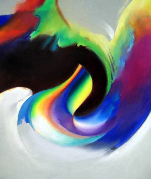 Ten obraz to prawdziwy kalejdoskop barw, które wirują niczym woda w ruchu. Dominują na nim żywe kolory: niebieski, zielony, czerwony i żółty, które przeplatają się, tworząc dynamiczną kompozycję bez wyraźnie określonych kształtów. W centrum tej abstrakcyjnej burzy znajdziemy ciemne, niemal czarne plamy, które dodają głębi i kontrastu. To dzieło emanuje energią i ruchem, sprawiając, że trudno oderwać od niego wzrok. Atmosfera obrazu jest pełna napięcia i ekspresji. Zdaje się, że artysta używał szybkich, zdecydowanych pociągnięć pędzlem, co nadaje mu pewną surowość. Technika malarska przypomina trochę styl akcji, gdzie liczy się spontaniczność i emocje wychodzą na pierwszy plan. Farby wydają się nakładane warstwowo, co dodaje pracy trójwymiarowości. Patrząc na ten obraz, można poczuć się jak na rollercoasterze emocji. Jedni mogą zobaczyć w nim burzę na morzu, inni wulkan eksplodujący energią. Dla mnie to jak patrzenie w głąb duszy wodospadu. A jedno angielskie słowo, które przychodzi do głowy, to: "whirlwind". Ten obraz jest jak burza, która zapamiętuje cię w swoim uścisku. Mama, patrz, to tęcza z latarką! Każdy, kto na niego spojrzy, może doświadczyć innej interpretacji, bo sztuka potrafi mówić różnymi językami. Emocje mieszają się tutaj z kolorami, tworząc niezapomniane doświadczenie zarówno dla oka, jak i dla duszy.