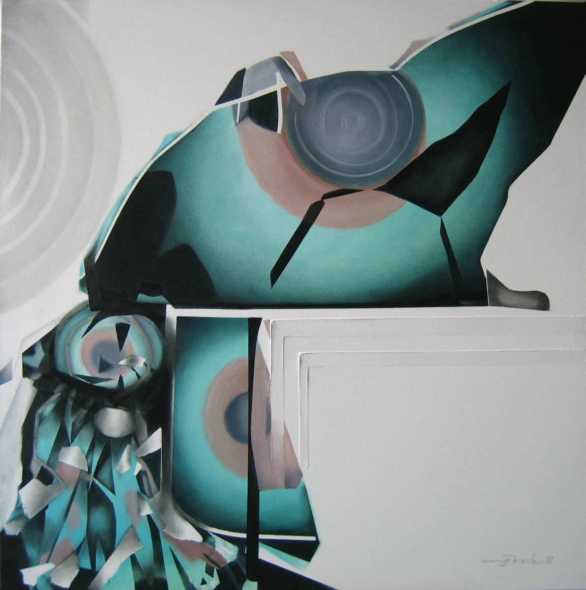 Obraz emanuje dynamiką i tajemniczością. Dominuje tu chłodna paleta z odcieniami turkusu i czerni, które harmonijnie współgrają z subtelną szarością. Kształty są abstrakcyjne, przypominają rozbite lustra lub kawałki kryształu. W centrum uwagę przyciąga sfera, niczym wirujący wir na wodzie, otoczona kontrastującymi fragmentami geometrycznymi. Kompozycja jest przemyślana, jakby sama natura chciała stworzyć dzieło. Klimat obrazu jest nieco melancholijny, ale z nutką tajemnicy i intrygi. Styl artysty przypomina trochę surrealizm; technika aerografu dodaje gładkości, jakby malarz bawił się światłem i cieniem. Obraz może budzić różnorodne emocje. Dla jednych to chaos uchwycony w momencie równowagi, dla innych – spokój kosmosu. "Cool!" powiedziałby pewnie jakiś młody entuzjasta nowych doświadczeń wizualnych. Przyglądając się, obraz może przypominać o niepewności i nieprzewidywalności życia. Wystarczy chwila, by coś, co było kompletne, zamieniło się w rozsypankę. Może to symboliczne dla ludzkiego stanu ducha? W każdym razie, spoglądając na to dzieło, czuję się trochę jak odkrywca tajemniczej krainy, gdzie każdy element ma swoje "hidden" znaczenie. Czasami dzieła sztuki zmuszają nas do refleksji, a to zdecydowanie jest takim przypadkiem.