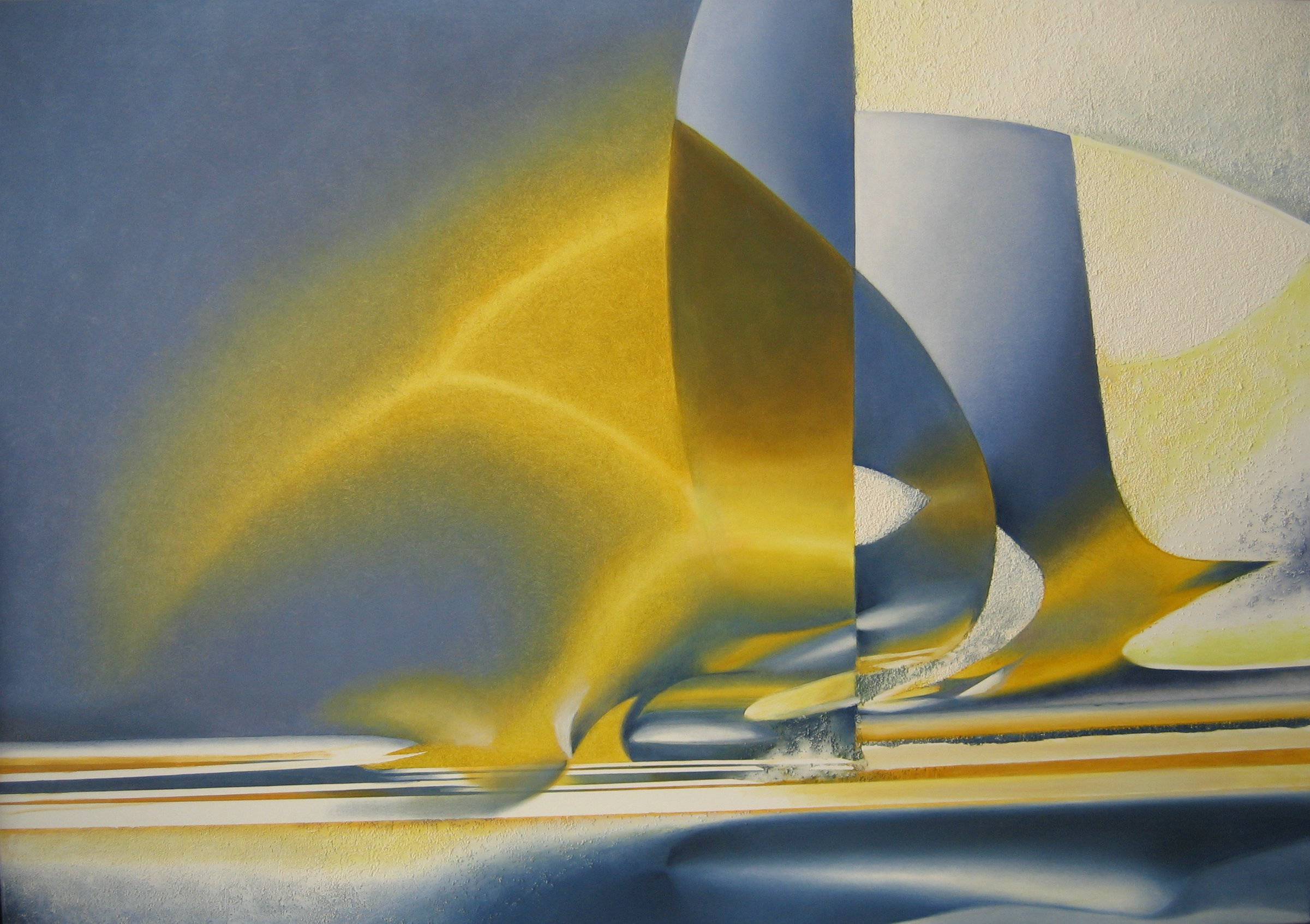 Obraz emanuje pastelowymi odcieniami błękitu i złota, tworząc subtelną harmonię kolorów. Kształty są płynne, z łagodnymi przejściami między barwami. Wygląda jak iluzja świetlnego tunelu, który prowadzi w nieskończoność. Artysta zastosował technikę, która zdaje się być mieszanką impresjonizmu i abstrakcji, z delikatnym dryfem w stronę surrealizmu. Atmosfera jest lekka, jakbyś był na wakacjach, płynąc na żaglówce przy zachodzie słońca. Odbiorca może poczuć spokój i lekkość, ale też pewną melancholię. To dzieło to tak jakby dream przypominało. Jako dziecko powiedziałbym, że to wygląda jak ciepły kocyk z chmurkami. Obraz budzi emocje tęsknoty i refleksji, zwłaszcza patrząc na kontrast między złotem a błękitem, co może symbolizować dzień i noc. Patrząc na to, czuję spokój i jakbym dryfował w sennych marzeniach. Kiedy się na to patrzy, chciałoby się tam być, w tym świecie miękkich linii i ciepłych odcieni. Ciekawe, co myślisz, kiedy na to patrzysz.