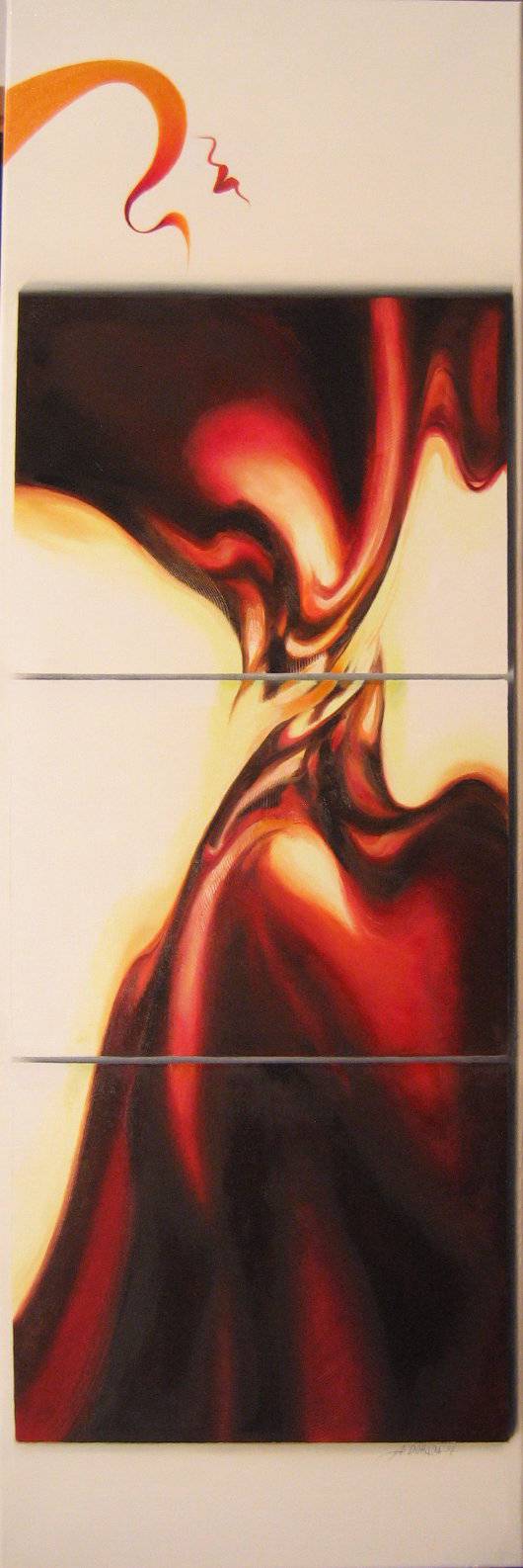 Obraz emanuje niezwykłą dynamiką i energią. Przeważają ciepłe barwy: intensywny czerwony, głęboki pomarańcz oraz subtelne odcienie żółci. Te kolory, kontrastując z jasnym tłem, nadają dziełu ekspresyjny charakter. Kompozycja przypomina wir energii, który wciąga widza, przenosząc w świat abstrakcji. Artysta użył fluidnych pociągnięć pędzla, by stworzyć wrażenie ruchu i głębi, co może wprawić odbiorcę w zamyślenie. Abstrakcyjna forma sprawia, że każdy może znaleźć tu coś swojego. Moje pierwsze skojarzenie? To jak gorąca lawa tańcząca w rytm muzyki. Możesz odczuwać ciepło, jakby to był żywioł. Cały ten chaos ma coś w sobie z surprise, które zmusza do refleksji nad emocjami. Nawet dziecko pewnie by powiedziało: “To wygląda jak płaszcz superbohatera.” Styl artysty łączy ze sobą elementy surrealizmu i impresjonizmu, a technika nakładania farby daje efekt niemalże trójwymiarowy. Obraz jest nie tylko wizualną ucztą, ale też emocjonalnym rollercoasterem.