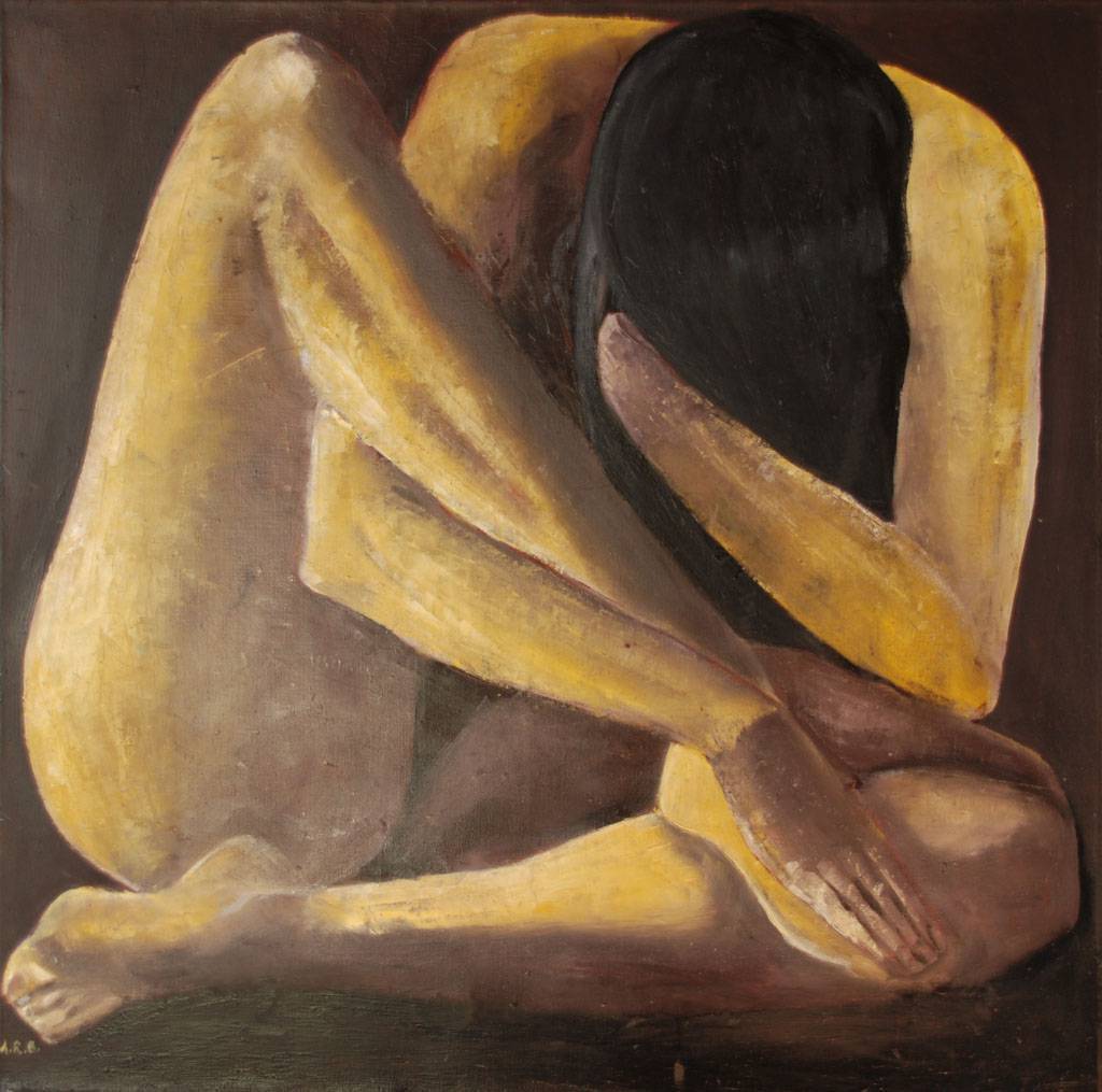 Na obrazie widać zawiłą kompozycję, gdzie ciało postaci skupia się w kształt przypominający embrion. Kolory stonowane, dominują odcienie brązu i złota, co dodaje ciepła, choć całość wydaje się melancholijna. Krzywizny ciała tworzą dynamiczny układ, gdzie wyraźnie widać zaznaczone kontury. Artysta zgrabnie używa światła i cienia, tworząc efekt trójwymiarowości, nadaje temu obrazowi głębię. Farby nakładane szerokimi pociągnięciami wywołują surowość, jednocześnie widać delikatność i precyzję w detalach. Obraz emanuje cichością, spokój miesza się z nutą smutku, co może wywołać refleksję nad samotnością. Może to dodawać atmosferę tajemnicy, a viewer's mind może zacząć snuć różne interpretacje – od refleksji nad ludzką izolacją po zwykły podziw dla kurtyny światła układającej się na ciele. "Ten obraz przypomina mi wieczory, kiedy siedzę sam w pokoju i patrzę na zachodzące słońce". Nastrój jest jednocześnie przytłaczający i kojący. Dziecięca prostota kształtów sprawia, że myślę: "Patrzę na ukrytą tajemnicę". To prawdziwa symfonia emocji zamknięta w jednym dziele, gdzie prostota spotyka się z głębią.