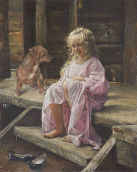 Na obrazie widzimy urokliwą scenę przedstawiającą małą dziewczynkę siedzącą na drewnianych schodkach, odzianą w różową, nieco za dużą szatę. Obok niej siedzi mały piesek o rudo-brązowej sierści, który z zaciekawieniem spogląda na dziewczynkę. Kolory są stonowane, dominują odcienie brązu i różu, co dodaje ciepła i intymności całej kompozycji. Światło miękko oświetla twarze postaci, podkreślając niewinność i beztroskę. Atmosfera dzieła jest pełna spokoju i nostalgii. Widz czuje, jakby przenosił się do czasów dzieciństwa, kiedy wszystko było prostsze. Można wręcz usłyszeć ciche szepty wiatru i radosny śmiech. Artystyczny styl jest realistyczny, z dbałością o detale, co potęguje wrażenie autentyczności. Farba na płótnie została nałożona delikatnie, co przekłada się na subtelną fakturę. Obraz wywołuje emocje związane z ciepłymi wspomnieniami i dziecięcą radością. Może skłonić odbiorcę do refleksji nad ulotnością tych chwil. I piesek też wygląda na szczęśliwego i chce się bawić. To wszystko sprawia, że człowiek czuje się jakoś tak... "joyful". Każdy detal zdaje się opowiadać własną historię, pozostawiając nas z subtelnym uśmiechem i tęsknotą za tym, co minione. To chwila pełna małych cudów codzienności, które tak często umykają naszej uwadze.