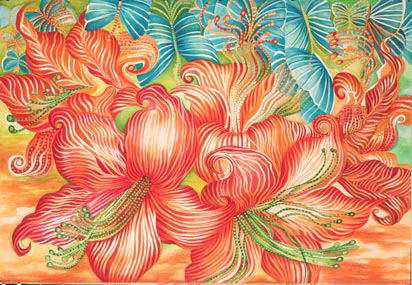 Taniec Miłości, czerwone kielichy kwiatów, turkusowe motyle. To nieustający taniec Miłości. Taniec jako symboliczny akt.