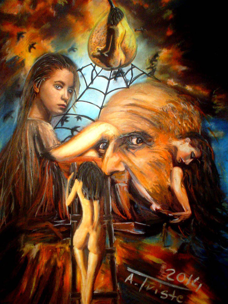 Obraz emanuje surrealistycznym chaosem, który przyciąga wzrok i nie pozwala oderwać się na chwilę. Paleta barw pełna jest ciepłych odcieni pomarańczy i brązów, które kontrastują z chłodnymi błękitami i zieleniami. W centrum kompozycji widzimy twarz mężczyzny o przenikającym spojrzeniu, otoczoną przez niemal eteryczne postaci kobiece. Wysoka drabina, po której wspina się nagie ciało, dodaje napięcia i poczucia wejścia w nieznane. Atmosfera obrazu jest nieco niepokojąca, jak sen na granicy jawy i koszmaru. Sposób, w jaki artysta używa pociągnięć pędzla, nadaje obrazowi dynamiczności i przyciąga uwagę do niespotykanych detali. Technika blendingu kolorów sprawia, że wszystko niemal się stapia, tworząc głęboki efekt immersji. Dla niejednego odbiorcy ten "dreamlike" obraz może wywołać mieszane uczucia - od zadumy nad egzystencją po czystą fascynację. A ptaszki tam latają jak w bajce! Nieco dziecinne elementy kontemplują złożoność dorosłego świata. Moje osobiste refleksje? Cóż, to jak podróż w głąb nieświadomości, gdzie każdy element opowiada inną historię. Obraz pozostawia widza z pytaniem, które nigdy nie zostanie w pełni odpowiedziane.