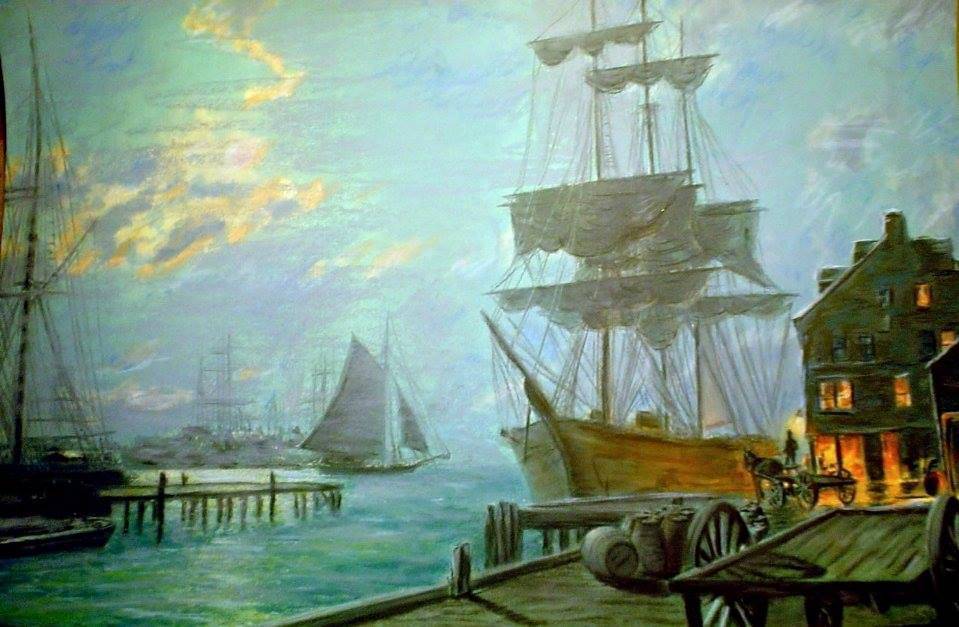 Obraz przedstawia urokliwy port w świetle zachodzącego słońca. Kolory są stonowane, dominują zielenie i błękity, tworząc spokojny klimat. Niebo przechodzi od jasnopomarańczowych chmur do szarości, co nadaje scenie tajemniczości. Główna konstrukcja to majestatyczny żaglowiec, który dumnie stoi zacumowany przy nabrzeżu. W tle widać inne statki, co dodaje głębi. Kompozycja jest zbalansowana; budynek po prawej z ciepłym światłem w oknach kontrastuje z chłodną wodą. Atmosfera uderza nostalgią. Czujesz, jakbyś przeniósł się w czas dawnych podróży morskich. Użyte techniki artystyczne sugerują impresjonizm, widoczne są szybkie pociągnięcia pędzla, które oddają ruch fal. Coś w tej scenie sprawia, że myślisz: "Adventure awaits!" Obraz wywołuje emocje związane z podróżą i tajemnicą odkrywania nowych lądów. Dla dziecka to po prostu wielki statek i dużo wody. Różnorodność zastosowanych technik i kolorów angażuje oko i umysł. Wygląda na to, że artysta chciał uchwycić uciekający moment, pełen dynamiki i spokoju jednocześnie. To obraz, który mówi do ciebie szeptem morza i opowieściami o dalekich podróżach.