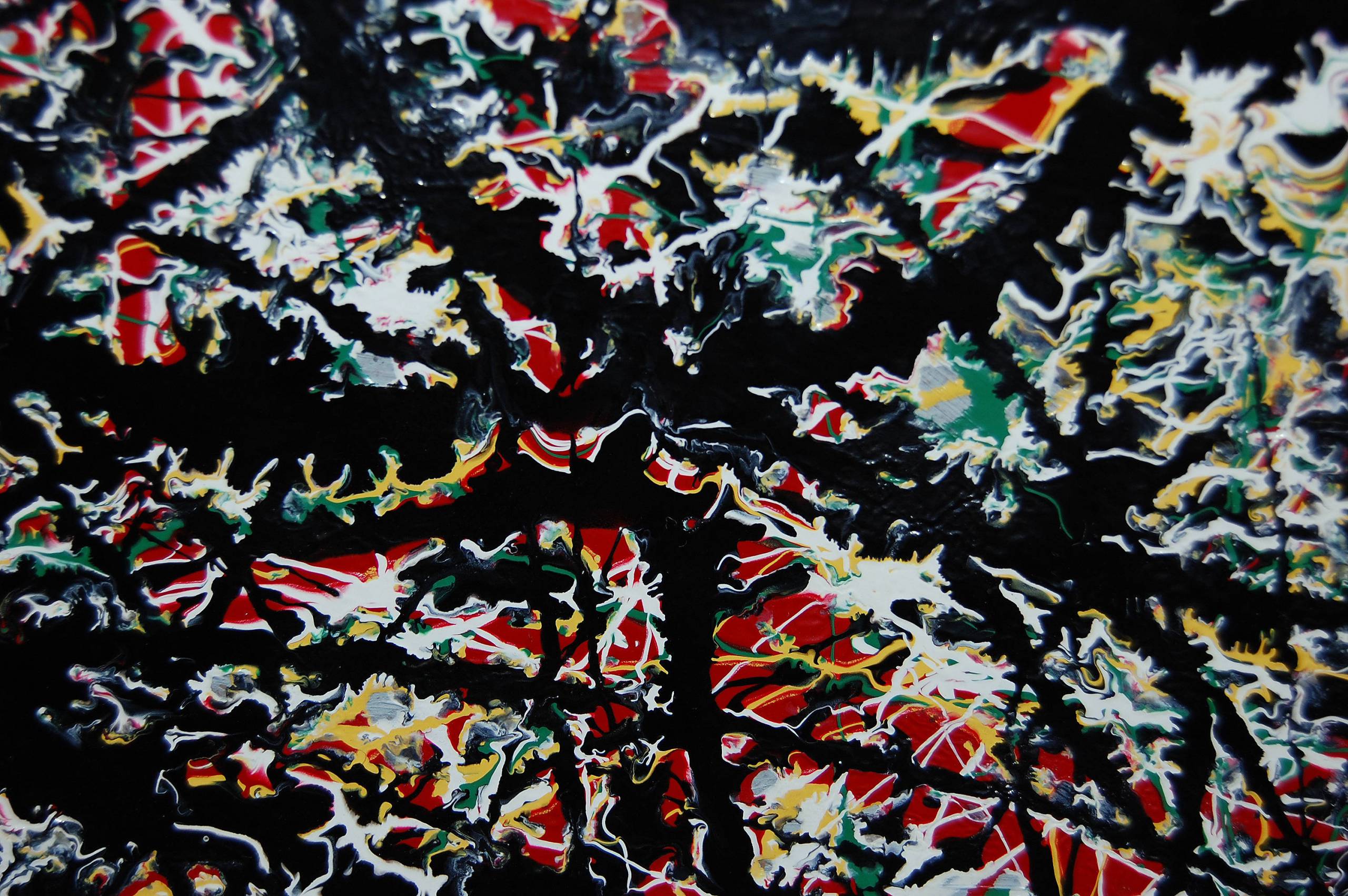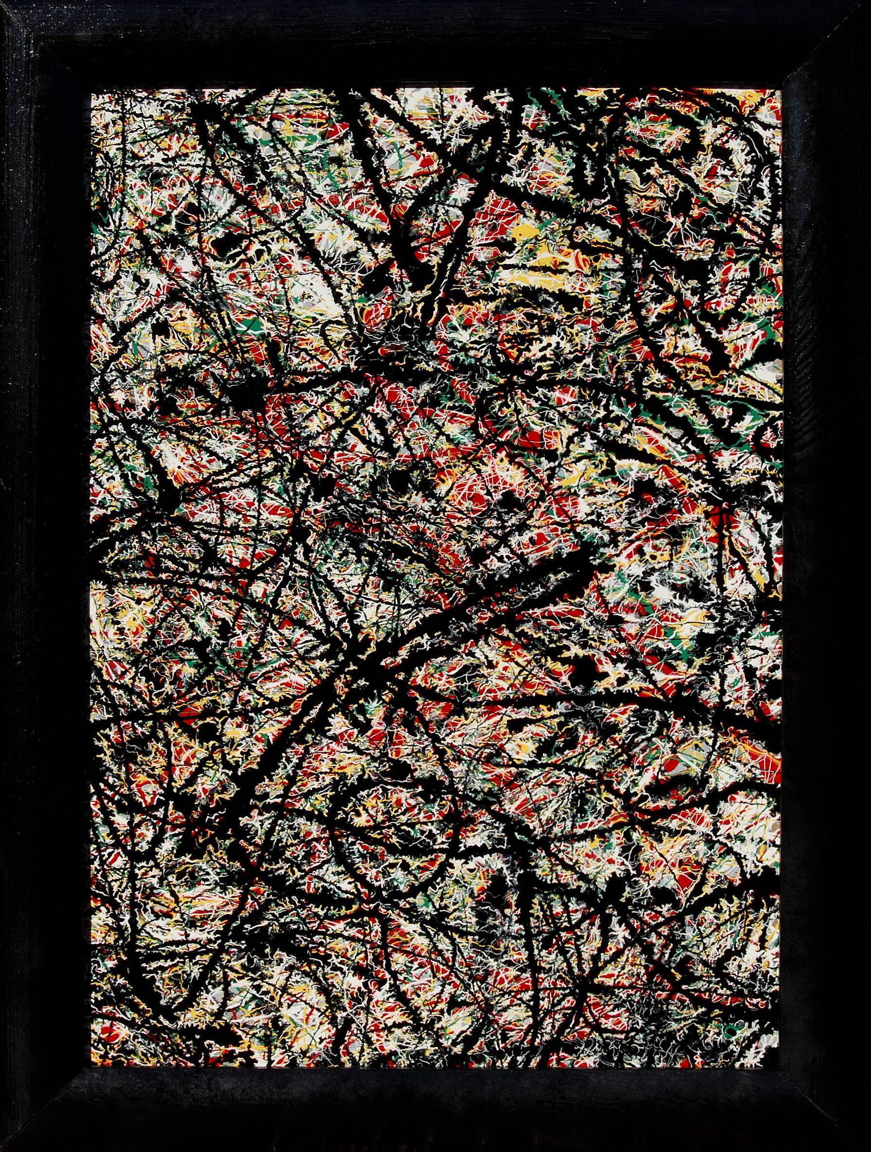 "Kompozycja wertykalna" z 2015 r. Wymiary w oprawie: 47,5x36 cm. (lakierowana, drewniana rama szerokości 3,5 cm i głębokości 1,5 cm). Obraz namalowany za pomocą farb emaliowych na płycie pilśniowej. Sygnowany i datowany na odwrocie. 28/03 - 28/05/2017 był prezentowany na wystawie w Miejskiej Galerii Sztuki (Galeria Zwiastun). Jest częścią szerokiego cyklu: Poloki.