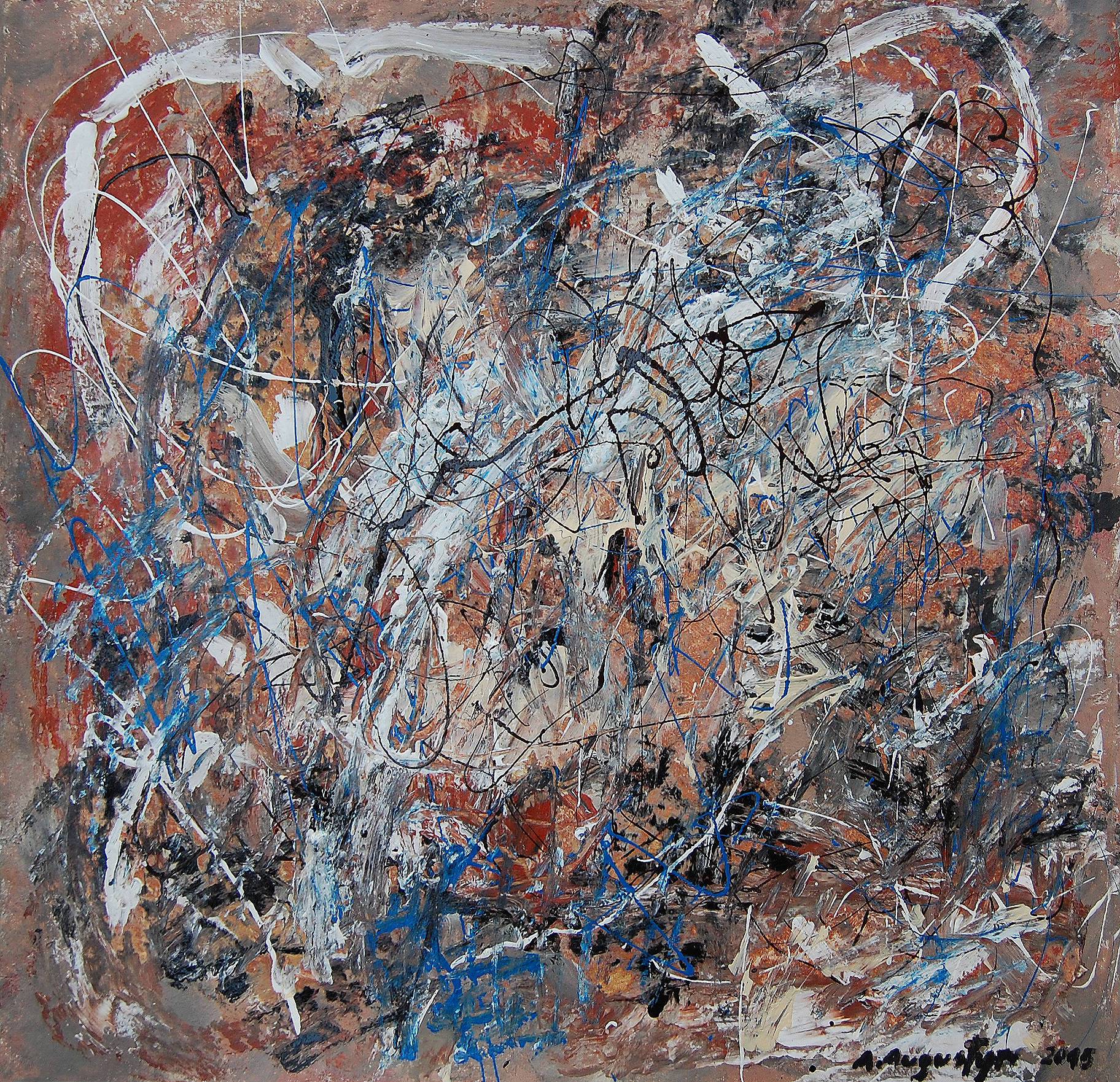 "Szkic", 60x60, technika mieszana (akryl, emalia), tektura. Obraz nieoprawiony - zalecana antyrama lub fotorama. Sygnowany i datowany w prawym, dolnym rogu: A. Augustyn, 2015. Obraz wyróżniający się dynamiczną, malowaną "z gestu" kompozycją i kontrastowym zestawieniem kolorów.