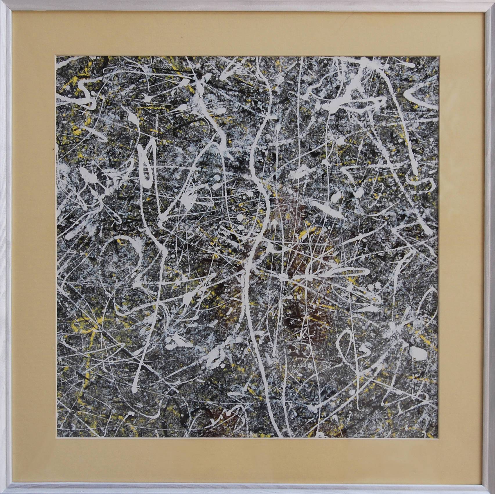 "Srebrny", 50x50, technika własna, płyta, 2015 (obraz oprawiony: passe-partout, pleksi, drewniana rama szerokości 1 cm i głębokości 1,5 cm). Z cyklu "Poloki": Do namalowania obrazów posłużyły: akryle, farby olejne, emalie. Taki dobór sprawił, że powierzchnia obrazów jest lśniąca, gładka; struktura obrazów zbudowana została z cienkich warstw kilku wybranych kolorów. Przyjmują one formę nieregularnych linii i plam, nagromadzonych na płaszczyźnie płótna/płyty/tektury. Swoboda gestów od pierwszej chwili poddana została rygorowi formatu – kompozycja nie wymyka się poza wyznaczone jej ramy. Obraz pojawił się na wystawie "Współbrzmienie", Miejska Galeria Sztuki w Częstochowie, 2017
