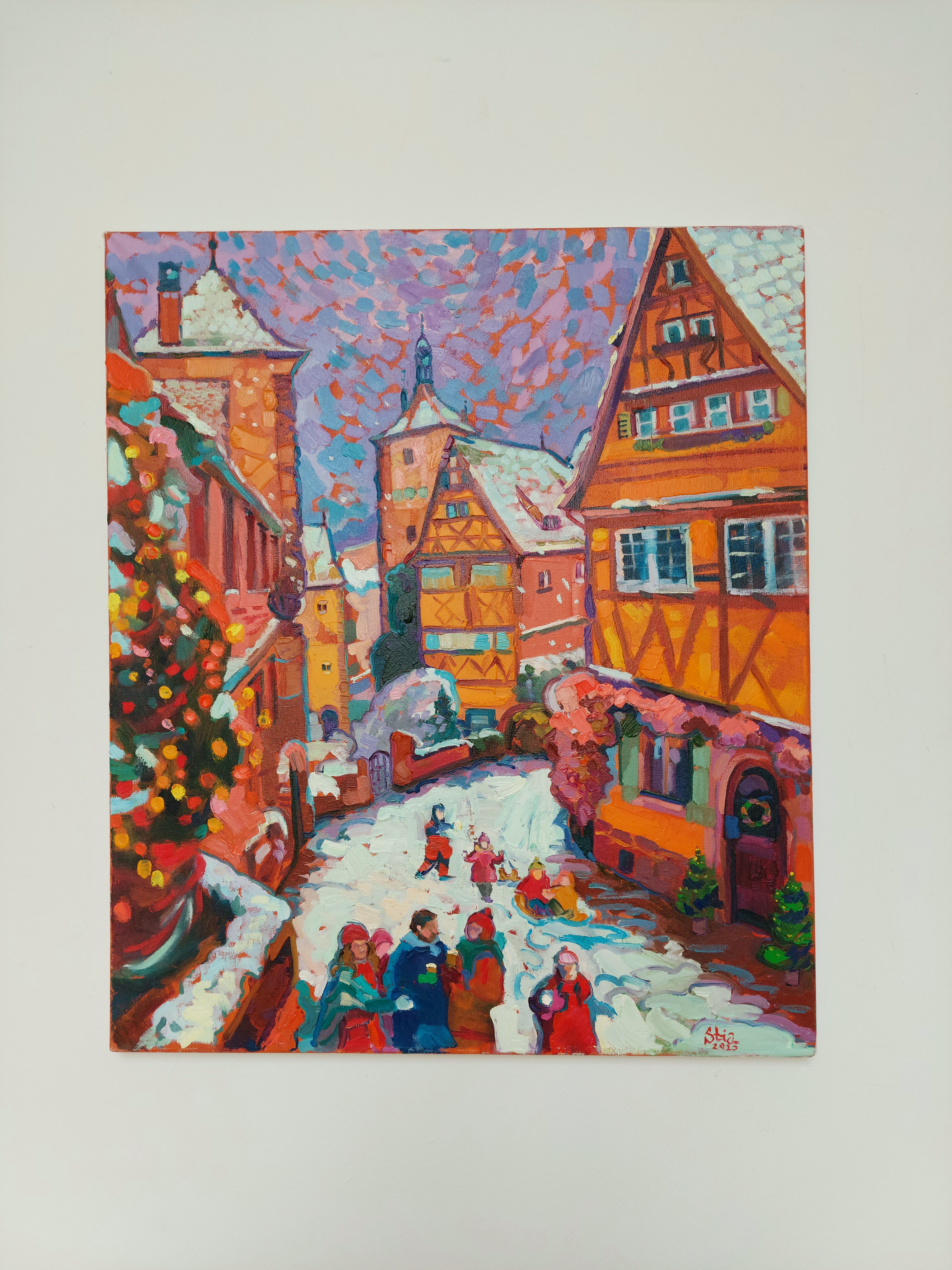Wejdź w baśniowy świat ośnieżonego niemieckiego miasteczka dzięki temu urzekającemu obrazowi neoimpresjonistycznemu zatytułowanemu „Snow Fight”. Dzieło ukazuje pełną życia scenę beztroskiej bitwy na śnieżki w urokliwej niemieckiej wiosce, ozdobionej świątecznymi dekoracjami i migoczącymi światełkami. Na tle pokrytych śniegiem domów i oszronionych drzew obraz emanuje ciepłem i radością. Charakterystyczne pociągnięcia pędzla oraz żywe kolory typowe dla stylu neoimpresjonistycznego nadają scenie energii i ruchu, sprawiając, że każda postać i każdy płatek śniegu ożywają. To idealny wybór dla osób, które cenią magię świątecznego czasu i radość dziecięcych wspomnień — obraz będzie wyjątkowym dodatkiem do każdej kolekcji sztuki. Zanurz się w zimowej zabawie i poczuj świąteczny nastrój dzięki „Snow Fight”. Tworzę swoje obrazy, używając wysokiej jakości farb (Rembrandt, Van Gogh, Winsor Renesans, Cobra), które pozwalają zachować ich doskonały stan przez 100 lat lub dłużej.
