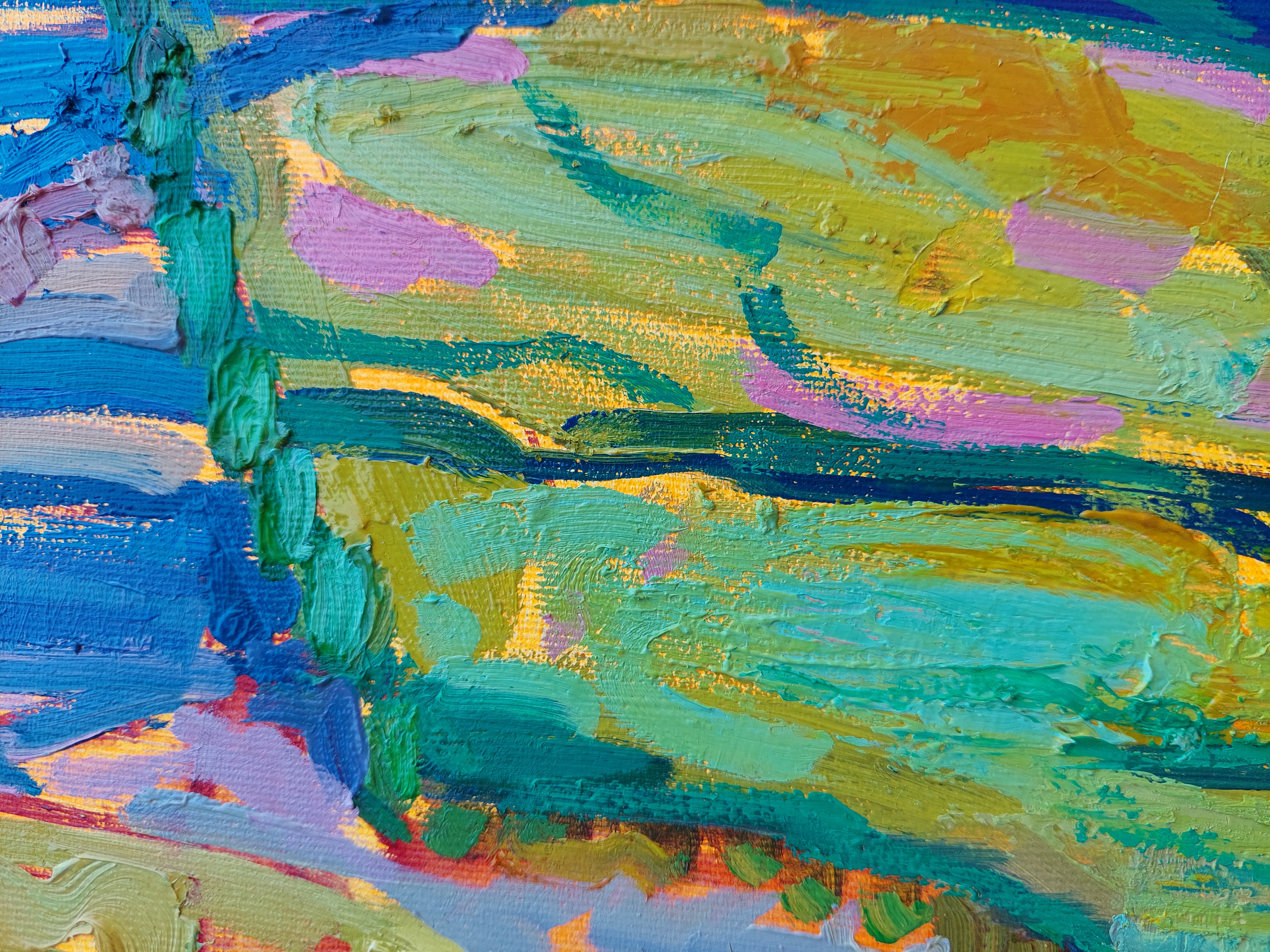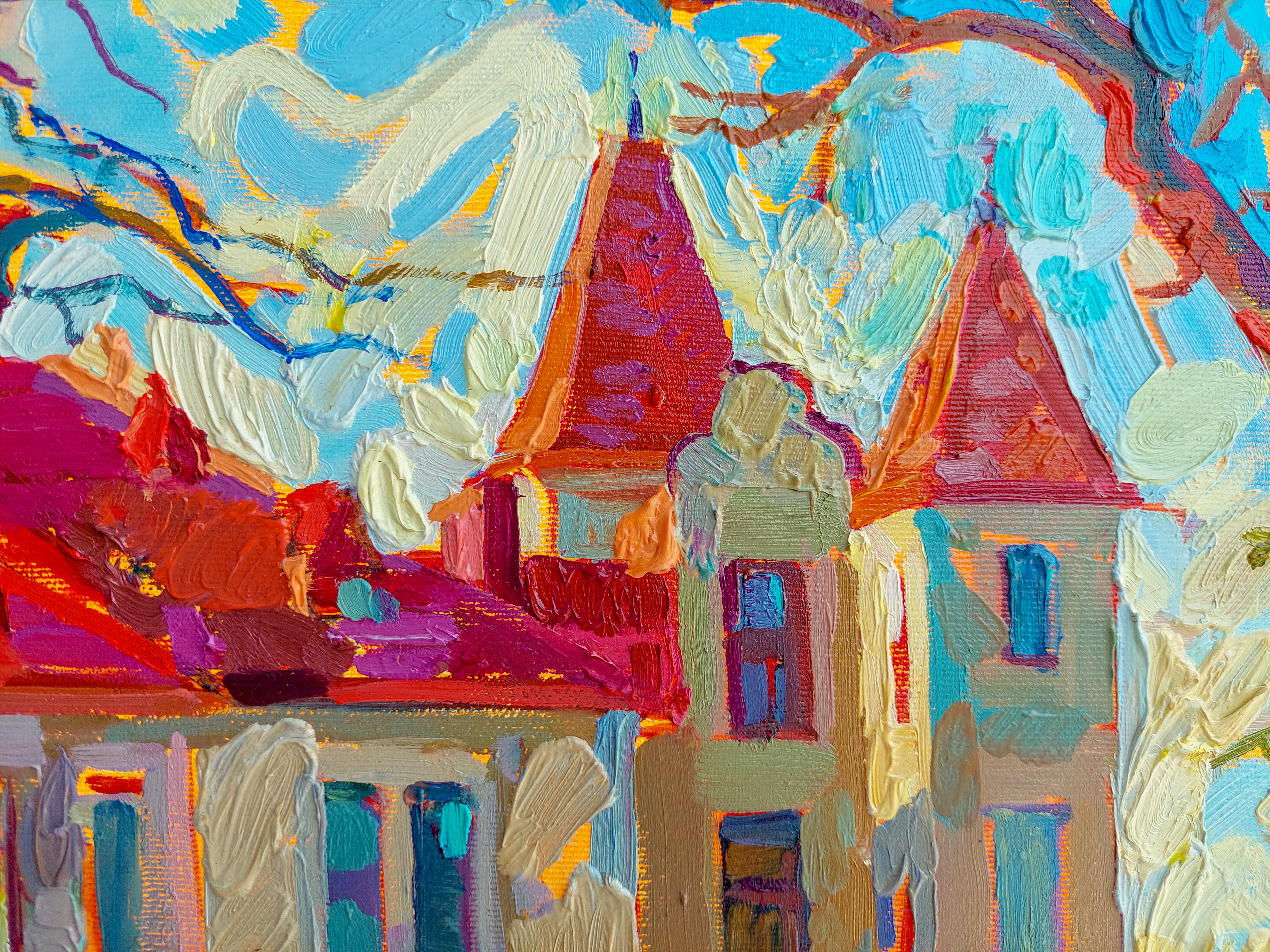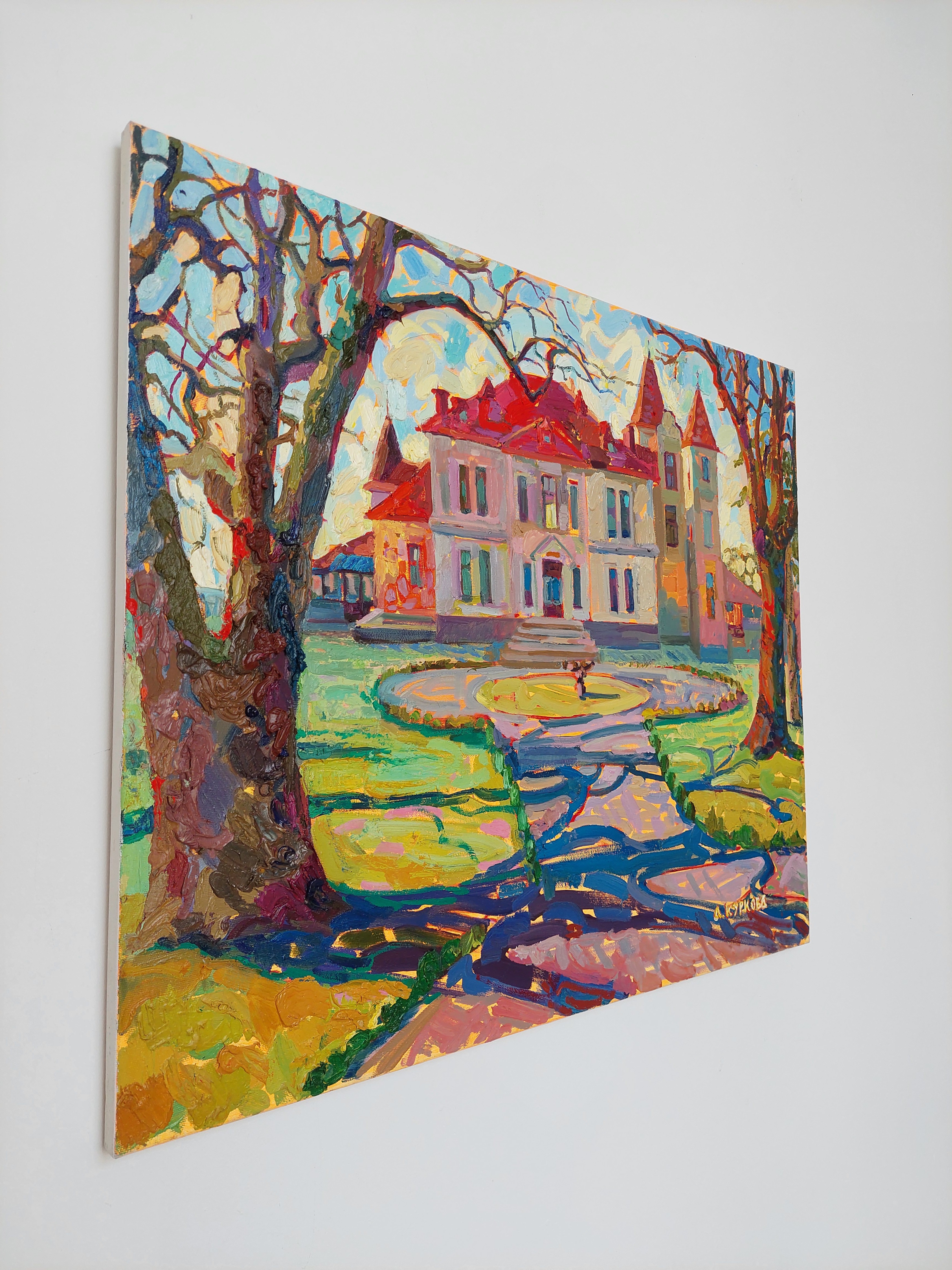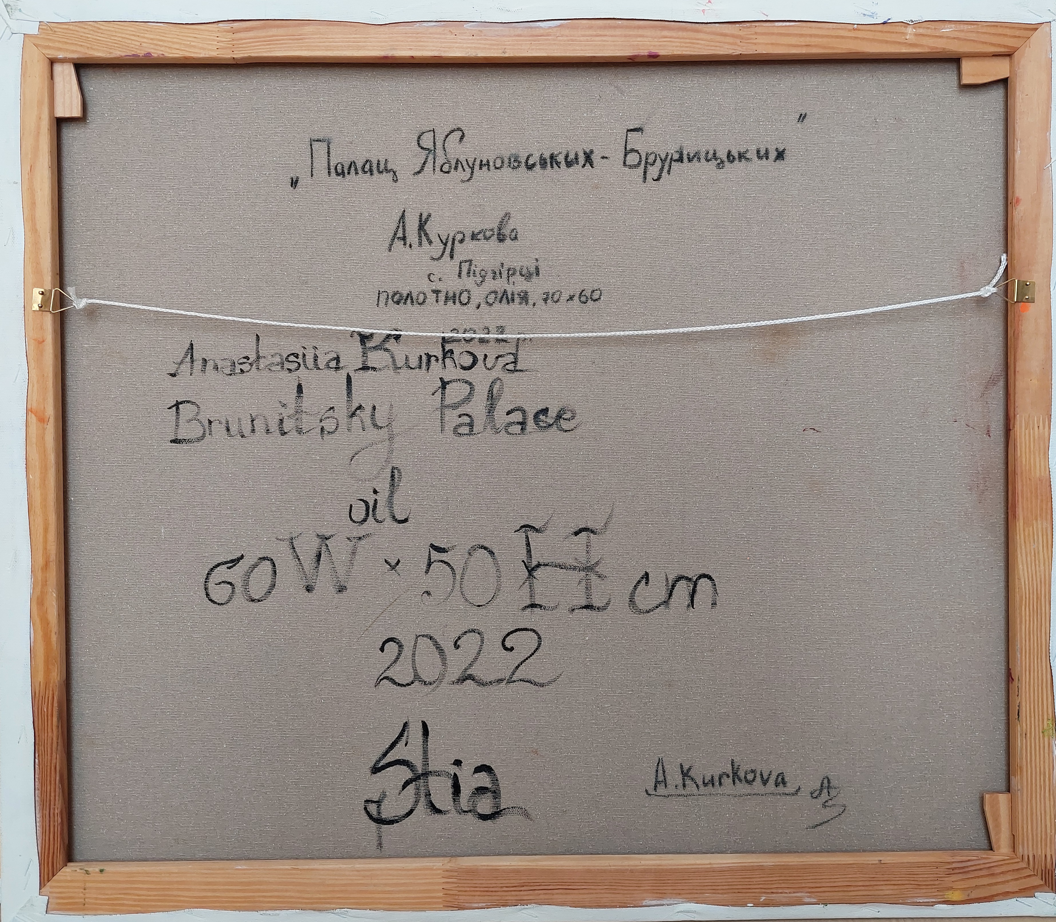 Obraz stworzyłam w plenerze, w pierwszych miesiącach wojny, starając się uchwycić niezmienne piękno dawnej ukraińskiej architektury. Mimo trudności, z jakimi mierzy się Ukraina, moją intencją było podkreślenie wspaniałości historycznego Pałacu Brunytskich w powiecie stryjskim. Początki pałacu nie są do końca znane, ale wiadomo, że w XVII wieku polski król Jan Sobieski korzystał z niego podczas polowań i przyjmowania gości. W geście wdzięczności za uratowanie życia Sobieski podarował później majątek szlachcicowi Pecharowi. Na początku XVIII wieku posiadłość nabył Józef Jabłonowski, a po nim kolejni właściciele, aż w 1817 roku pałac zakupił Józef Brunytskyi. W tamtym czasie budowla była już niemal w ruinie, jednak nowi właściciele ocalili to, co pozostało, dodając dwa skrzydła z wieżami i przeprojektowując park. Za czasów Brunytskich pałac został bogato udekorowany — ściany pokrywały ozdobne tapety, wnętrza zdobiły obrazy, rzeźby i kandelabry. Legenda głosi, że w centralnym salonie zamiast sufitu znajdowało się ogromne akwarium. Na terenie posiadłości mieściła się również biblioteka z ponad tysiącem woluminów i materiałów archiwalnych, a także piwnice winne i labirynt podziemnych przejść.
