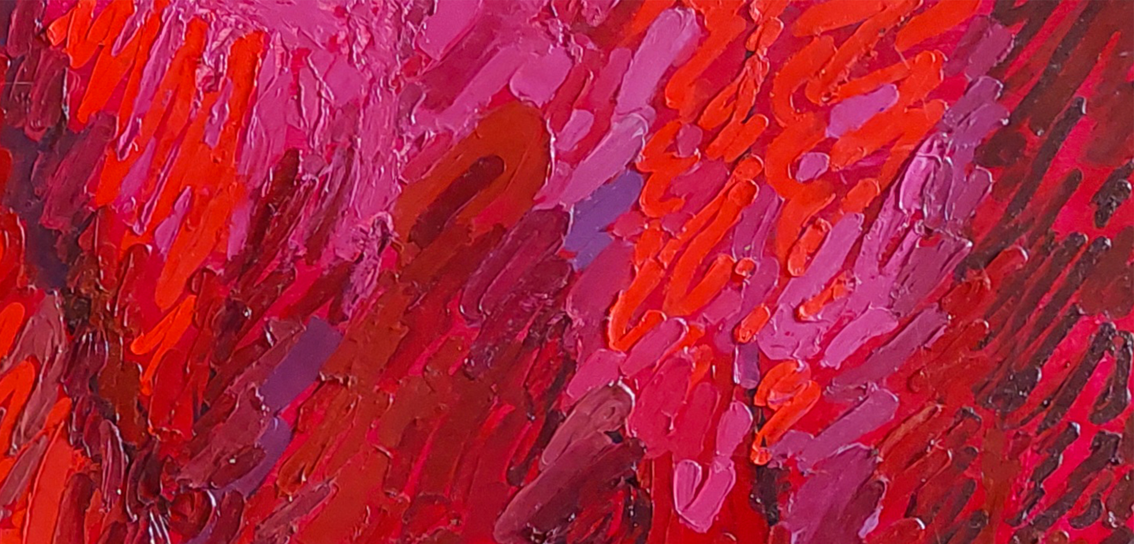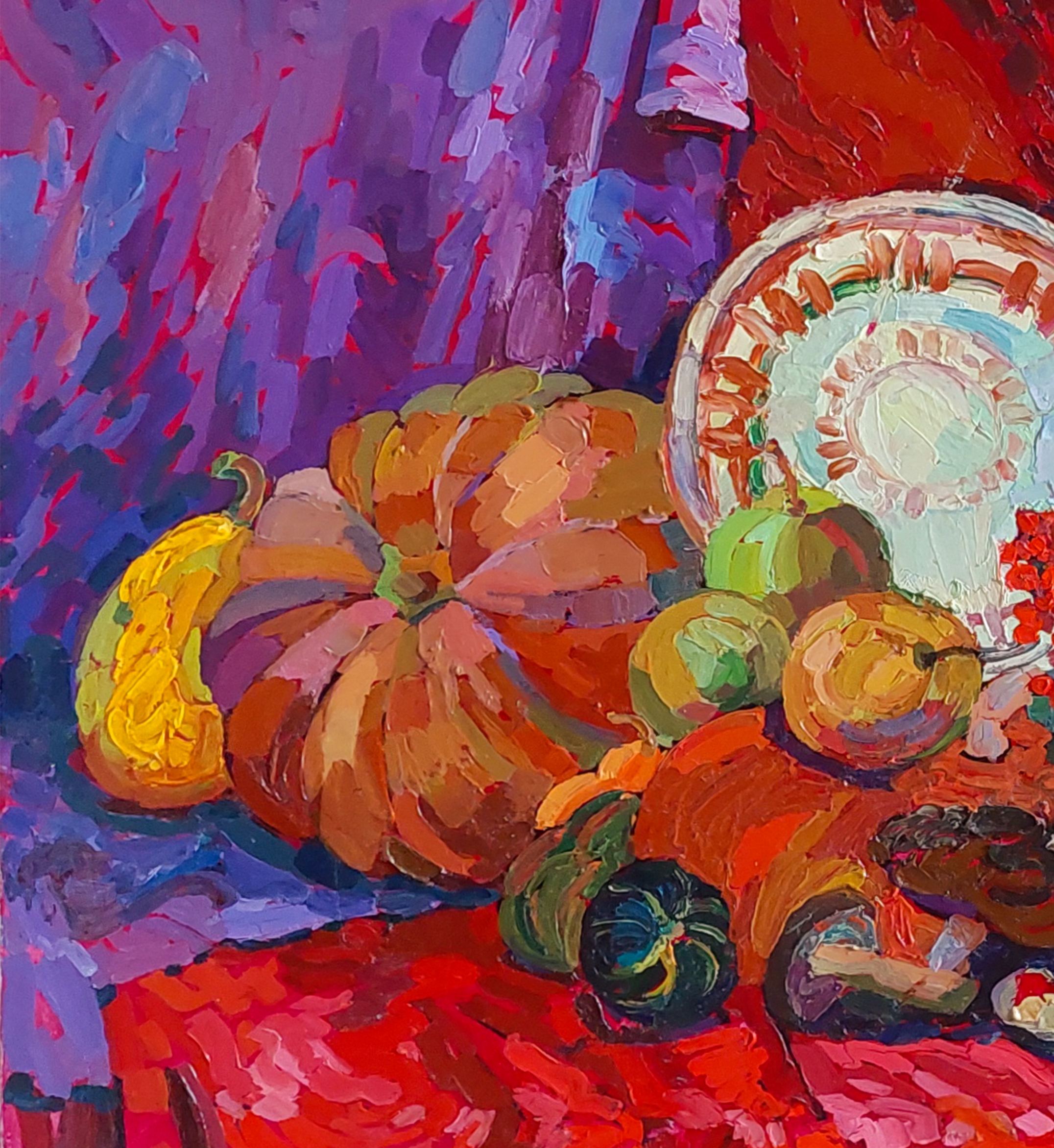 Obraz przedstawia żywą jesienną martwą naturę. Na bogato czerwonej draperii ożywają różne elementy. Widać dynie w różnych rozmiarach i kolorach, które dominują w kompozycji. Ich zaokrąglone formy tworzą wrażenie obfitości i jesiennych plonów. Na środku znajduje się talerz z misternym wzorem. Kontrast między ciepłą czerwienią a chłodnym błękitem dodaje pracy wyrazistości. Zastosowanie intensywnych kolorów i dynamicznych pociągnięć pędzla sprawia, że ta martwa natura jest żywa i przyciągająca uwagę.
