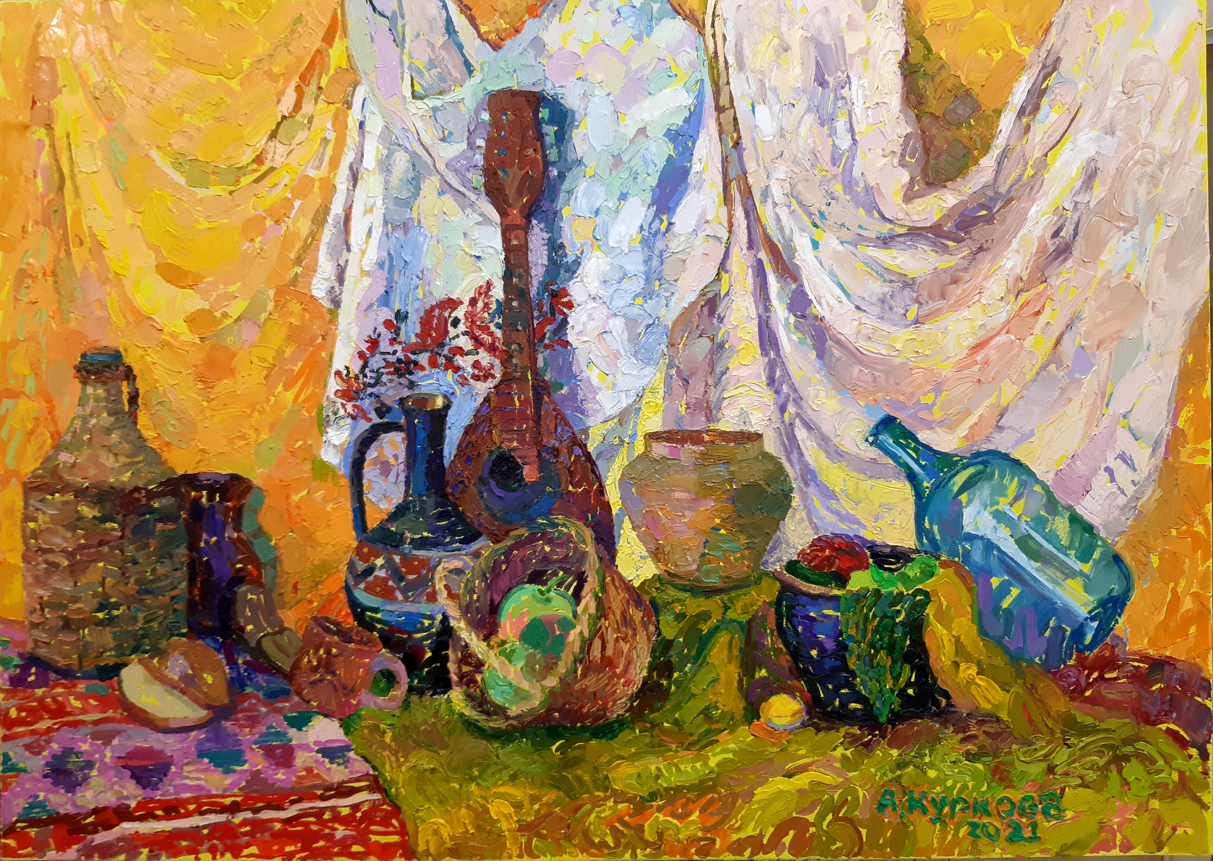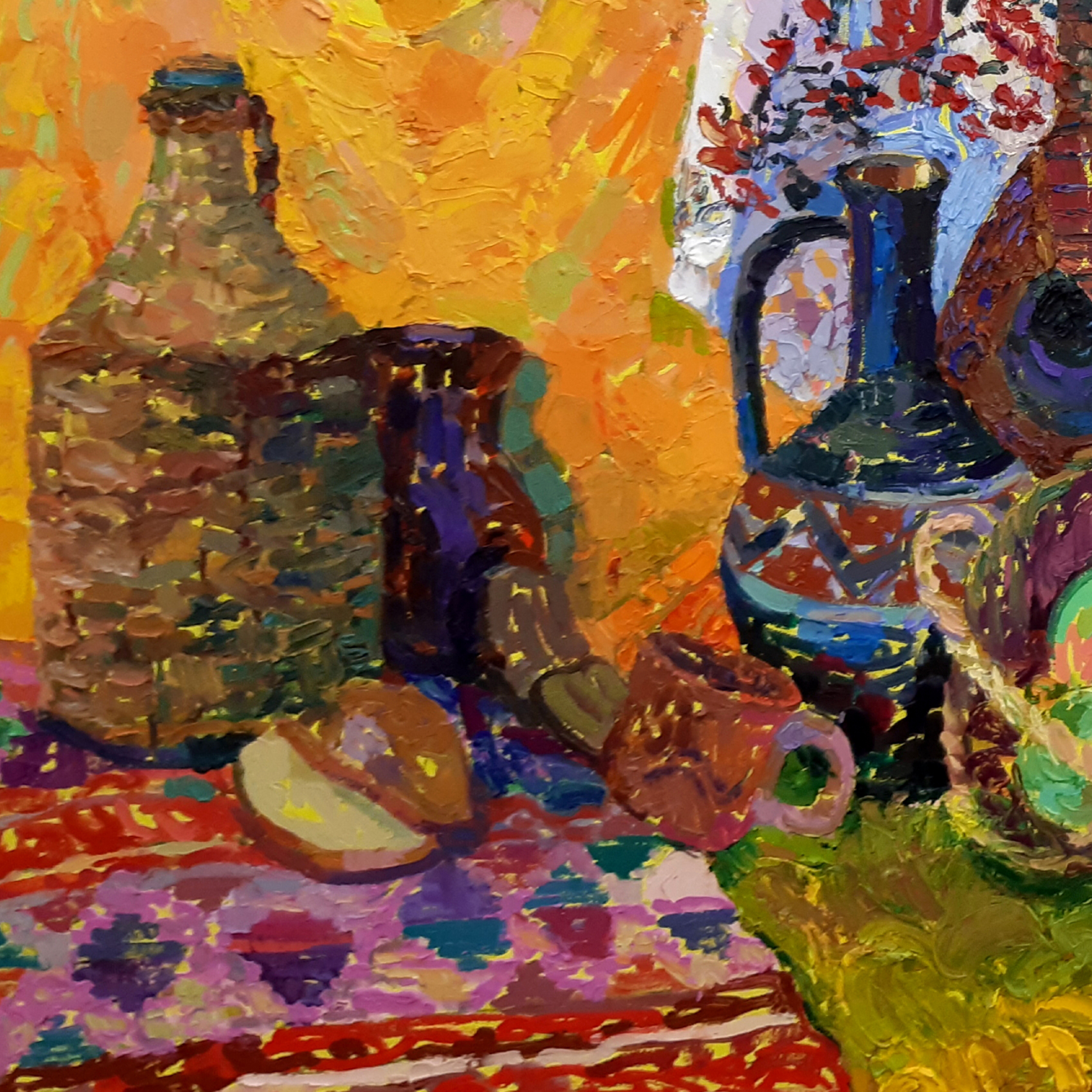 Obraz ta urzekająca martwa natura, utrzymana w żywym stylu impresjonizmu, zaprasza widza do świata, w którym kolor i faktura splatają się ze sobą. W centrum kompozycji znajdują się misternie zdobione ukraińskie ręczniki i dzbany. Ich wzory, nawiązujące do dziedzictwa przodków, opowiadają historie o odporności i wspólnych wspomnieniach. Jednak „Harmonia Ornamentów” wykracza poza same przedmioty. Szepcze o rodzinnych spotkaniach, wspólnych posiłkach i ponadczasowym pięknie kulturowego dziedzictwa. Zestawienie tradycji i innowacji skłania do refleksji — tworzy most między pokoleniami. Stosuję technikę imprimatury, nakładając grube, impastowe pociągnięcia farby. Każdy ruch pędzla jest celowy, podkreślając dotykową jakość powierzchni. Metoda malowania pastowego, z obfitą ilością pigmentu, nadaje kompozycji głębię i wyrazistość. Kolory zdają się wyskakiwać z płótna, celebrując żywiołowość życia. Światło słoneczne tańczy po scenie, rzucając delikatne cienie na krągłościach dzbanów i misternych wzorach ręczników. Gra światła przywołuje ciepło i nostalgię.