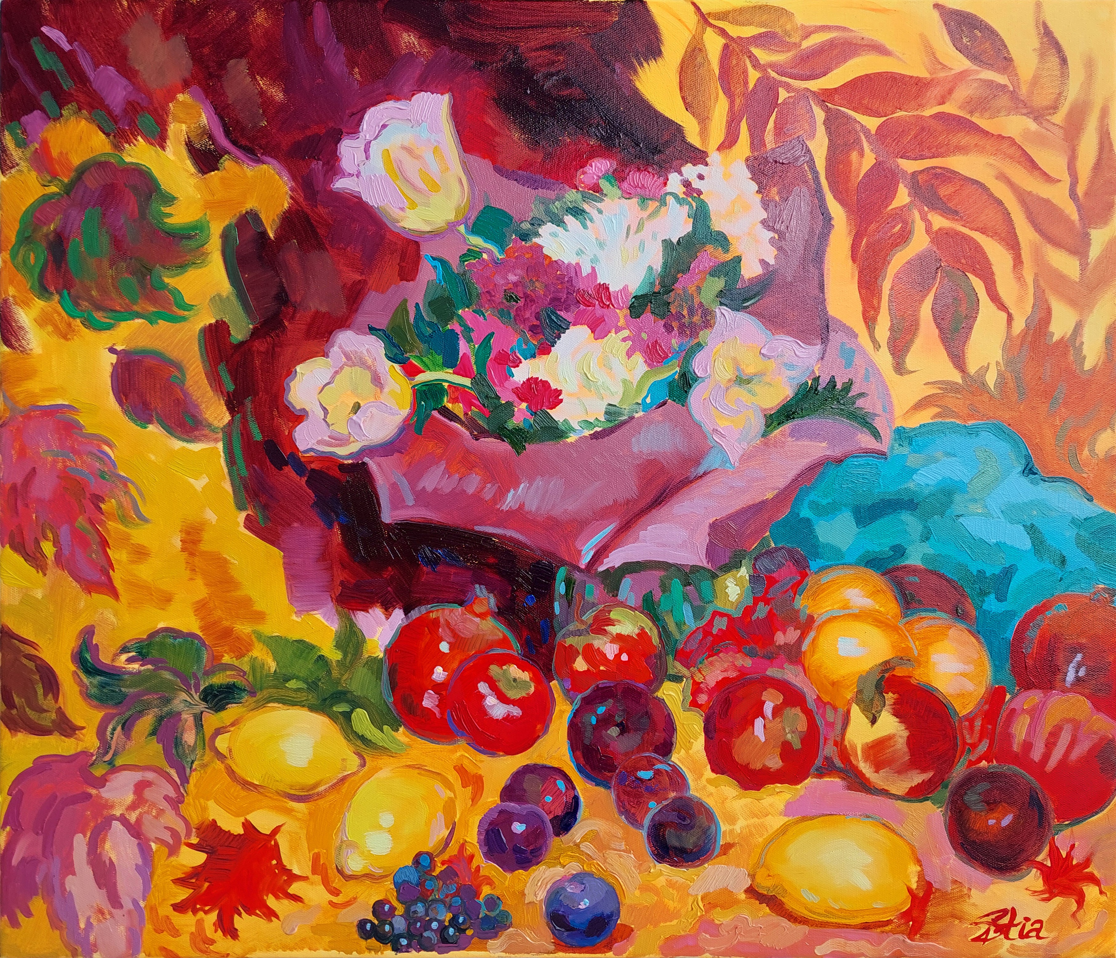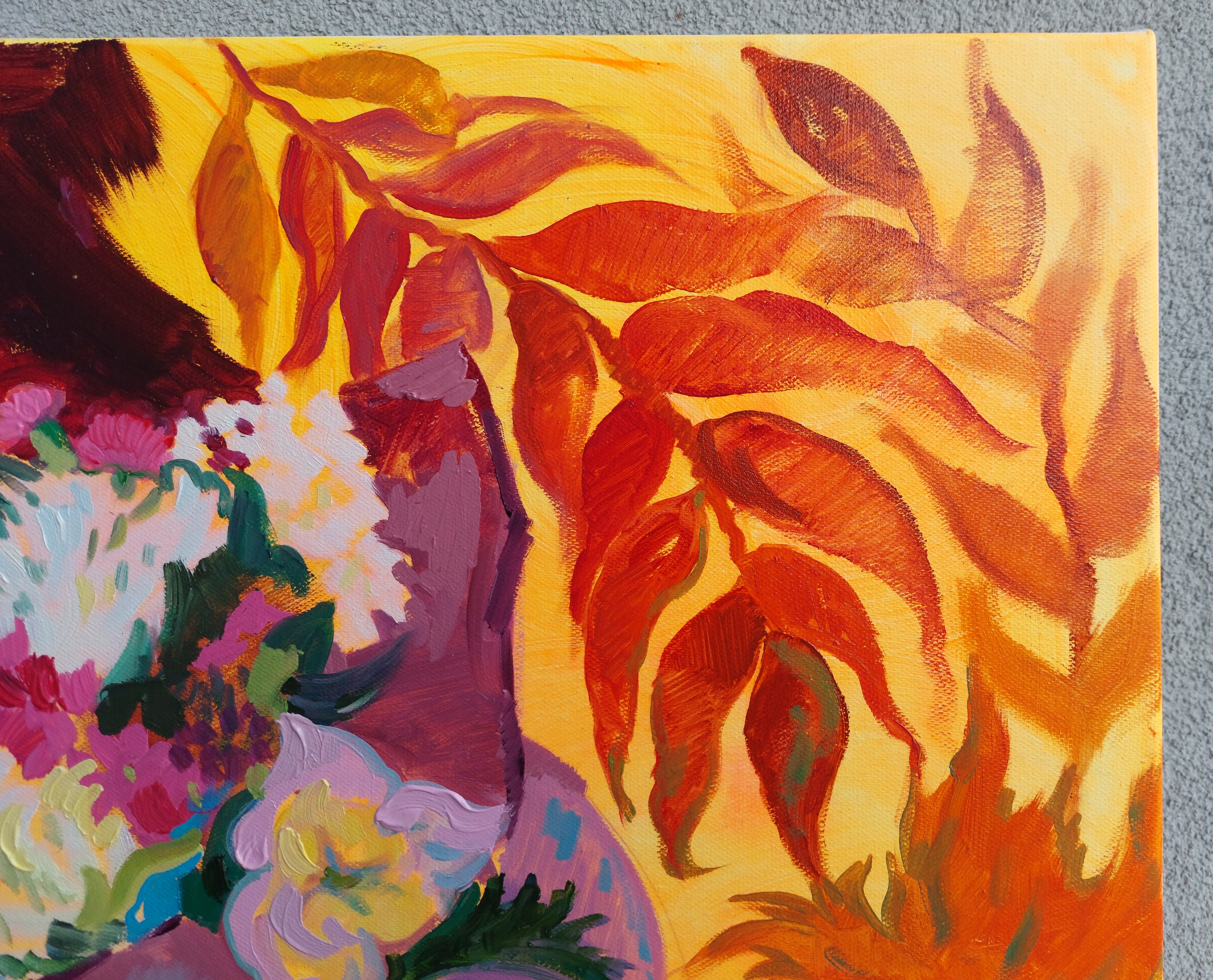 „Czułe ciepło późnego października” to wspomnienie dnia, w którym jesień wciąż dzieliła się swoim złotym światłem. Obraz powstał w jeden z najcieplejszych i najjaśniejszych dni późnego października — z bukietu podarowanego mi w dniu moich urodzin. Zachowuje w sobie czułość, spokój i delikatne ciepło gasnącego jesiennego słońca.