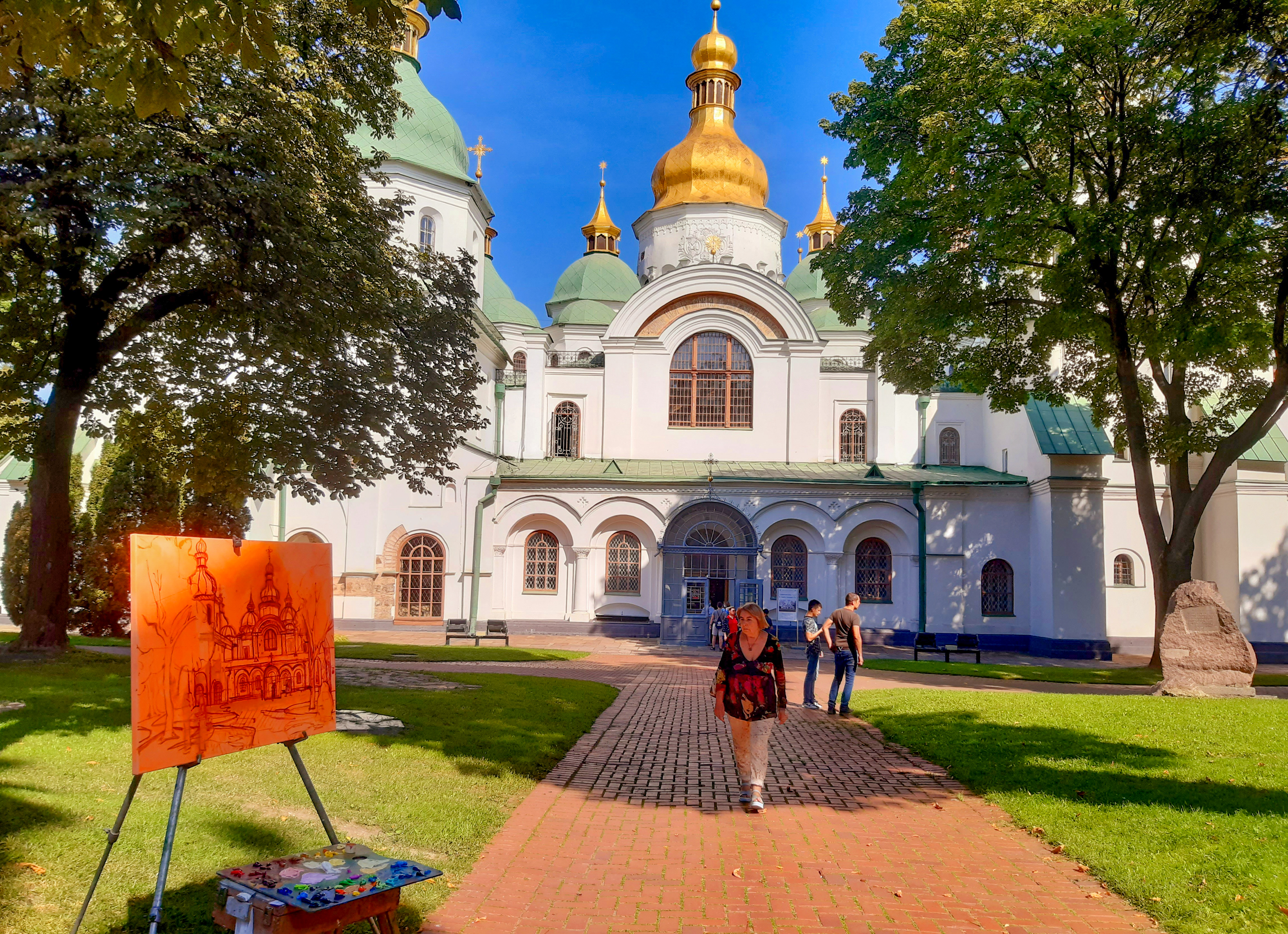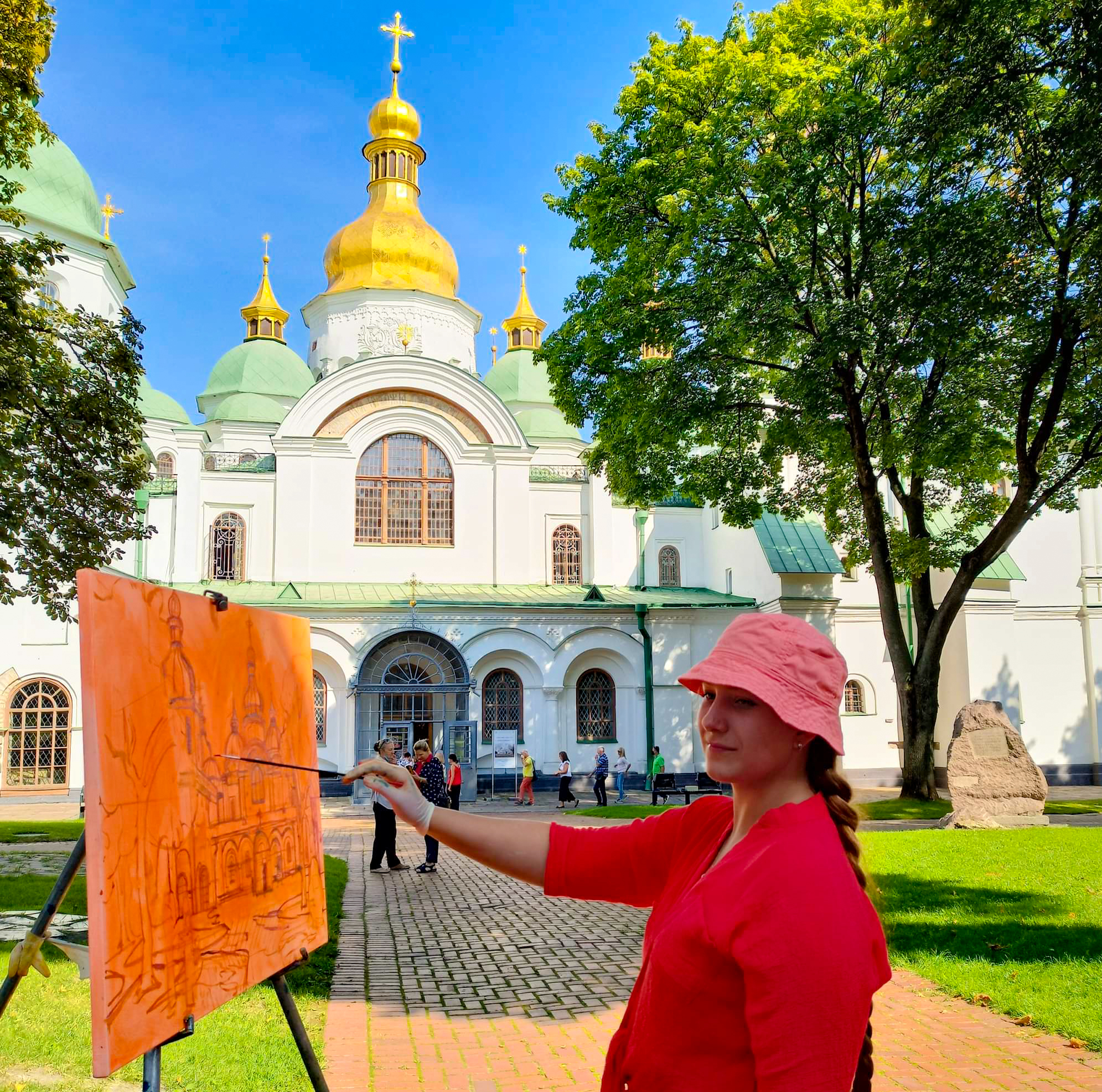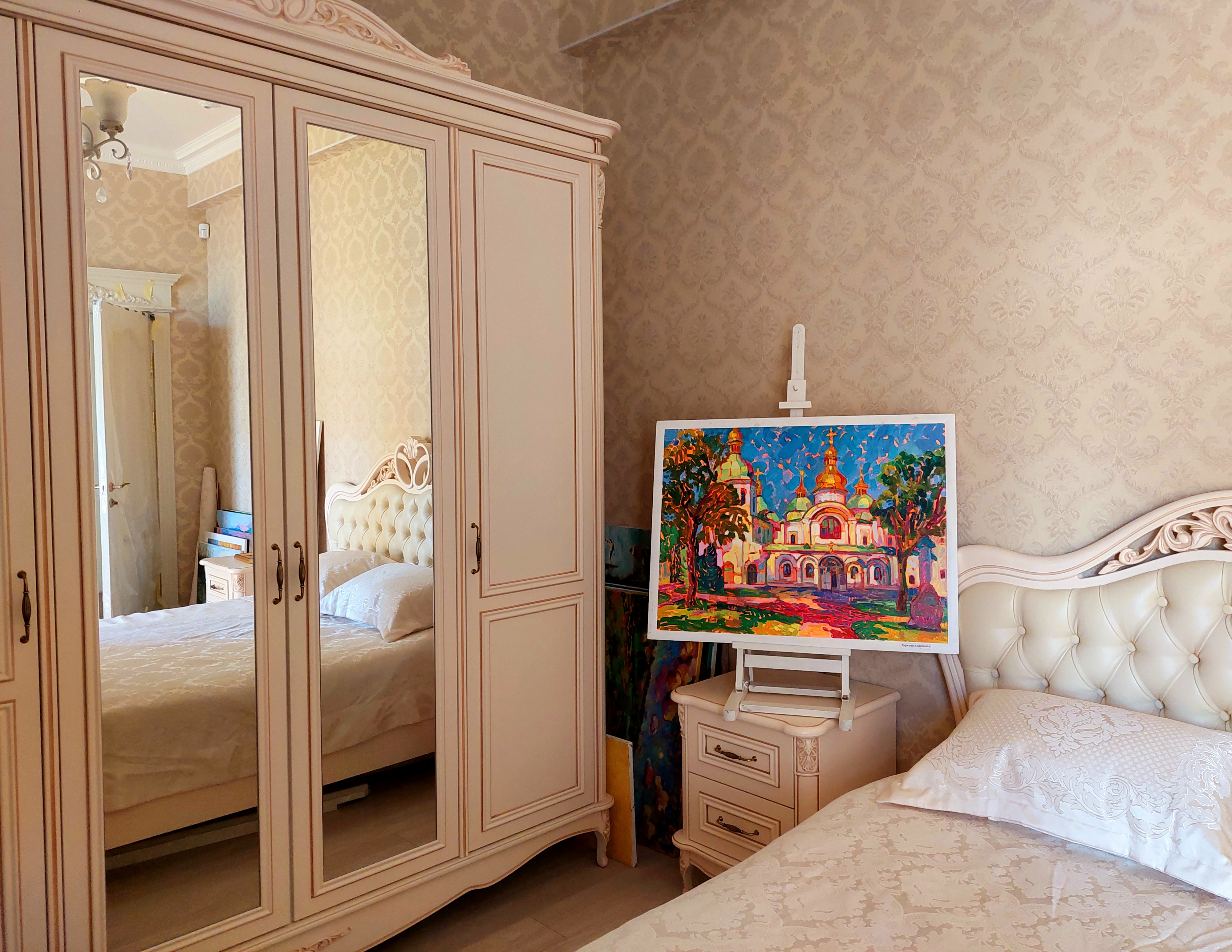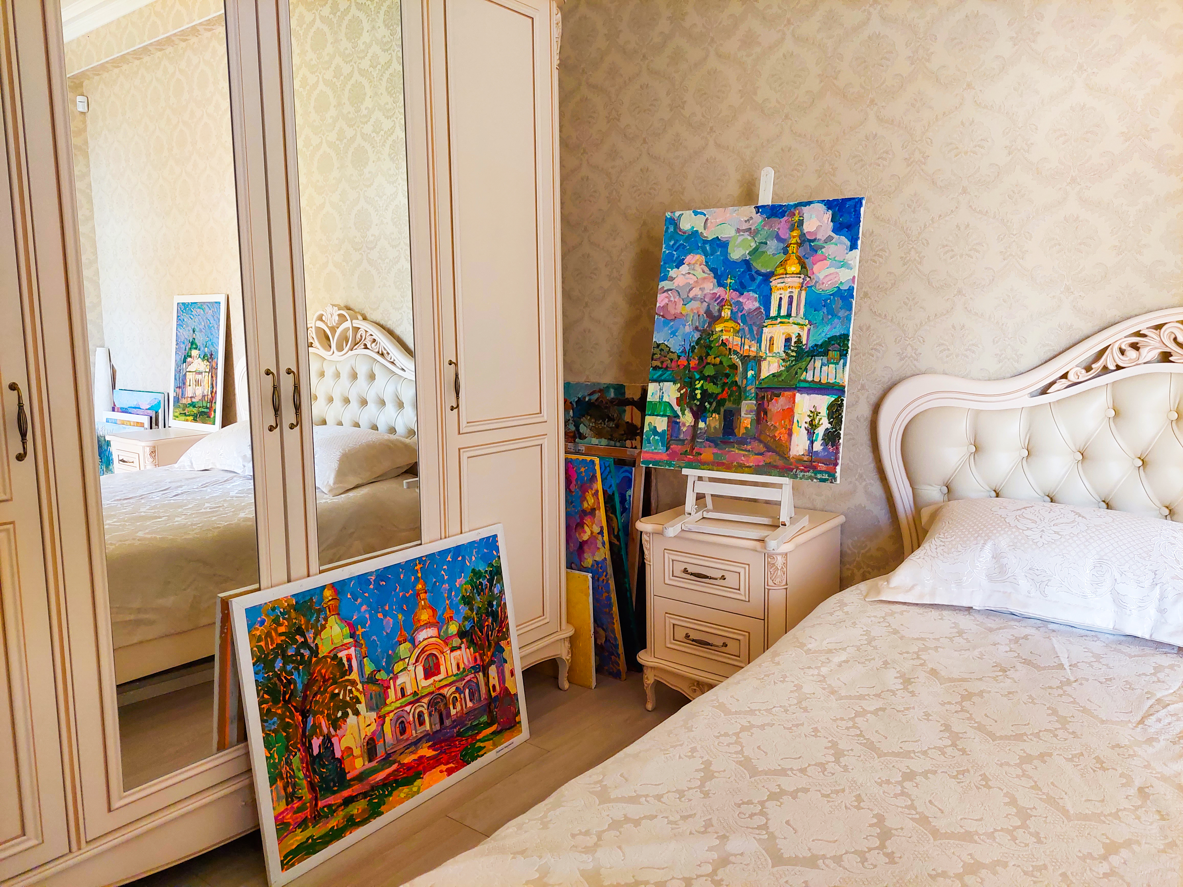 Obraz został stworzony w stylu impresjonistycznym i ukazuje istotę Soboru Mądrości Bożej w Kijowie. Namalowałam go podczas corocznego pleneru „Sofia Plein Air 2021”, który odbywa się w samym sercu Kijowa. Ten architektoniczny cud jest świadectwem bogatej historii Rusi Kijowskiej. Sobór Mądrości Bożej w Kijowie to wspaniałe arcydzieło architektury i sztuki XI wieku, światowej sławy zabytek, który pozostawił niezatarty ślad w historii i kulturze Ukrainy. Nazwa „Sofia” pochodzi od greckiego słowa sophia, oznaczającego „mądrość”. Świątynia nie jest poświęcona konkretnej świętej o imieniu Zofia — symbolizuje ideę Świętej Mądrości. Budowę rozpoczęto w 1037 lub 1011 roku, a ukończenie zajęło około dwóch dekad. Książę Jarosław Mądry ufundował sobór, aby upamiętnić swoje decydujące zwycięstwo nad koczowniczymi Pieczyngami w 1036 roku, które doprowadziło do ich ostatecznego upadku jako zagrożenia dla Kijowa. Kopuła świątyni, wznosząca się na imponującą wysokość 28,6 metra, dodatkowo podkreśla jej monumentalny charakter. Dziedzictwo Jarosława Mądrego obejmuje również założenie pierwszej znanej biblioteki na Rusi Kijowskiej, mieszczącej się na terenie soboru. Dziś Sobór Mądrości Bożej jest częścią Narodowego Rezerwatu „Sofia Kijowska”, który odpowiada za ochronę tego historycznego kompleksu oraz innych zabytków na terenie Ukrainy. Pomimo współczesnych wyzwań, w tym rosyjskiej inwazji, sobór pozostaje symbolem odporności i kulturowej tożsamości. Obraz był prezentowany w rezerwacie „Sofia Kijowska” i zdobył uznanie w licznych konkursach — zarówno ogólnoukraińskich, jak i międzynarodowych.