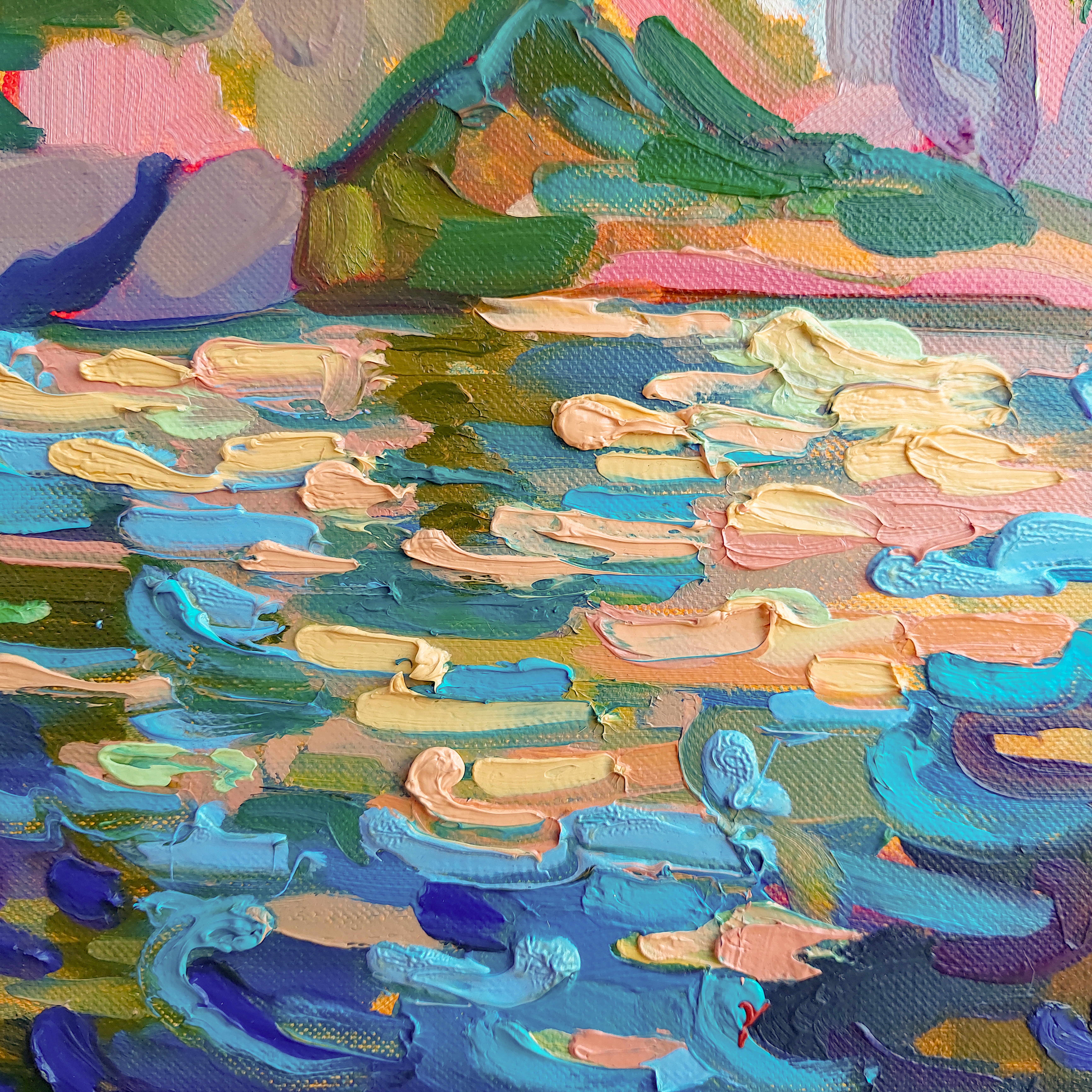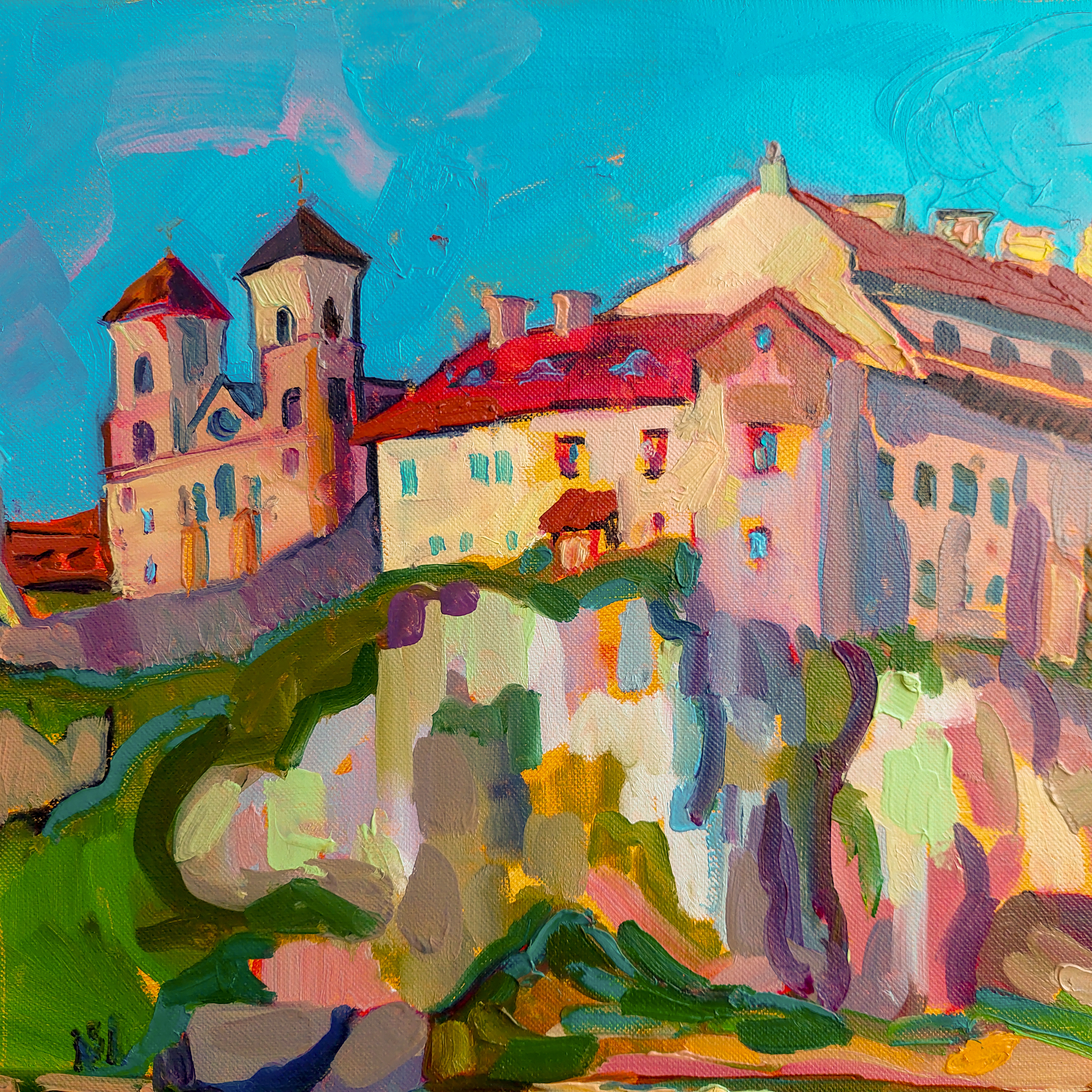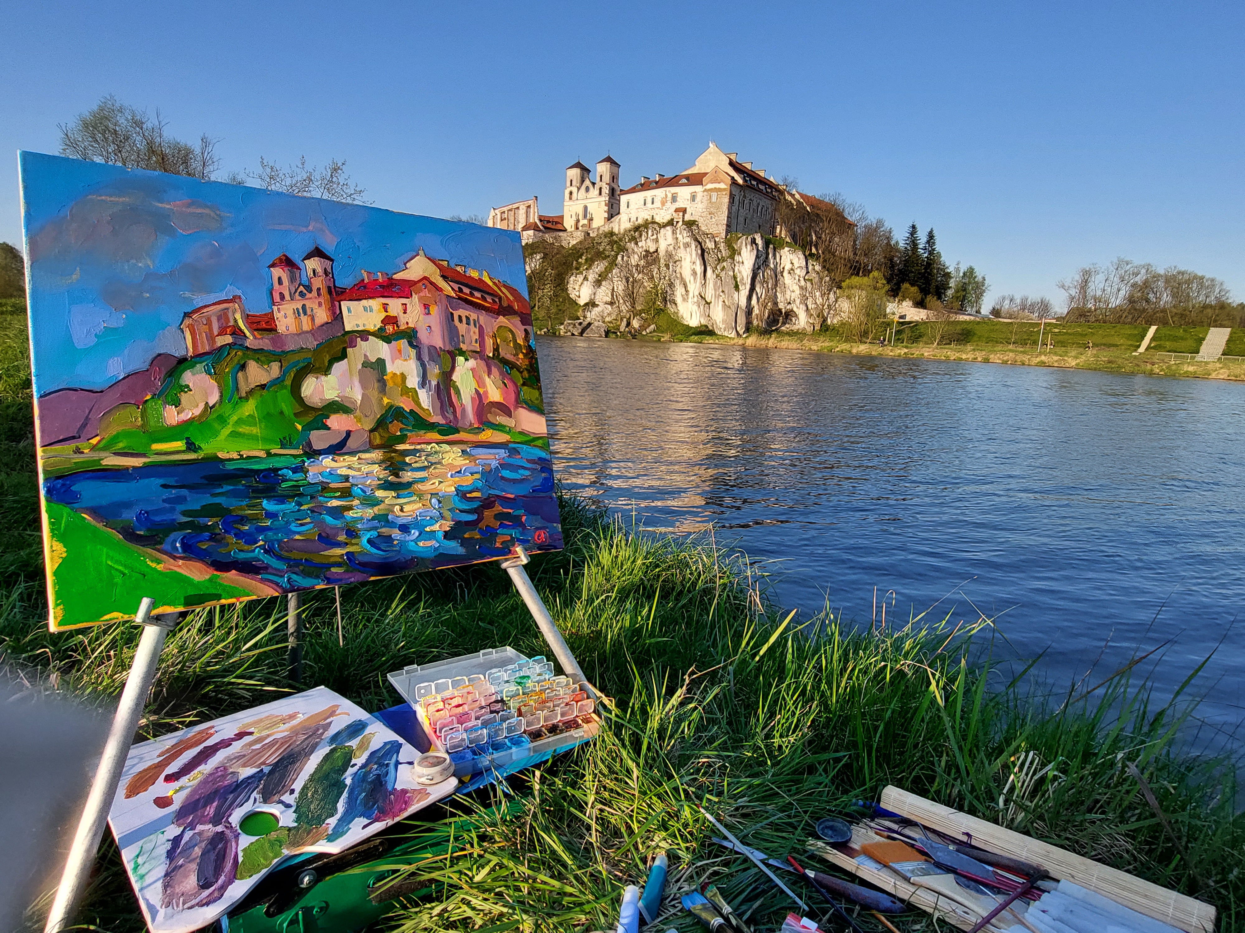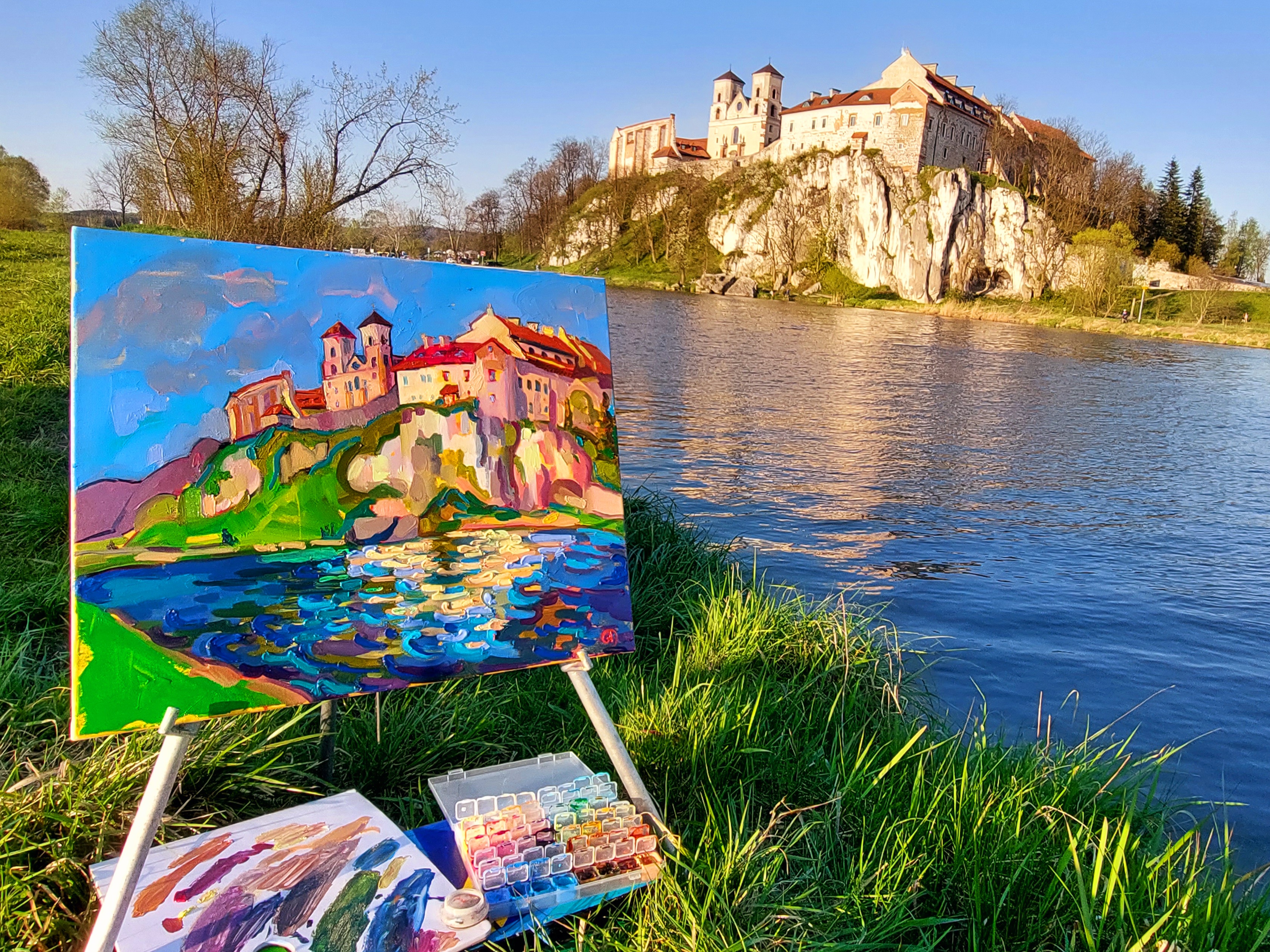 „Benedyktyńskie Opactwo” to drugi obraz z nastrojowego cyklu malowanego w okolicach Krakowa, ukazującego spokojny urok przeciwległego brzegu Wisły. Ta akrylowa praca celebruje majestatyczną sylwetkę historycznego opactwa benedyktynów, malowniczo usytuowanego na skalistym wzgórzu.Z charakterystycznymi czerwonymi dachami i bliźniaczymi wieżami opactwo jawi się jako ponadczasowy symbol elegancji i dziedzictwa. Zanurzone w harmonijnej grze żywych kolorów i światła, ukazuje piękno architektury w pełnej okazałości. Spokojne odbicie w tafli rzeki nadaje kompozycji oniryczny charakter, zapraszając widza do kontemplacji i wyciszenia. Dzieło łączy w sobie bogactwo kulturowe z malarską harmonią, czyniąc je wyrafinowanym dodatkiem do każdej kolekcji. Idealne dla miłośników europejskich pejzaży, scen architektonicznych oraz spokojnych, malarskich momentów.