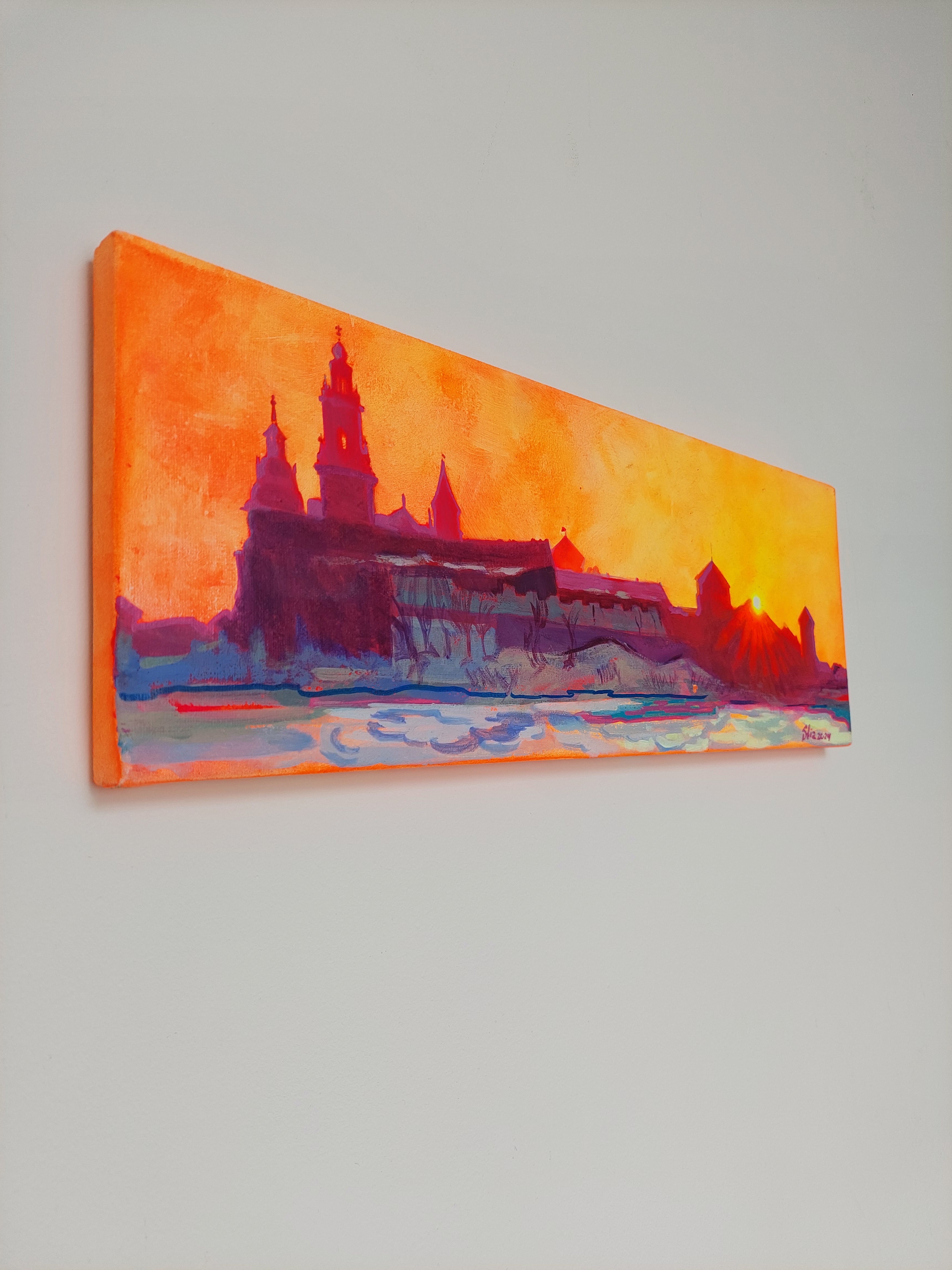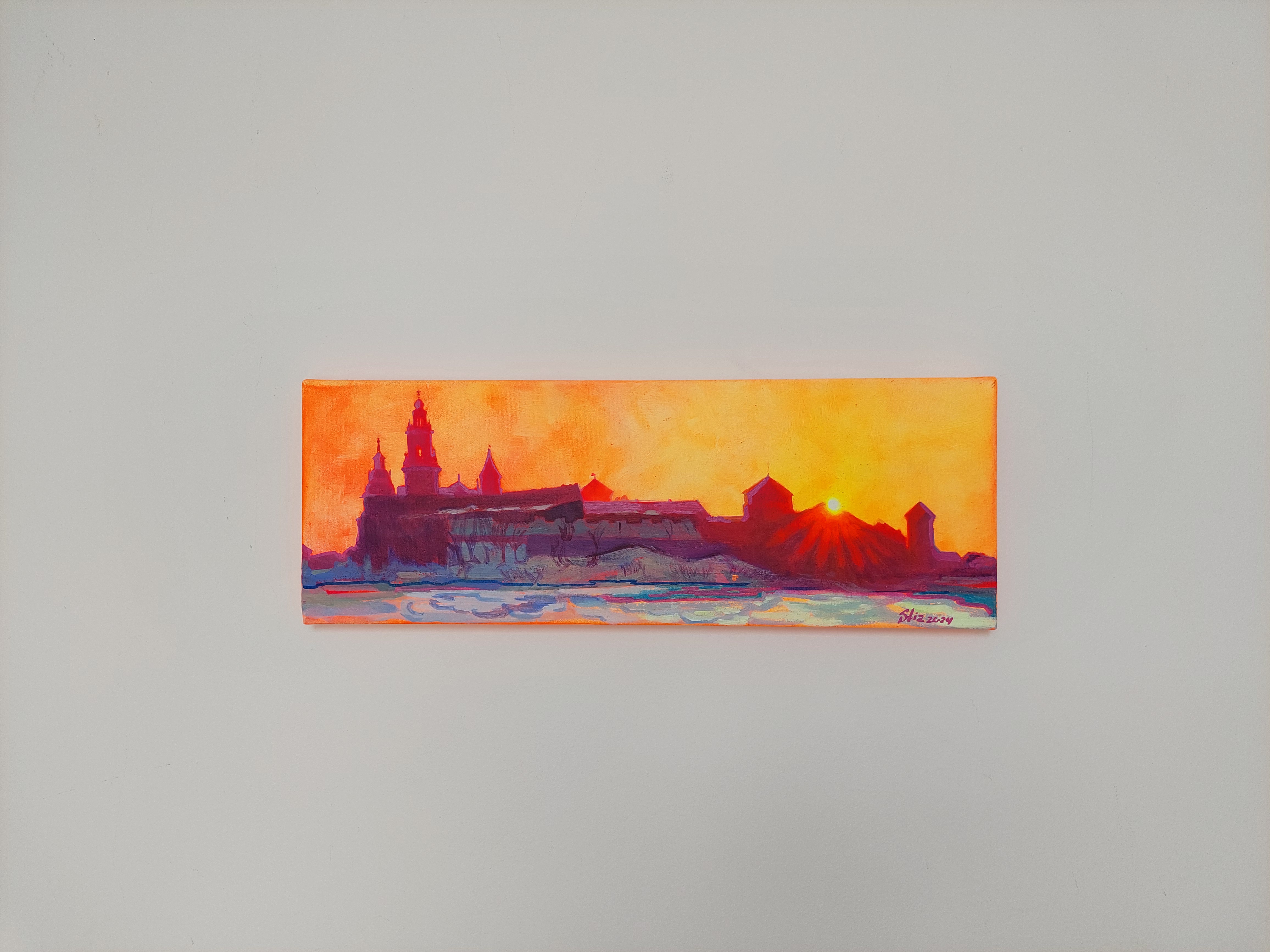 „Sunset Haze” to zapierający dech w piersiach obraz akrylowy, który uchwyca spokojne piękno zimowego zachodu słońca nad majestatycznym Zamkiem Królewskim na Wawelu w Krakowie. To dzieło wyróżnia się jako jedna z nielicznych prac artystki wykonanych w całości farbami akrylowymi, ukazując zarówno biegłość techniczną, jak i wyjątkową wrażliwość malarską. Ciepłe, złociste tony zachodzącego słońca harmonijnie łączą się z chłodnymi, zimowymi barwami pejzażu, podkreślając urzekający kontrast natury. Ikoniczna sylwetka Wawelu, wyraźnie zarysowana na tle rozświetlonego nieba, budzi zachwyt i poczucie ponadczasowości. To dzieło jest idealne dla kolekcjonerów sztuki oraz miłośników polskiej kultury — oferuje bowiem żywy, malarski wgląd w krakowski urok. Niech „Sunset Haze” wniesie do Twojej przestrzeni odrobinę ciepła, elegancji i historii.