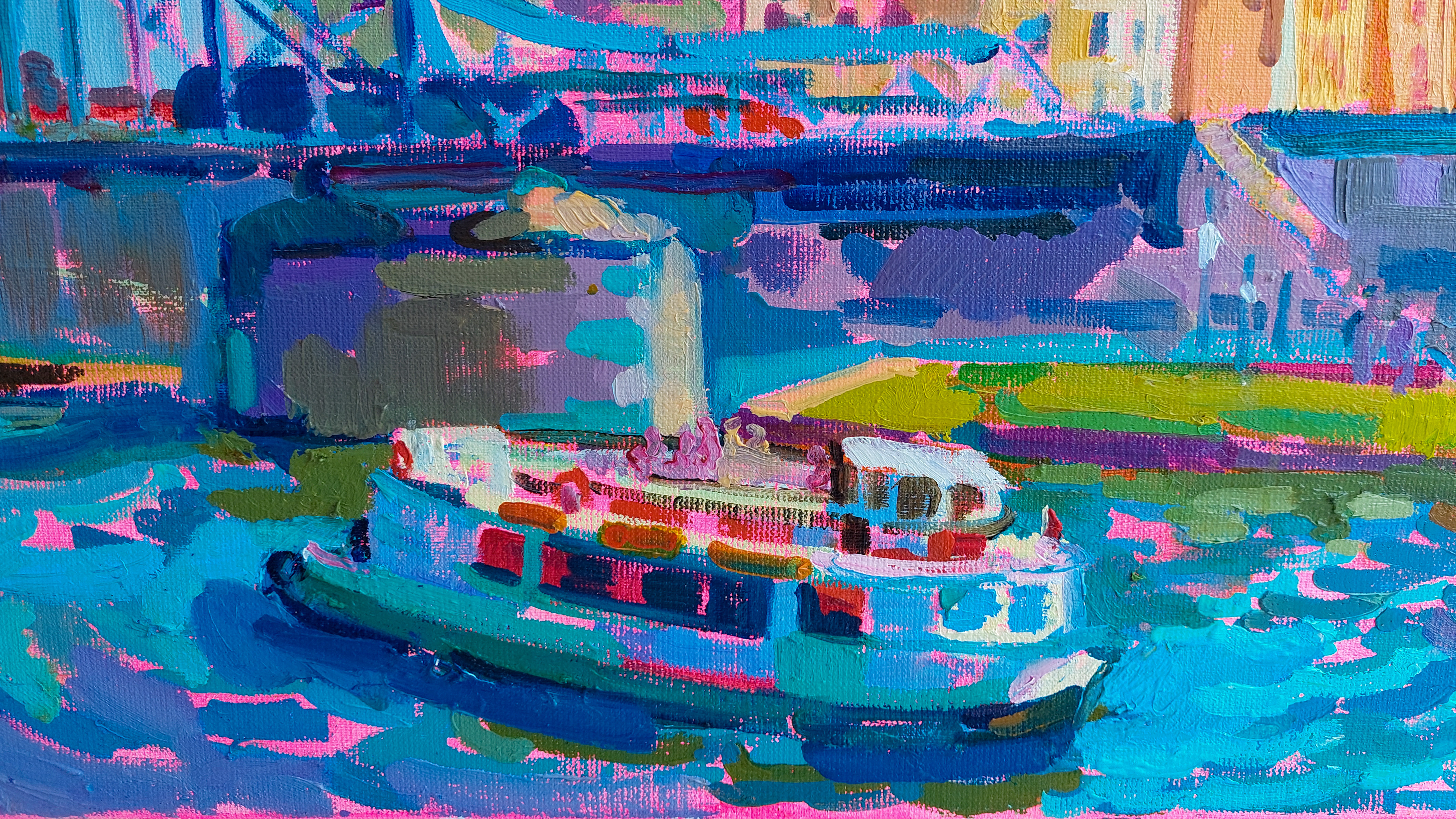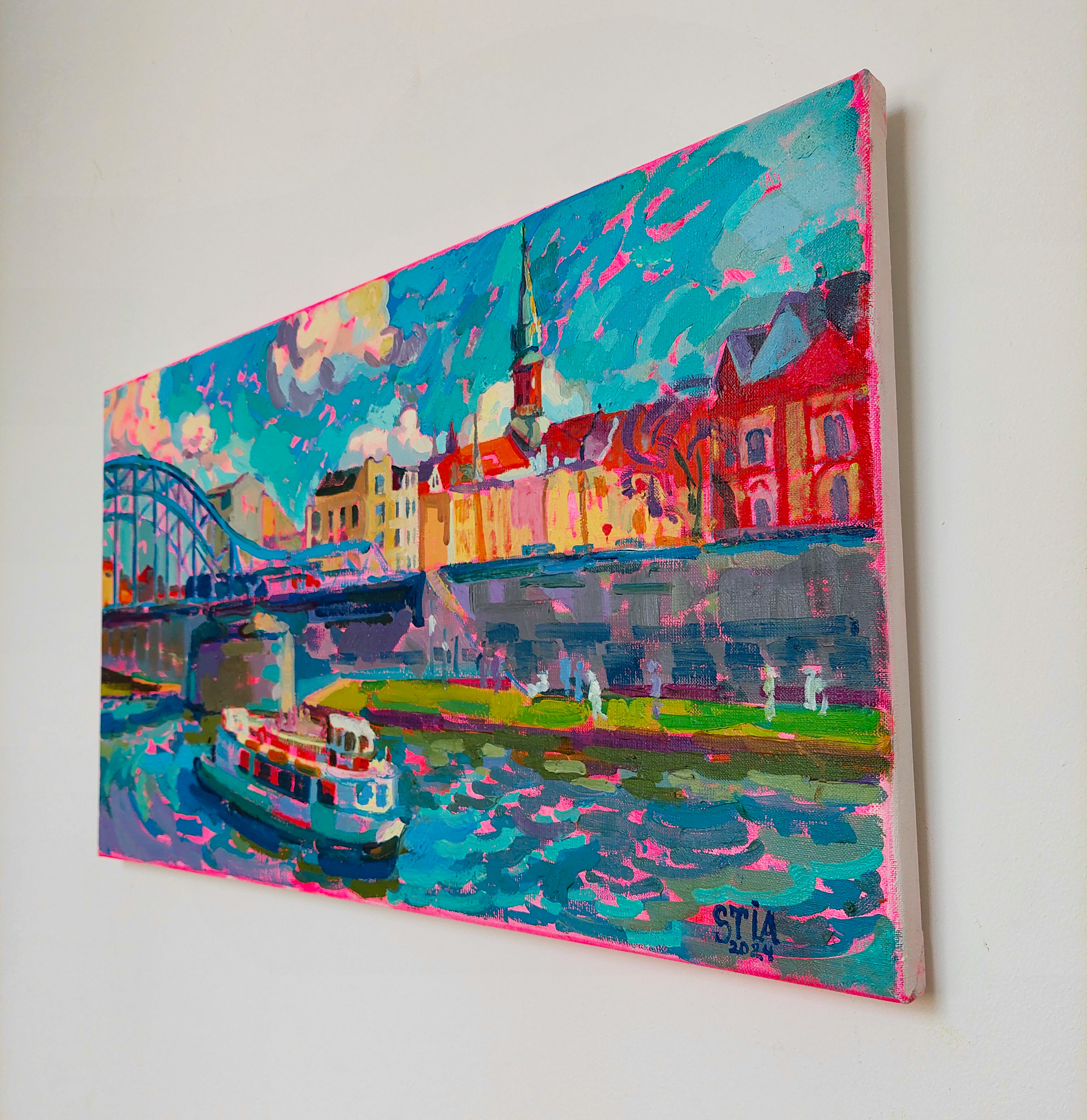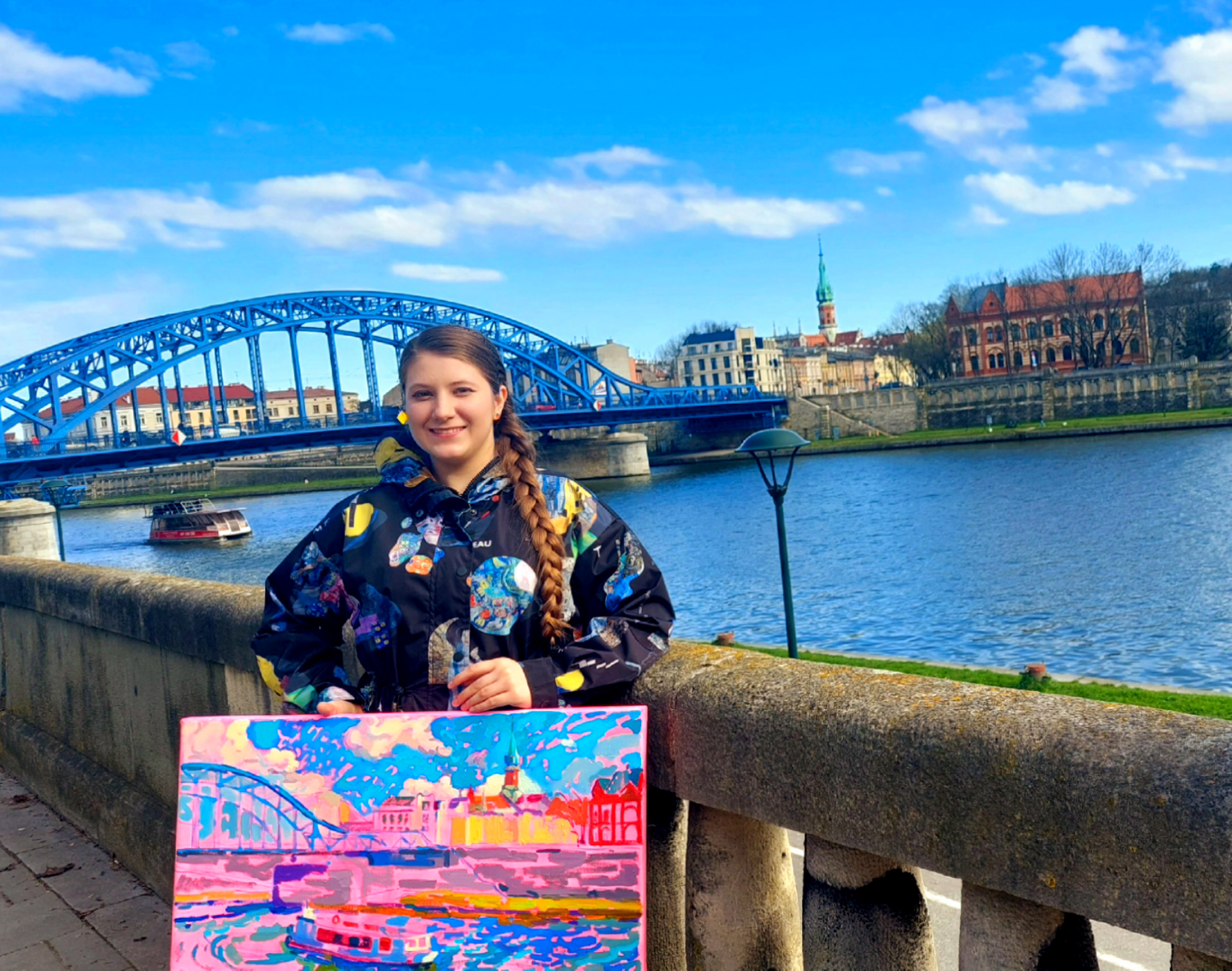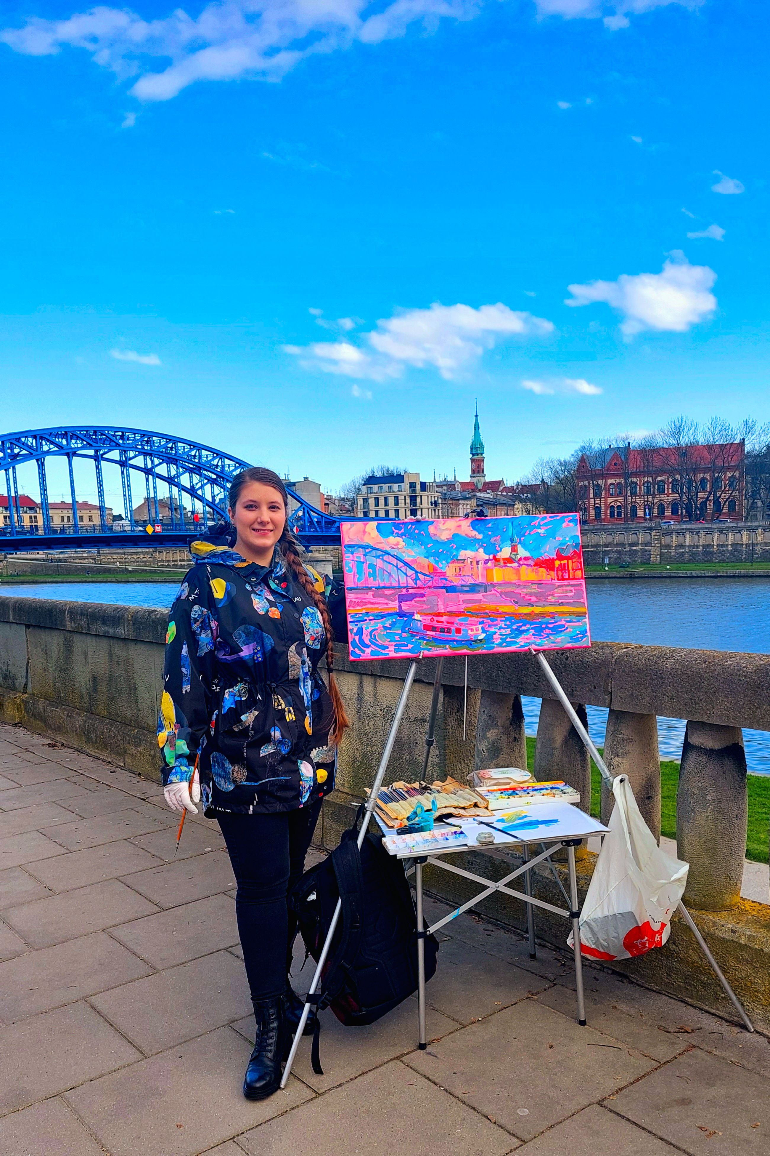 Wejdź w świat, w którym historia spotyka się ze współczesnością, dzięki temu wyjątkowemu obrazowi olejnemu autorstwa Stii, zatytułowanemu „Stare i nowe: dusza Krakowa”. Dzieło w sugestywny sposób ukazuje harmonijne połączenie dawnego uroku Krakowa z jego nowoczesnym obliczem. Wyrazisty most łączy starą część miasta z nową, stając się zarówno metaforycznym, jak i dosłownym pomostem między przeszłością a teraźniejszością. Centralnym punktem kompozycji jest wspaniały Kościół św. Józefa, zachwycający przykładem neogotyckiej architektury. Jego strzelista wieża wznosi się ku niebu niczym świadectwo bogatego dziedzictwa Krakowa. Misternie oddane detale i majestatyczna sylwetka świątyni przyciągają wzrok, budząc podziw i poczucie duchowej głębi. W kontraście do historycznej zabudowy, nowoczesna część Krakowa została przedstawiona poprzez eleganckie, współczesne budynki i infrastrukturę, ukazując dynamiczny rozwój miasta. Zestawienie starego i nowego podkreśla żywa paleta barw — intensywne błękity, róże i fiolety tworzą energetyczną, pulsującą atmosferę. Woda pod mostem odbija te same nasycone kolory, dodając scenie głębi i malarskiej przestrzeni. Obraz w wyjątkowy sposób uchwyca esencję Krakowa, pokazując, jak miasto potrafi harmonijnie łączyć swoje bogate dziedzictwo z nowoczesnością.