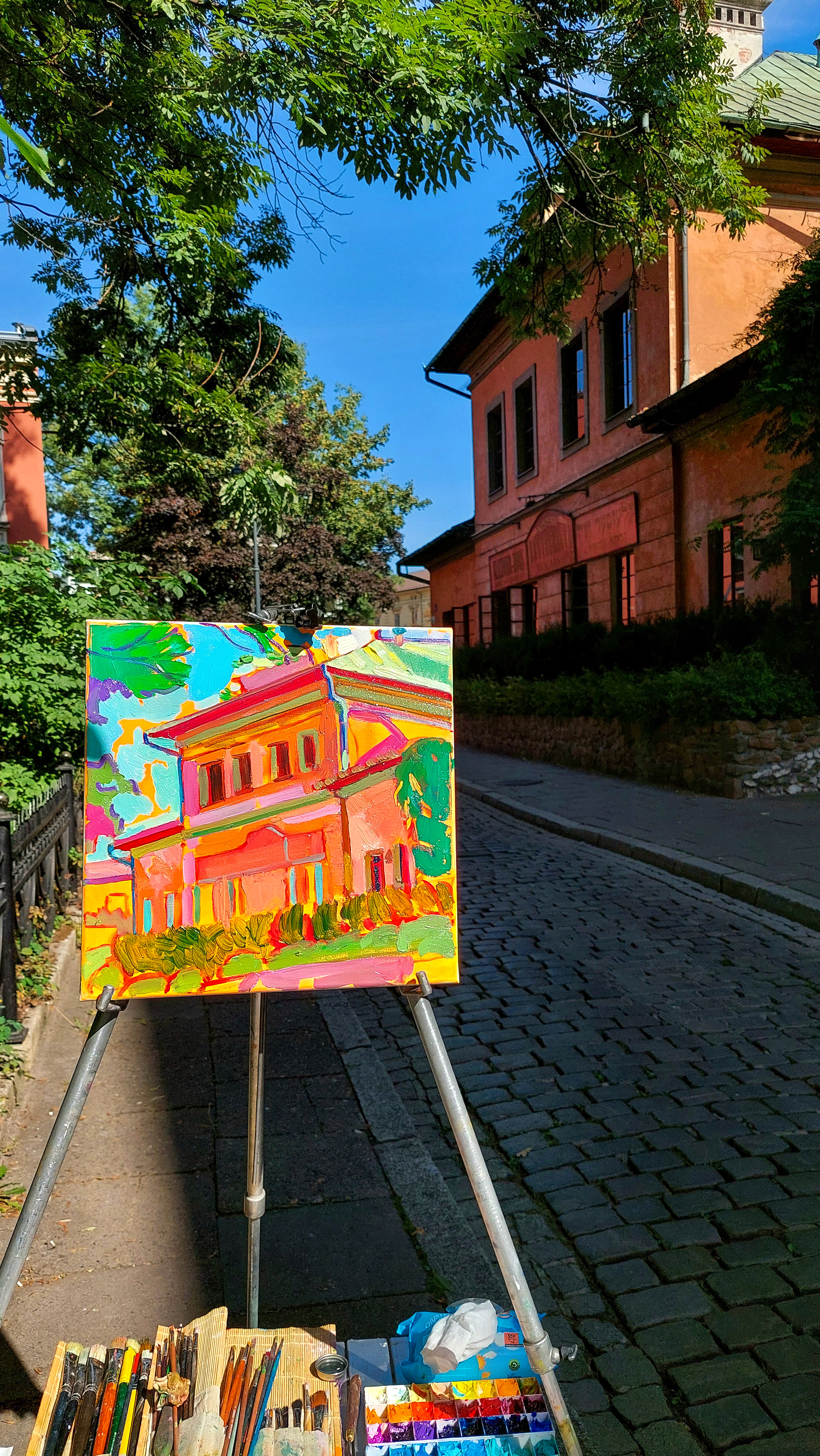 „Dom Klezmera” to jeden z najstarszych budynków XV wieku w Krakowie, który zachwyca swoją niezwykłą urodą. W przeszłości mieściła się tu mykwa, a tuż obok znajduje się Synagoga Remu — jeden z najstarszych i najcenniejszych zabytków kultury żydowskiej. Namalowałam ten dom z natury, w plenerze. Kiedy po raz pierwszy trafiłam w to miejsce, poczułam się jak w mojej ulubionej grze Oblivion. Wąskie uliczki, atmosfera i architektura tworzą prawdziwy średniowieczny świat, który natychmiast pochłania obserwatora i przenosi go w inną epokę.