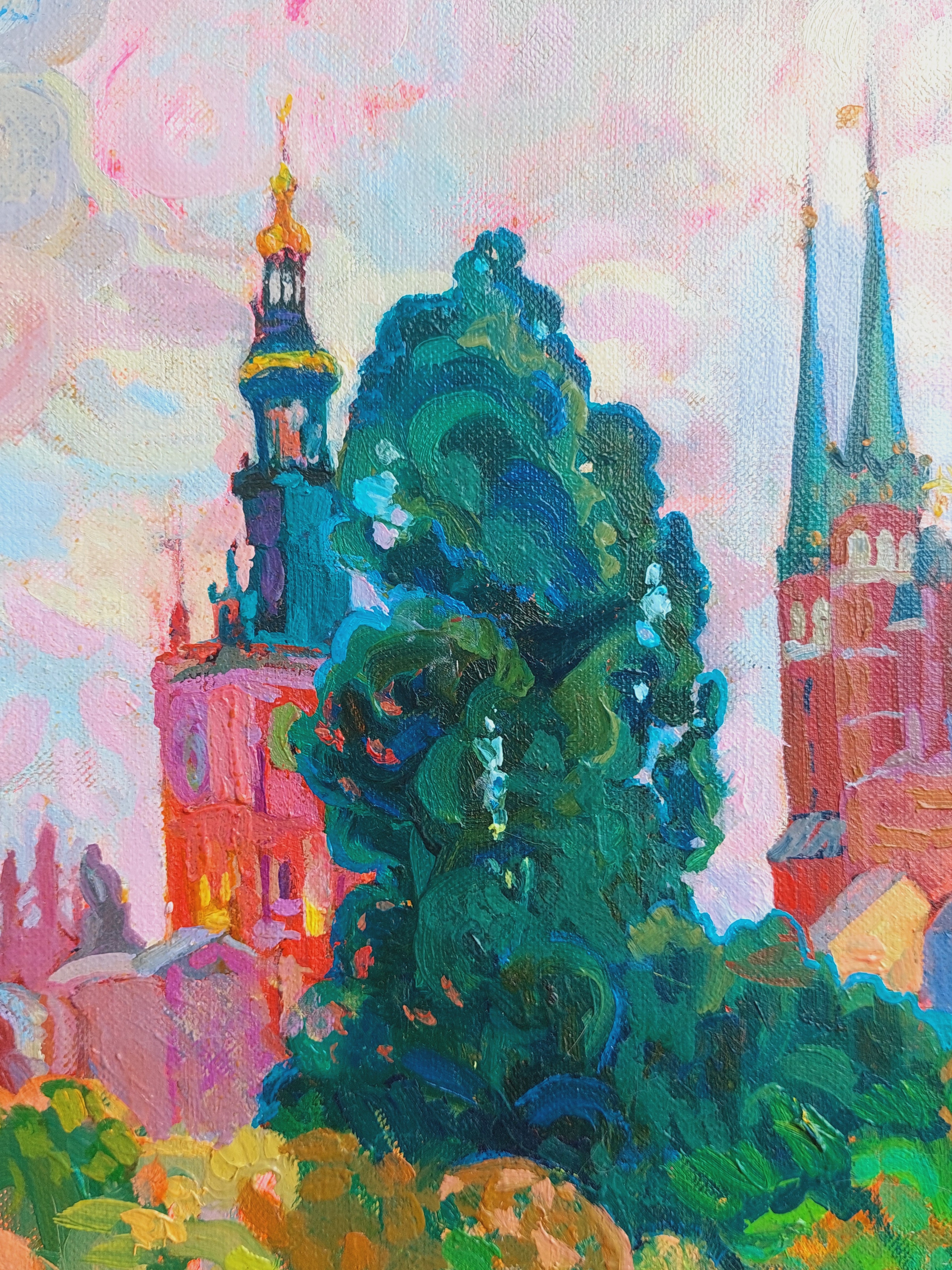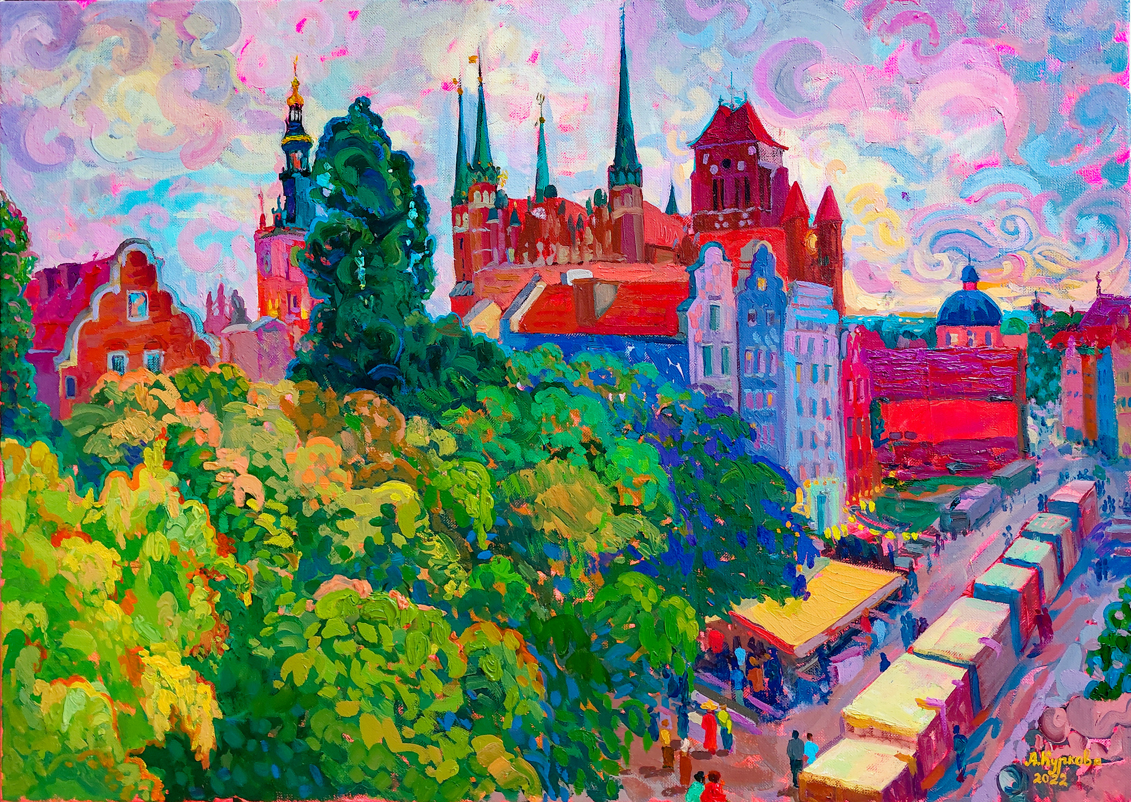 Zanurz się w ponadczasowym pięknie Gdańska dzięki obrazowi „Korona Gdańska” — ekspresyjnemu dziełu olejnemu, które oddaje hołd jednemu z najbardziej rozpoznawalnych polskich zabytków: Bazylice Mariackiej. Wznosząca się ponad panoramą miasta gotycka świątynia — największa ceglana katedra na świecie — została ukazana odważnymi, dynamicznymi pociągnięciami pędzla, podkreślającymi jej monumentalną architekturę. Misternie wyrzeźbione wieże dumnie pną się ku niebu, stanowiąc mocny punkt kompozycji i kierując wzrok widza ku górze. U stóp bazyliki ożywa historyczne serce Gdańska. Rzędy pastelowych kamienic oraz tętniąca życiem ulica z postaciami i straganami tworzą atmosferę codzienności zanurzonej w historii i kulturze. Ten obraz to coś więcej niż pejzaż miejski — to celebracja ducha, dziedzictwa i wizji. Wyraziste dzieło, które wniesie charakter i opowieść do każdego wnętrza.