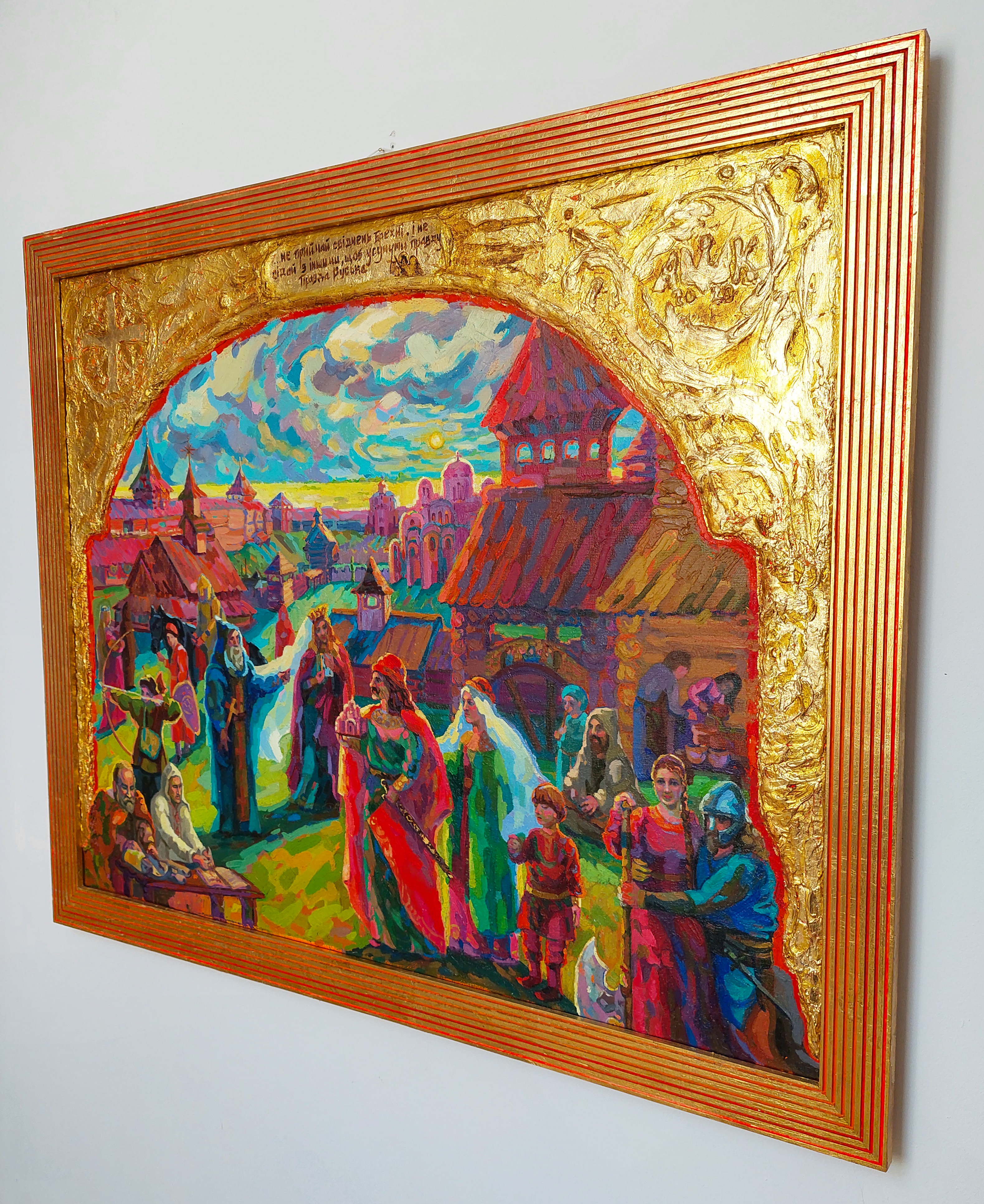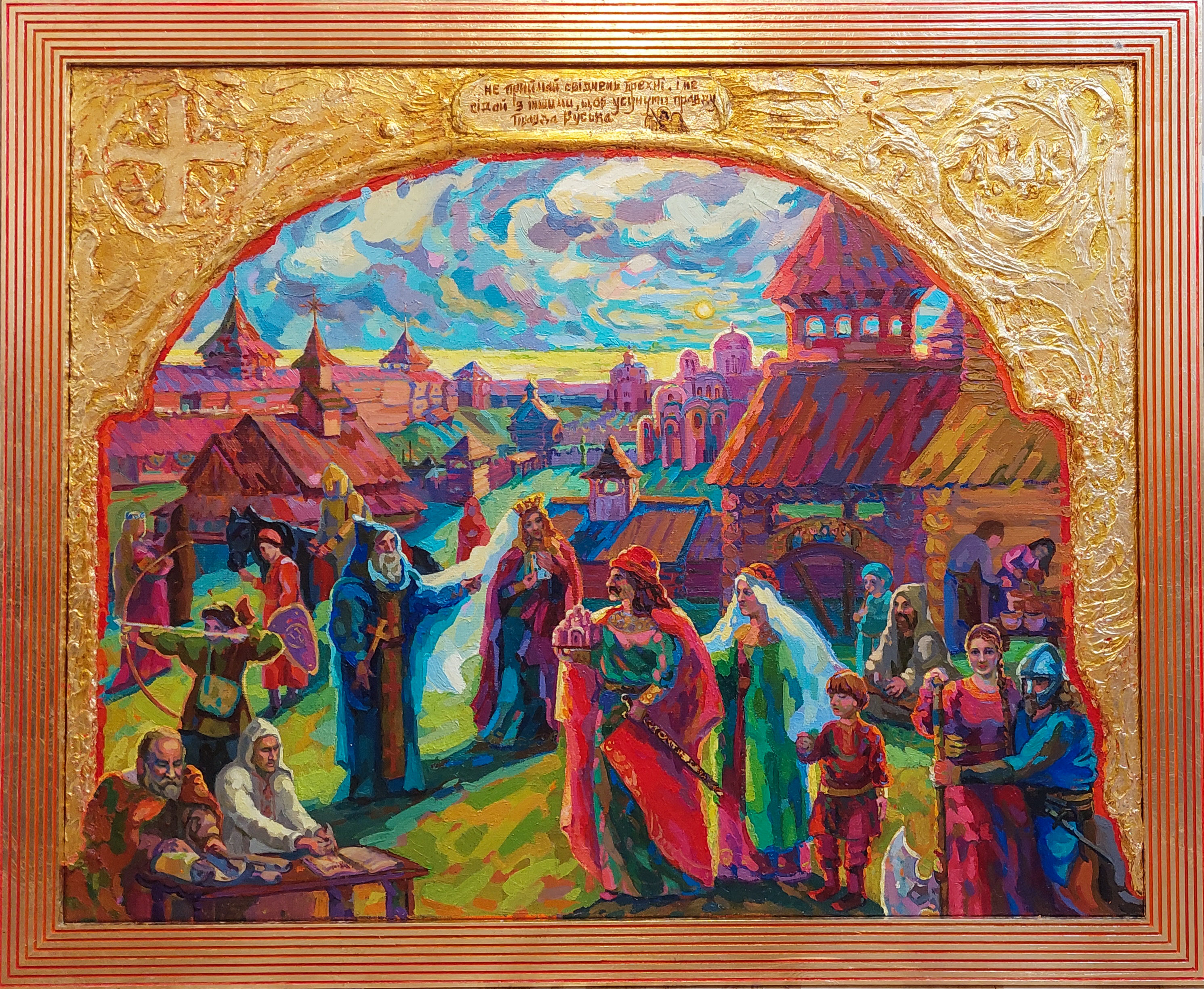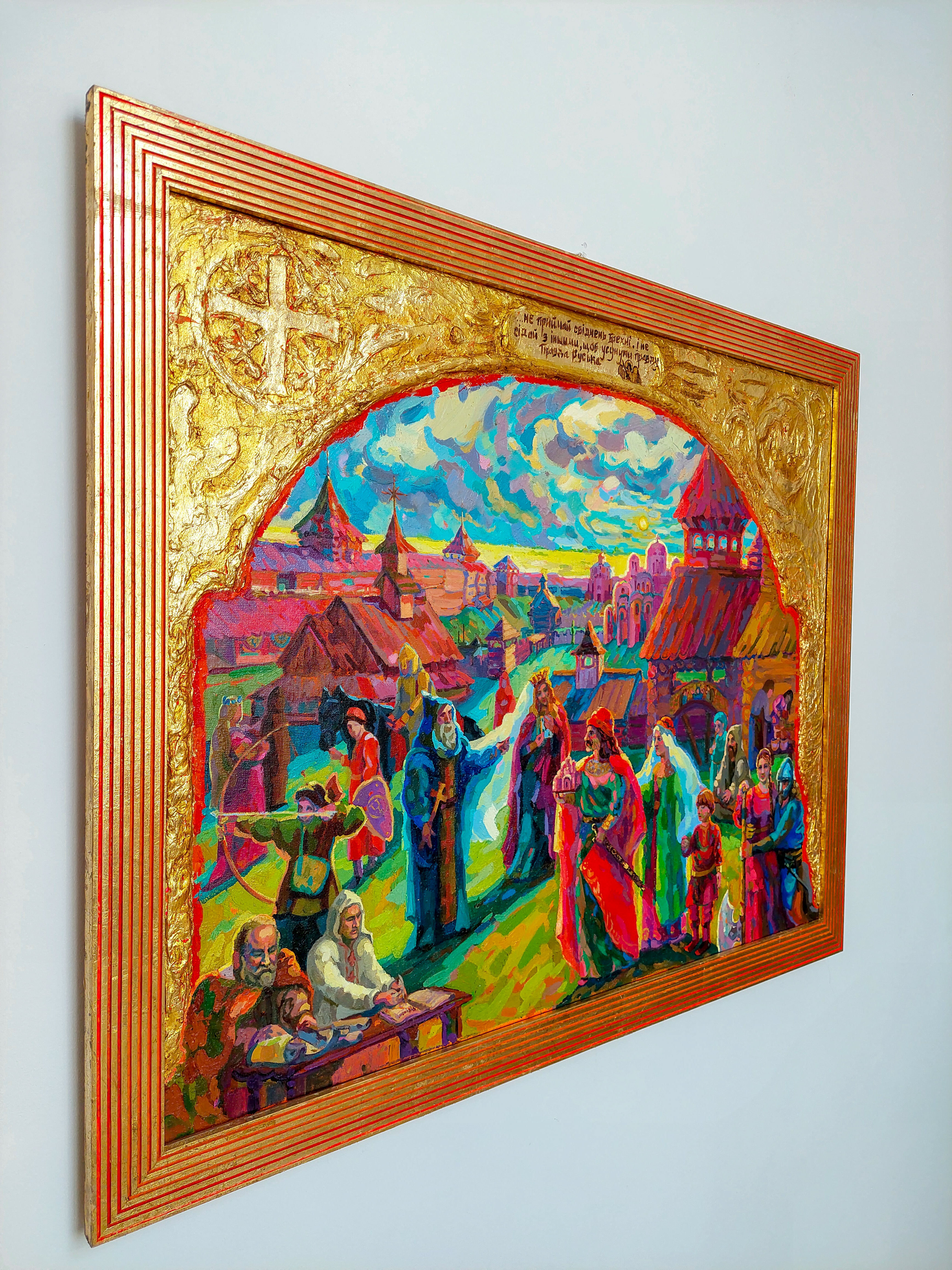 Obraz „Prawda Jarosława” to wielofigurowa kompozycja historyczna oparta na opowieści o działalności Jarosława Mądrego i rozwoju starożytnej Ukrainy — Rusi Kijowskiej. Największy rozkwit tego państwa przypadł na okres po bitwie i ostatecznym zwycięstwie nad Pieczyngami pod Kijowem. Kompozycja opiera się na rekonstrukcji kulturowego, architektonicznego i historycznego obrazu średniowiecznego centrum Starożytnego Kijowa XI wieku, stolicy ówczesnej Rusi Kijowskiej. Obraz składa się z wielu istotnych historycznie detali, postaci i elementów symbolicznych — od faktów i scen po stroje narodowe i charakterystyczne motywy epoki. Pełny opis, analiza historyczna oraz omówienie przedstawionych postaci zostały zaprezentowane w mojej pracy naukowej, która później ukazała się w czasopiśmie „Hagenmeistersi skaniya”.