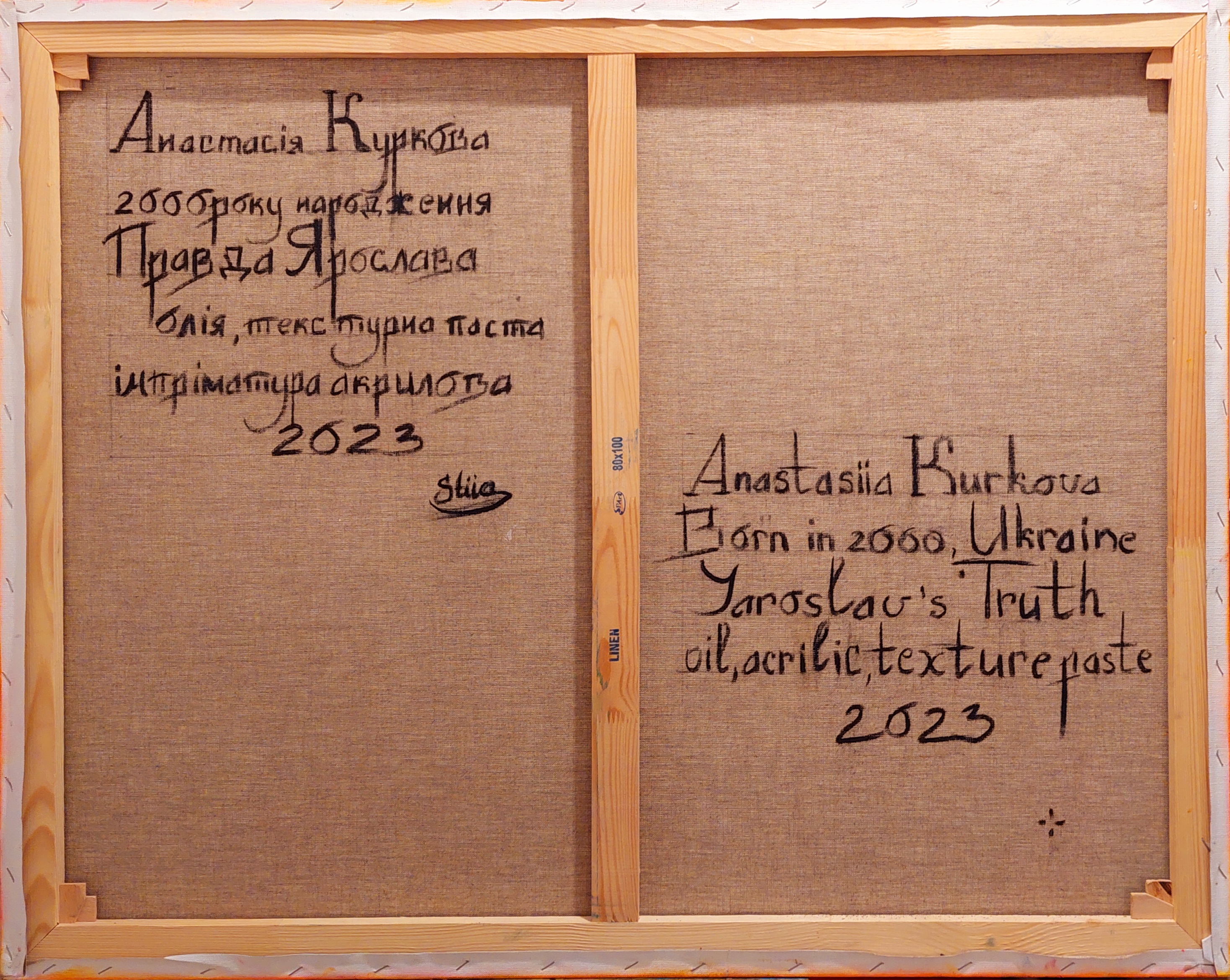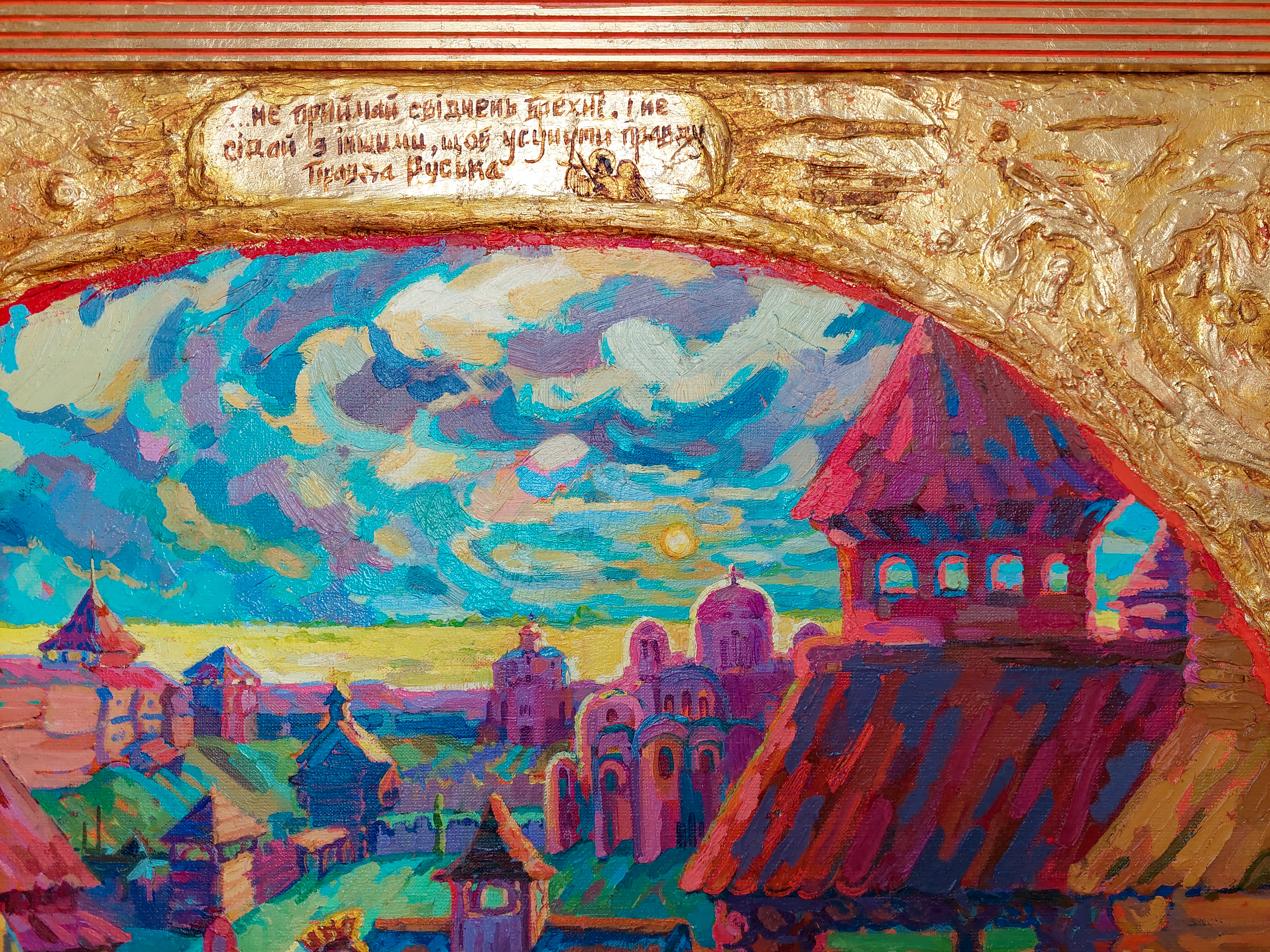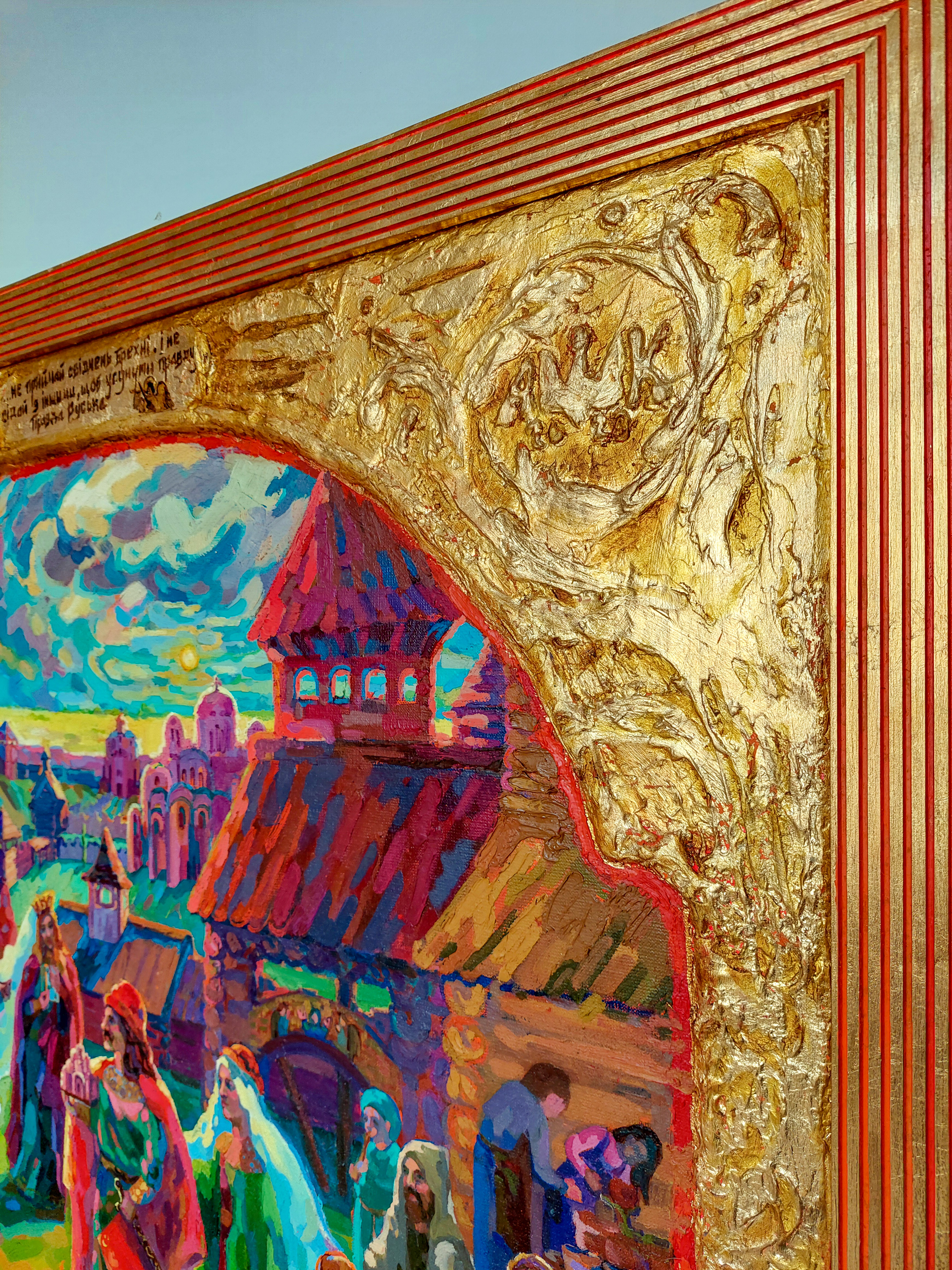 Obraz „Prawda Jarosława” to wielofigurowa kompozycja historyczna oparta na opowieści o działalności Jarosława Mądrego i rozwoju starożytnej Ukrainy — Rusi Kijowskiej. Największy rozkwit tego państwa przypadł na okres po bitwie i ostatecznym zwycięstwie nad Pieczyngami pod Kijowem. Kompozycja opiera się na rekonstrukcji kulturowego, architektonicznego i historycznego obrazu średniowiecznego centrum Starożytnego Kijowa XI wieku, stolicy ówczesnej Rusi Kijowskiej. Obraz składa się z wielu istotnych historycznie detali, postaci i elementów symbolicznych — od faktów i scen po stroje narodowe i charakterystyczne motywy epoki. Pełny opis, analiza historyczna oraz omówienie przedstawionych postaci zostały zaprezentowane w mojej pracy naukowej, która później ukazała się w czasopiśmie „Hagenmeistersi skaniya”.