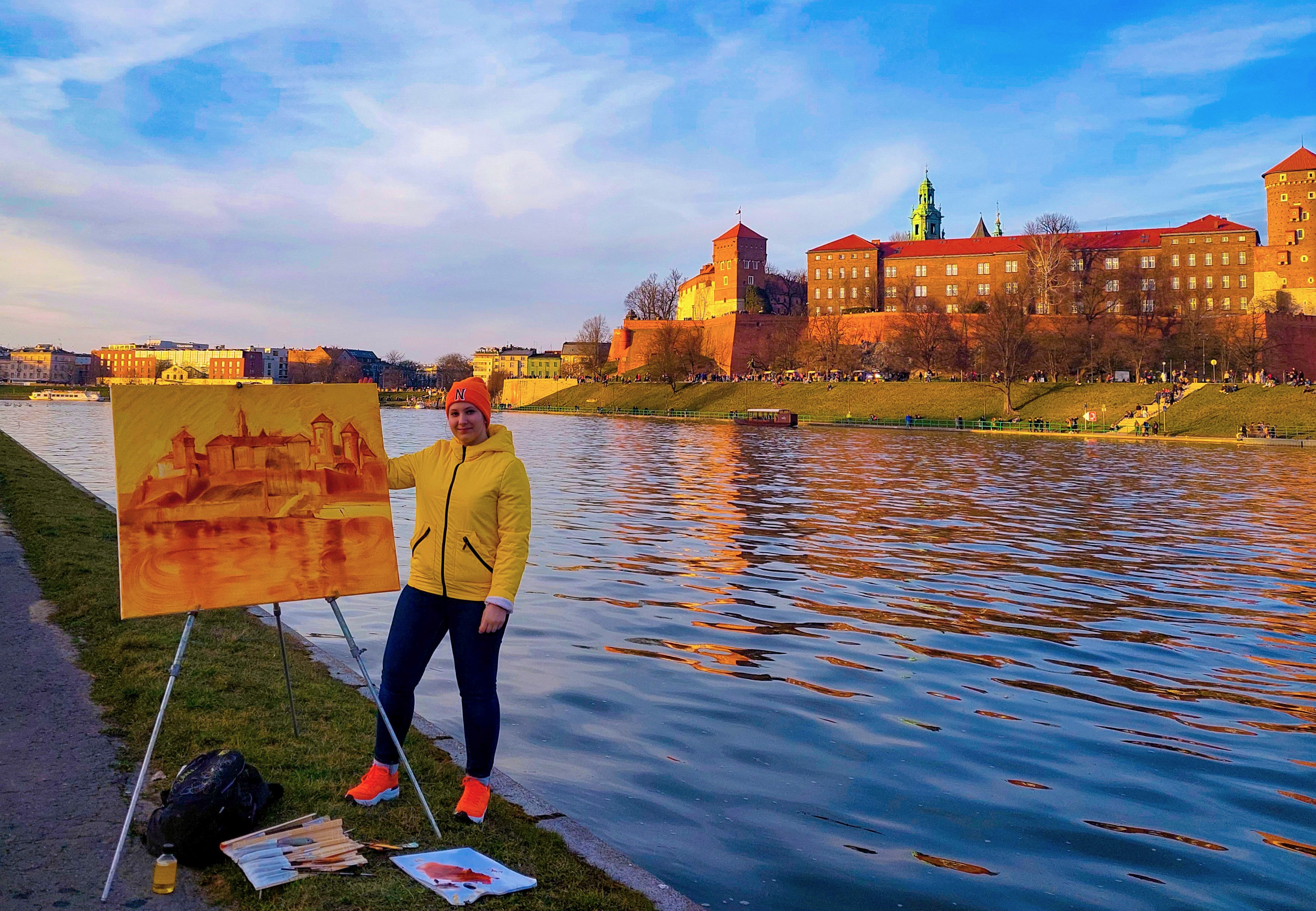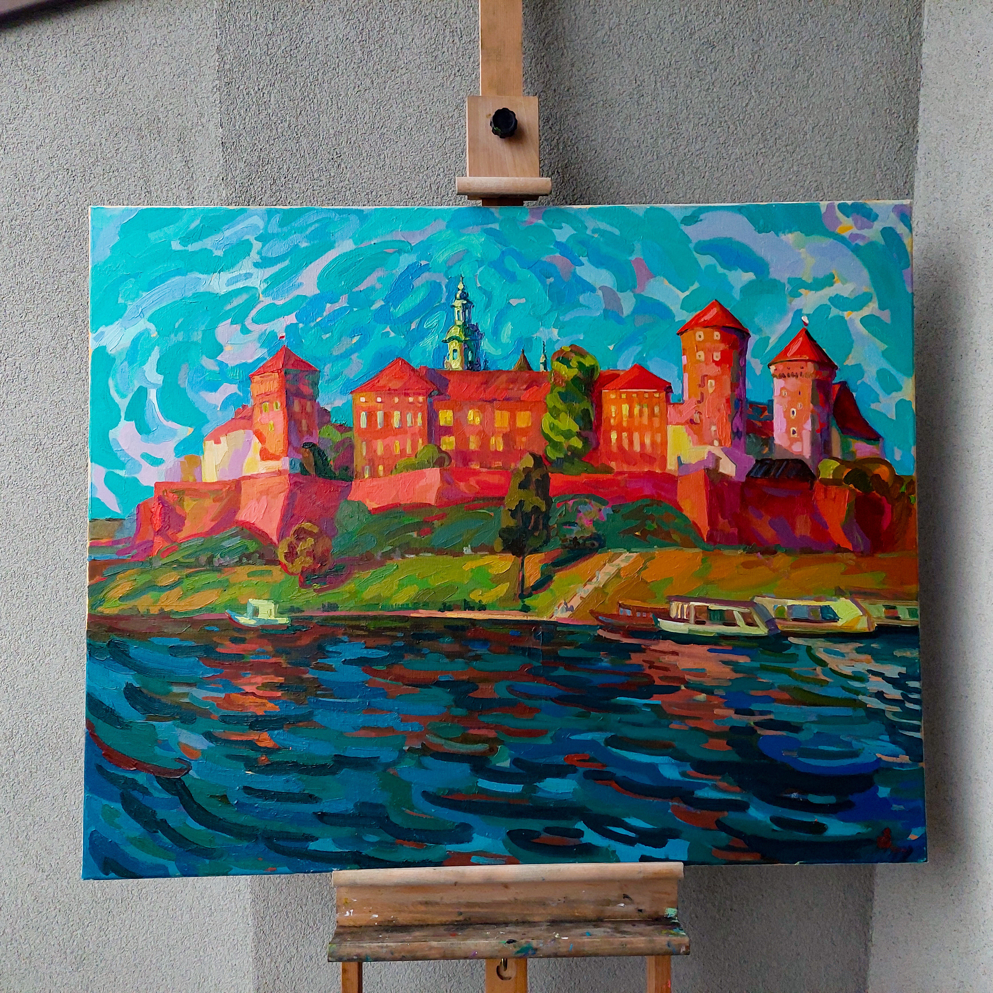 Zamek Królewski na Wawelu to jedno z najważniejszych historycznie i kulturowo miejsc w Polsce, położone na wzgórzu wawelskim. Ta ufortyfikowana rezydencja nad Wisłą w Krakowie została wzniesiona z inicjatywy króla Kazimierza III Wielkiego, a na przestrzeni wieków rozbudowywana w zespół budowli otaczających dziedziniec w stylu włoskim. Wawel łączy w sobie niemal wszystkie europejskie style architektoniczne epoki średniowiecza, renesansu i baroku. To miejsce można malować nieskończoną ilość razy — jego historia, architektura i symbolika są tak wielowarstwowe, że inspirowały poetów, pisarzy, historyków i artystów przez całe stulecia. Mój obraz powstał z natury, en plein air, w stylistyce impresjonistycznej, oddając zarówno majestat tego niezwykłego miejsca, jak i ducha historii Polski. Używam farb najwyższej jakości (Rembrandt, Van Gogh oraz Winsor) dzięki czemu dzieło charakteryzuje się wysoką odpornością na światło, a kolory zachowają swoją intensywność przez wiele dziesięcioleci. Obecnie obraz jest wystawiony w Krakowie, w Domu Aukcyjnym „Galeria 36”.
