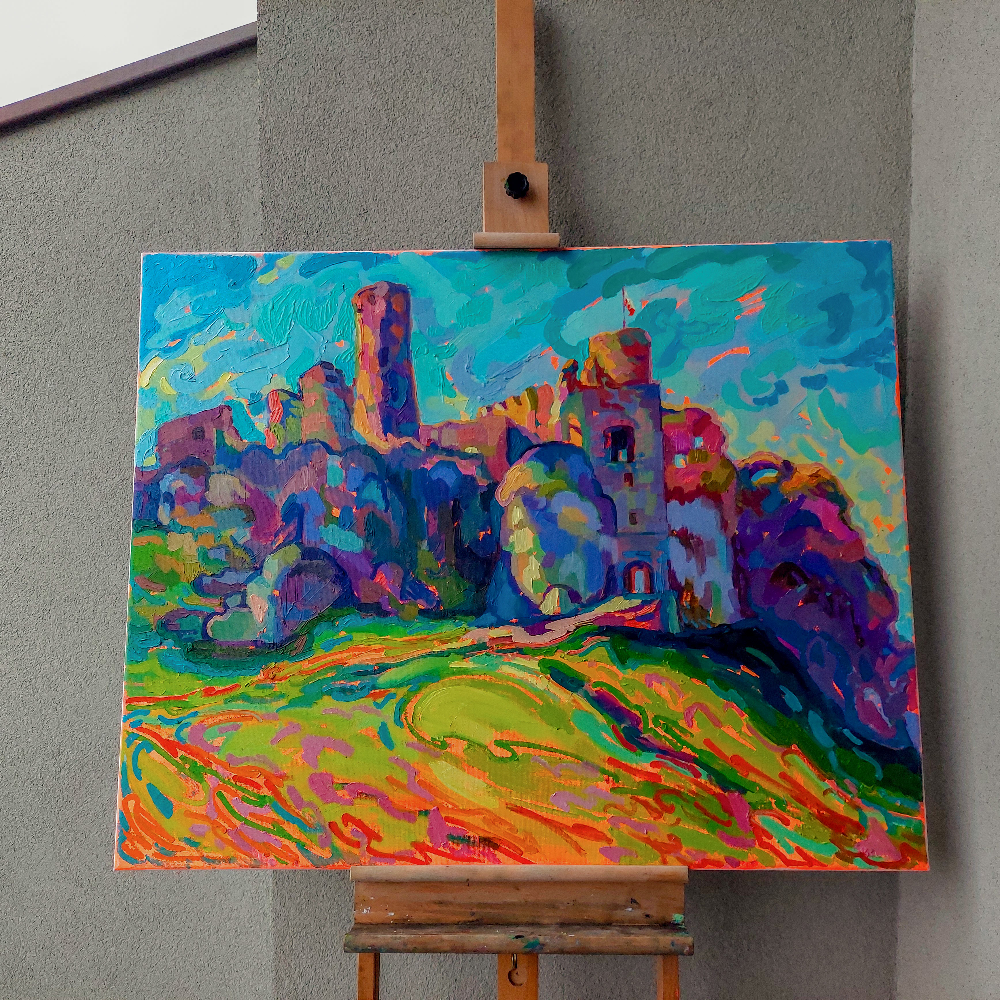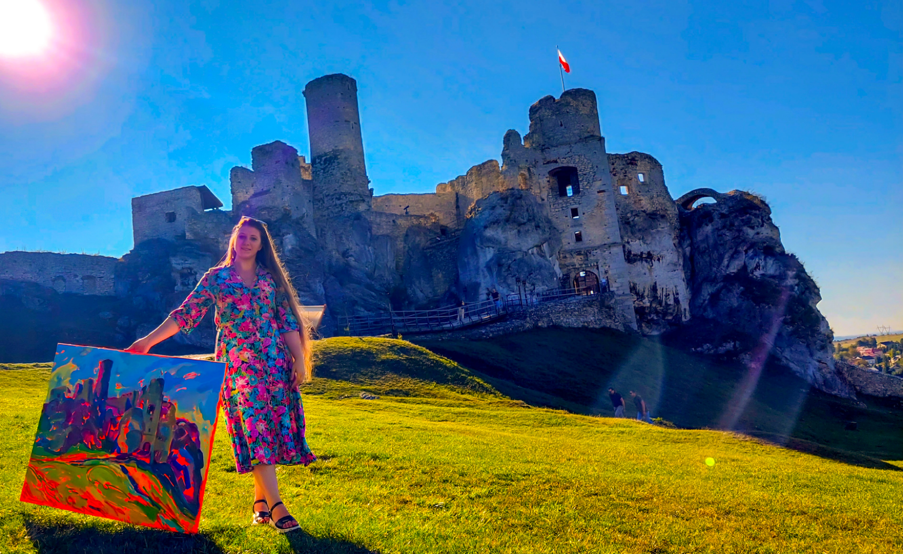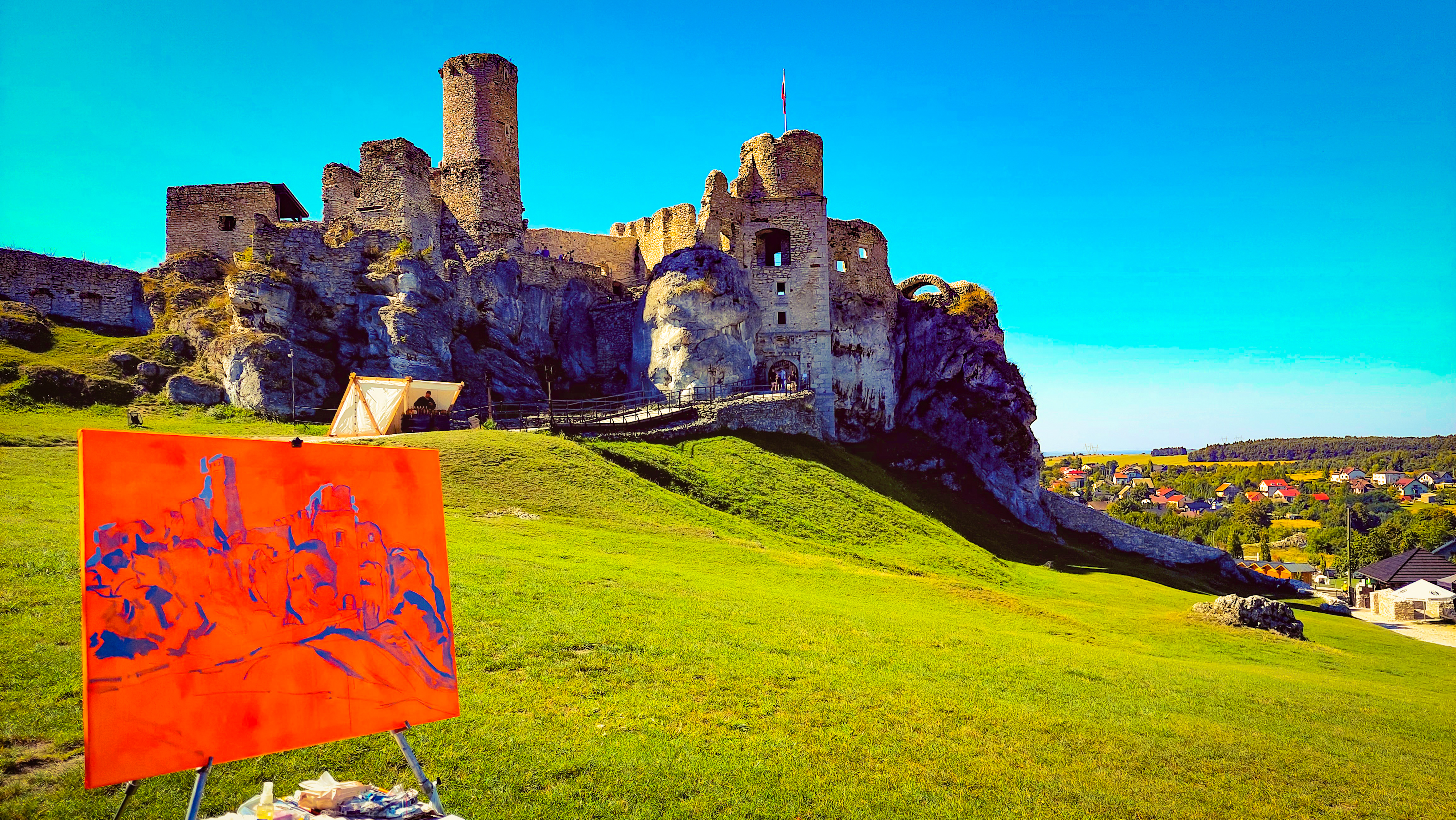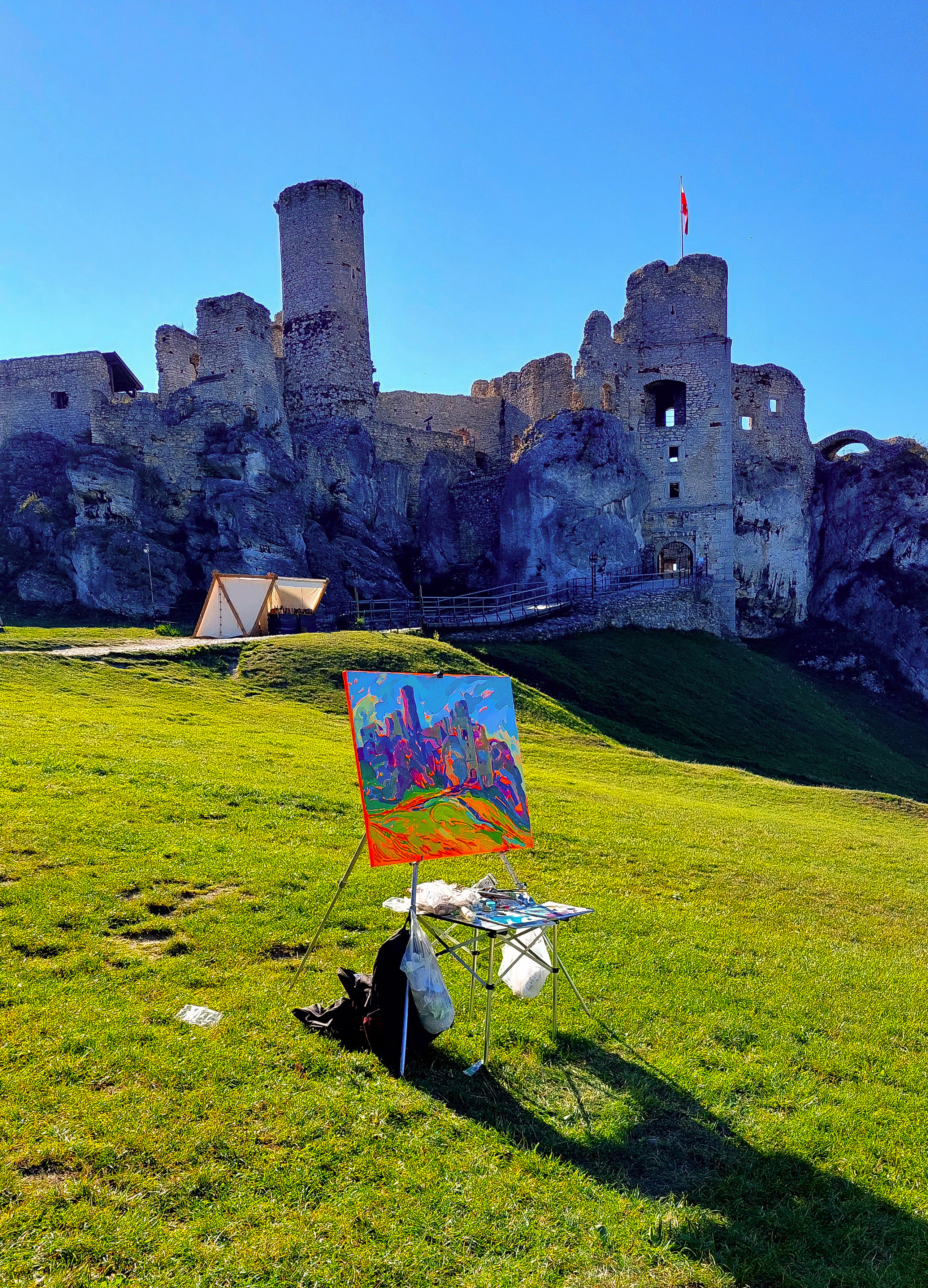 Miłośnicy świata Wiedźmina (tak jak ja) z pewnością kojarzą słynne królestwo Sodden. W 2019 roku scena Bitwy o Wzgórze Sodden do serialu „Wiedźmin” została nakręcona właśnie na terenie średniowiecznego polskiego zamku Ogrodzieniec. To miejsce ma długą i fascynującą historię sięgającą XII wieku. Zamek był rezydencją królów i królowych, świadkiem zmian władców, prawdziwych średniowiecznych bitew i dworskich intryg. Dziś możemy podziwiać jedynie jego ruiny, lecz w XVI wieku Ogrodzieniec był prawdziwym renesansowym arcydziełem, porównywanym nawet do Wawelu. To miejsce ma absolutnie wyjątkową atmosferę - życzę każdemu, aby choć raz w życiu odwiedził ten niezwykle interesujący zakątek Polski. Mój obraz powstał z natury, en plein air, w stylistyce impresjonistycznej, aby oddać piękno tego niezwykłego miejsca oraz fragment historii Polski. Tworzę przy użyciu farb najwyższej jakości (Rembrandt, Van Gogh, Winsor, Renesans), co gwarantuje doskonałą odporność na światło i zachowanie intensywności barw przez ponad sto lat.