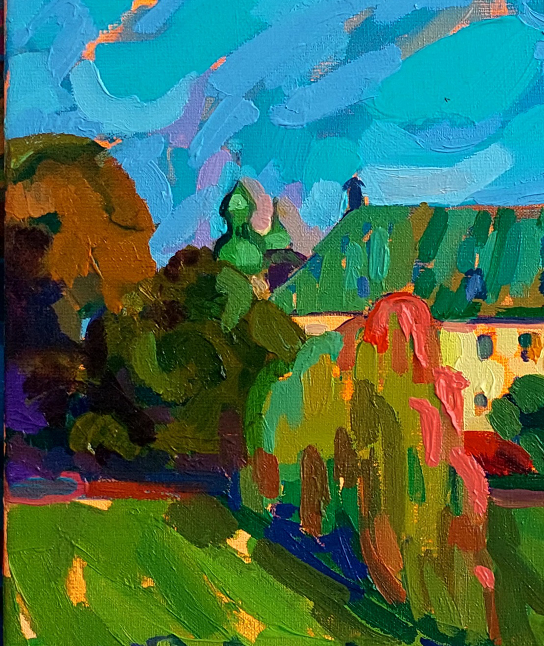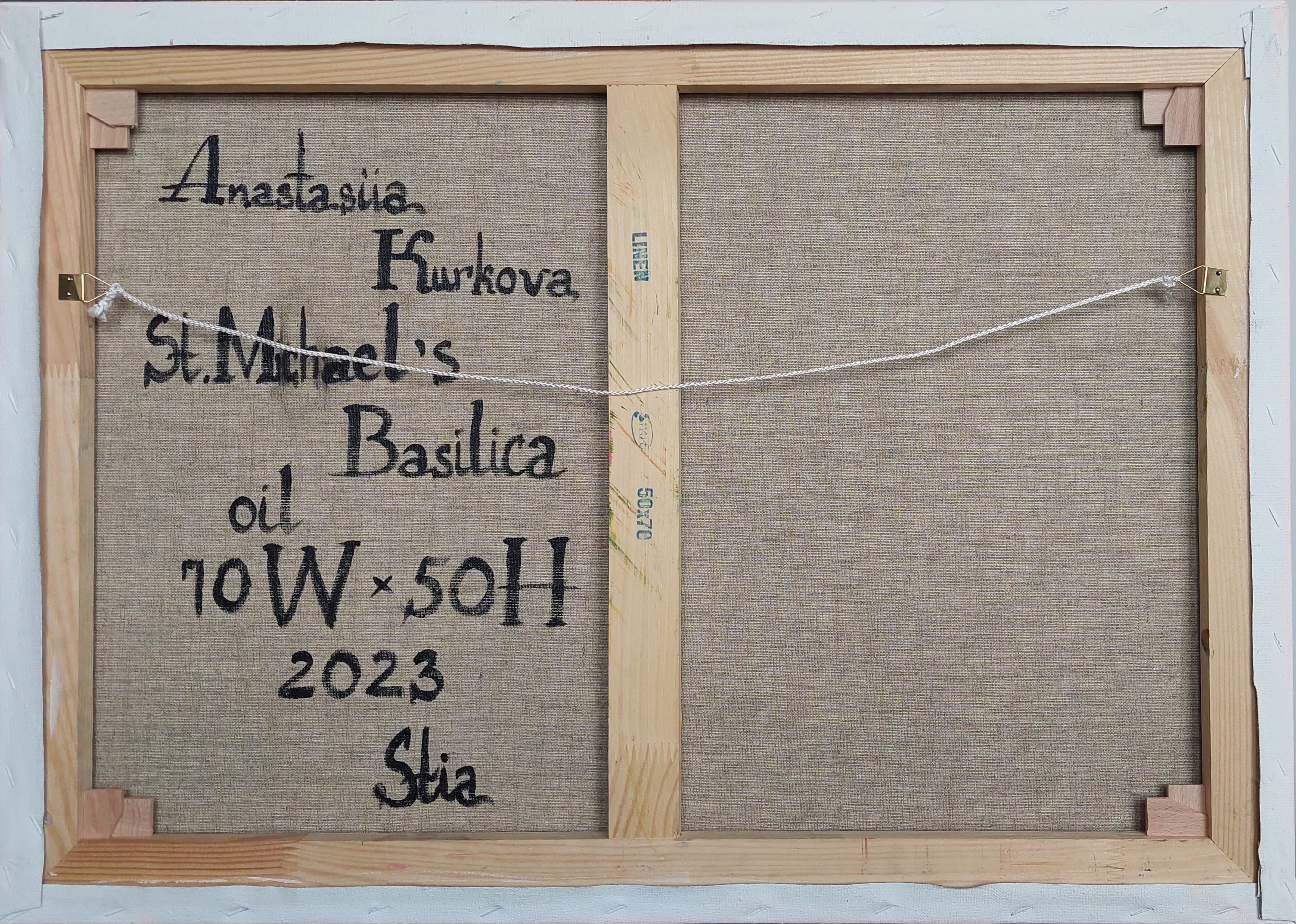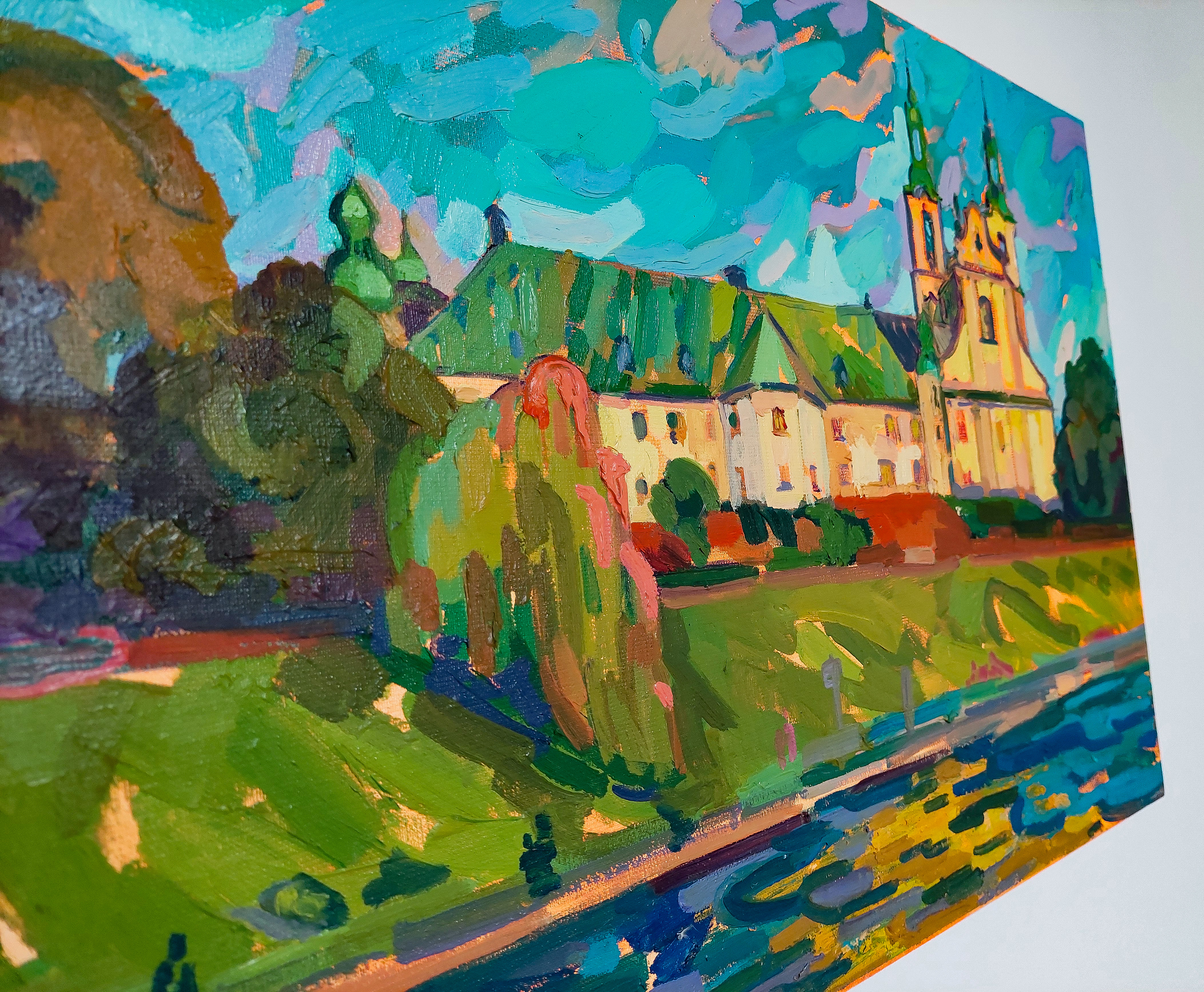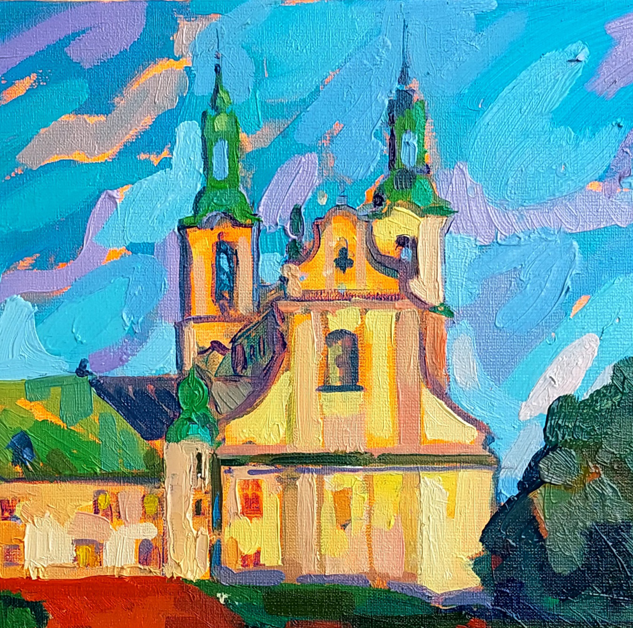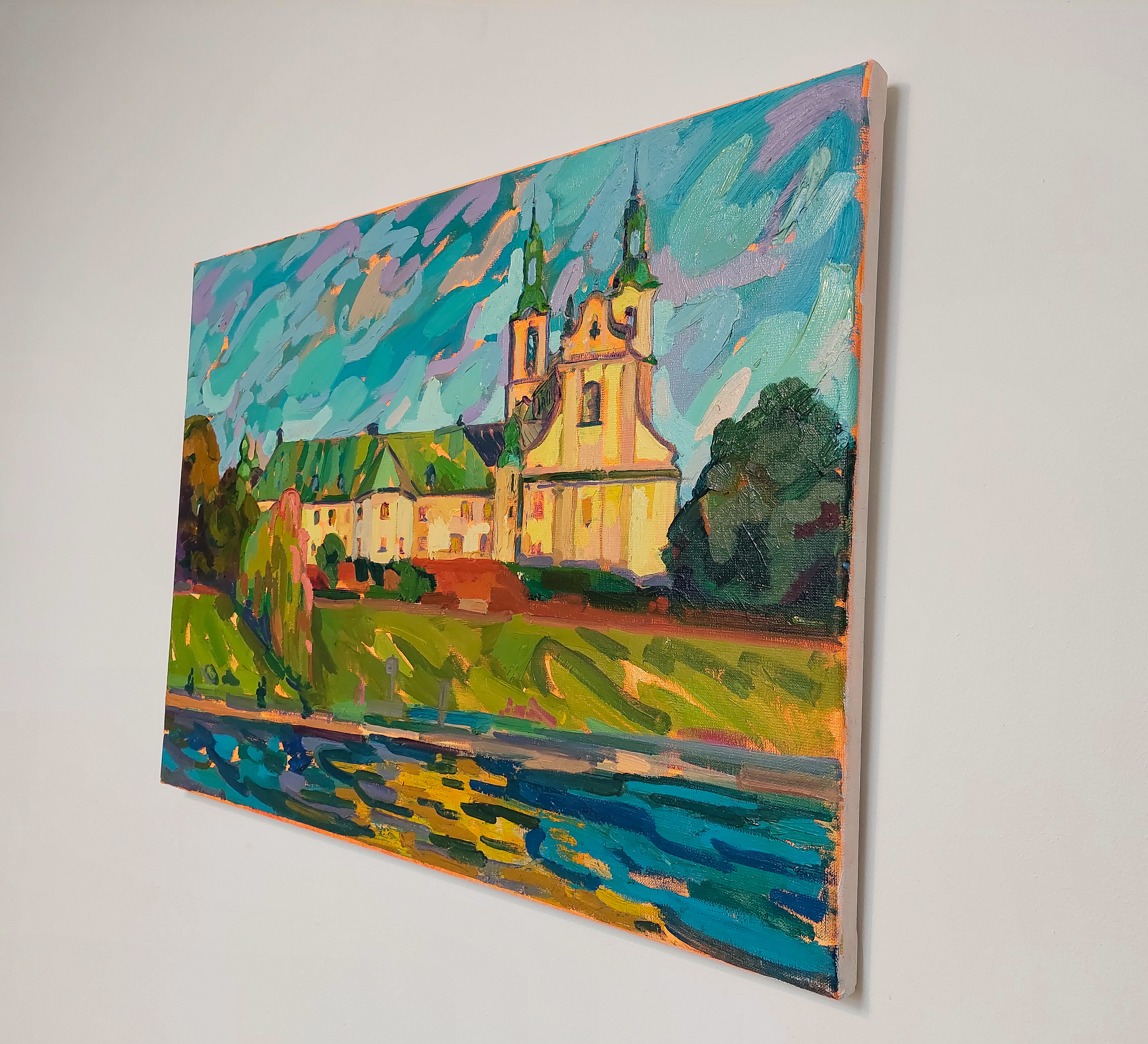 Po drugiej stronie Wisły znajduje się niewielka, tajemnicza skała w Krakowie, na której szczycie wznosi się klasztor paulinów, a tuż obok niego Bazylika św. Michała Archanioła i św. Stanisława Biskupa i Męczennika, znana również jako Skałka — co po polsku oznacza „małą skałę”. Miejsce to ma niezwykłą, niepokojącą historię. To właśnie tutaj, według przekazów, biskup krakowski Stanisław ze Szczepanowa został zabity na rozkaz króla Bolesława II Śmiałego w 1079 roku. Wydarzenie to doprowadziło do wygnania króla oraz późniejszej kanonizacji zamordowanego biskupa. Mimo dramatycznej przeszłości, bazylika ma w sobie niezwykły magnetyzm — szczególnie o zachodzie słońca, kiedy promienie padają na jej śnieżnobiałe mury, barwiąc je na pomarańczowo, a cała zieleń wokół przybiera różowy odcień. To naprawdę urzekający widok. Do malowania używam farb najwyższej jakości, takich jak Rembrandt, Van Gogh czy Winsor, dzięki czemu obraz charakteryzuje się wysoką odpornością na światło, a kolory nie tracą swoich właściwości z upływem czasu. Moje dzieło powstało z natury, w plenerze, w stylu impresjonizmu i przedstawia to niezwykłe miejsce oraz jego długą, fascynującą historię.