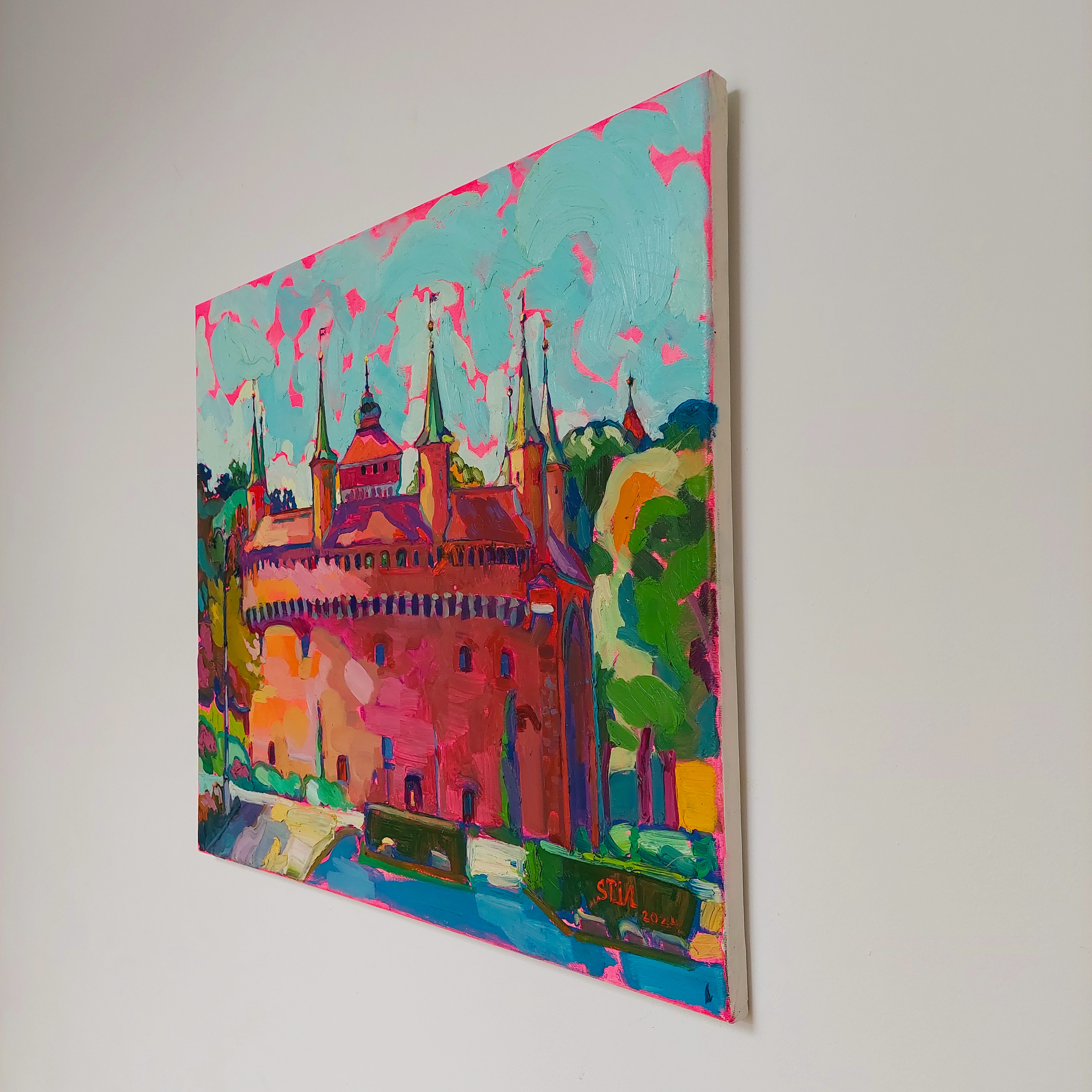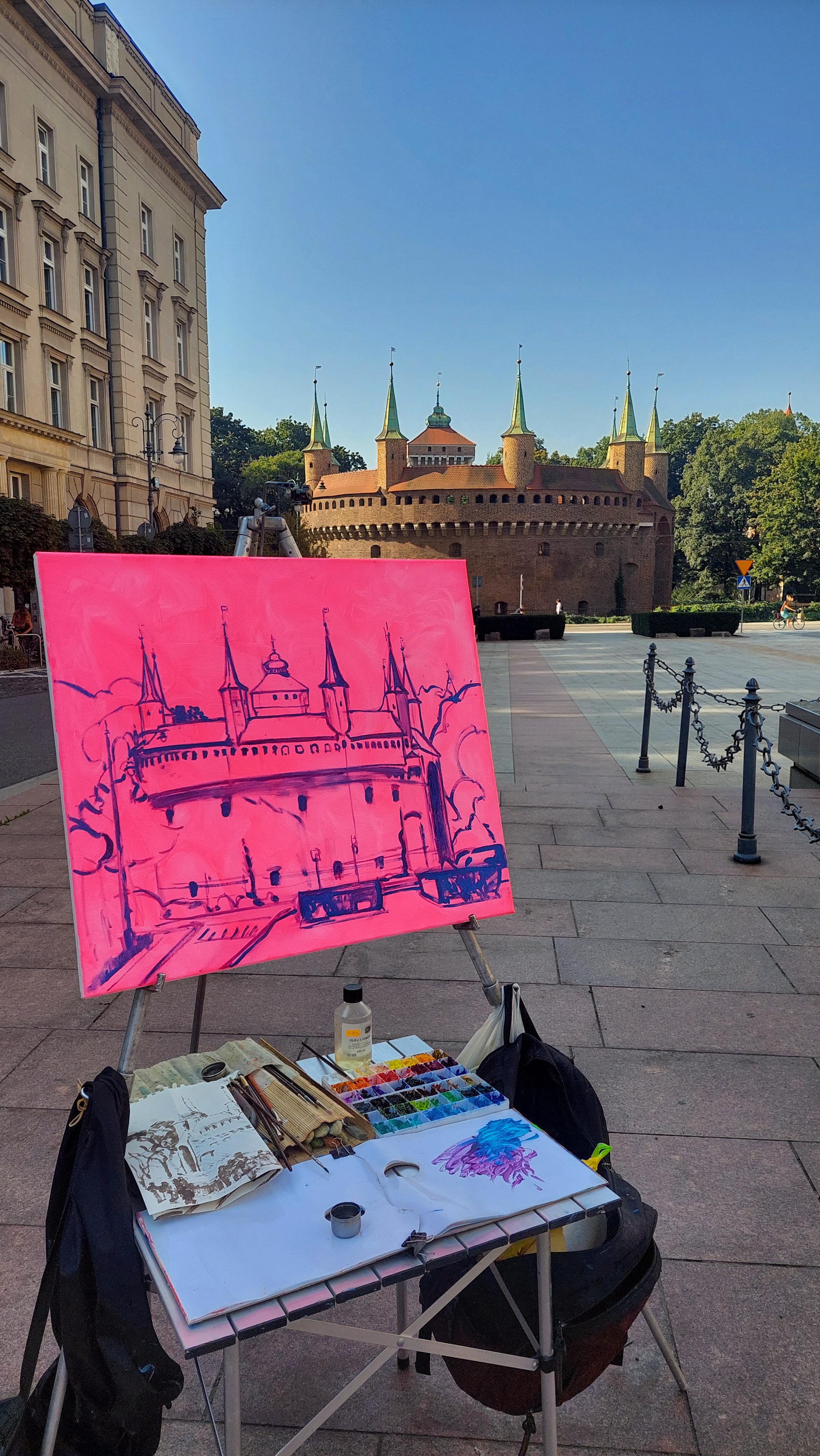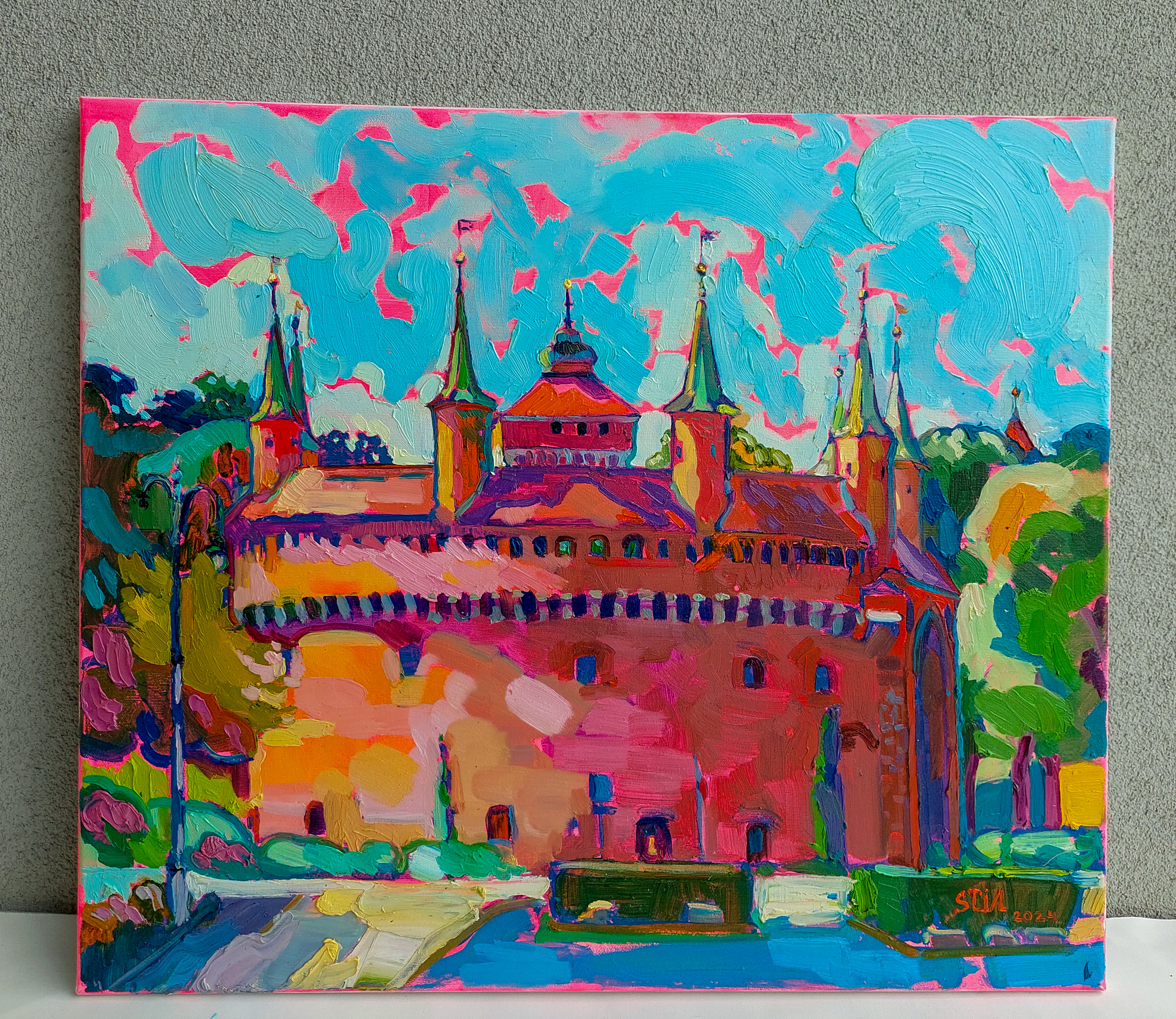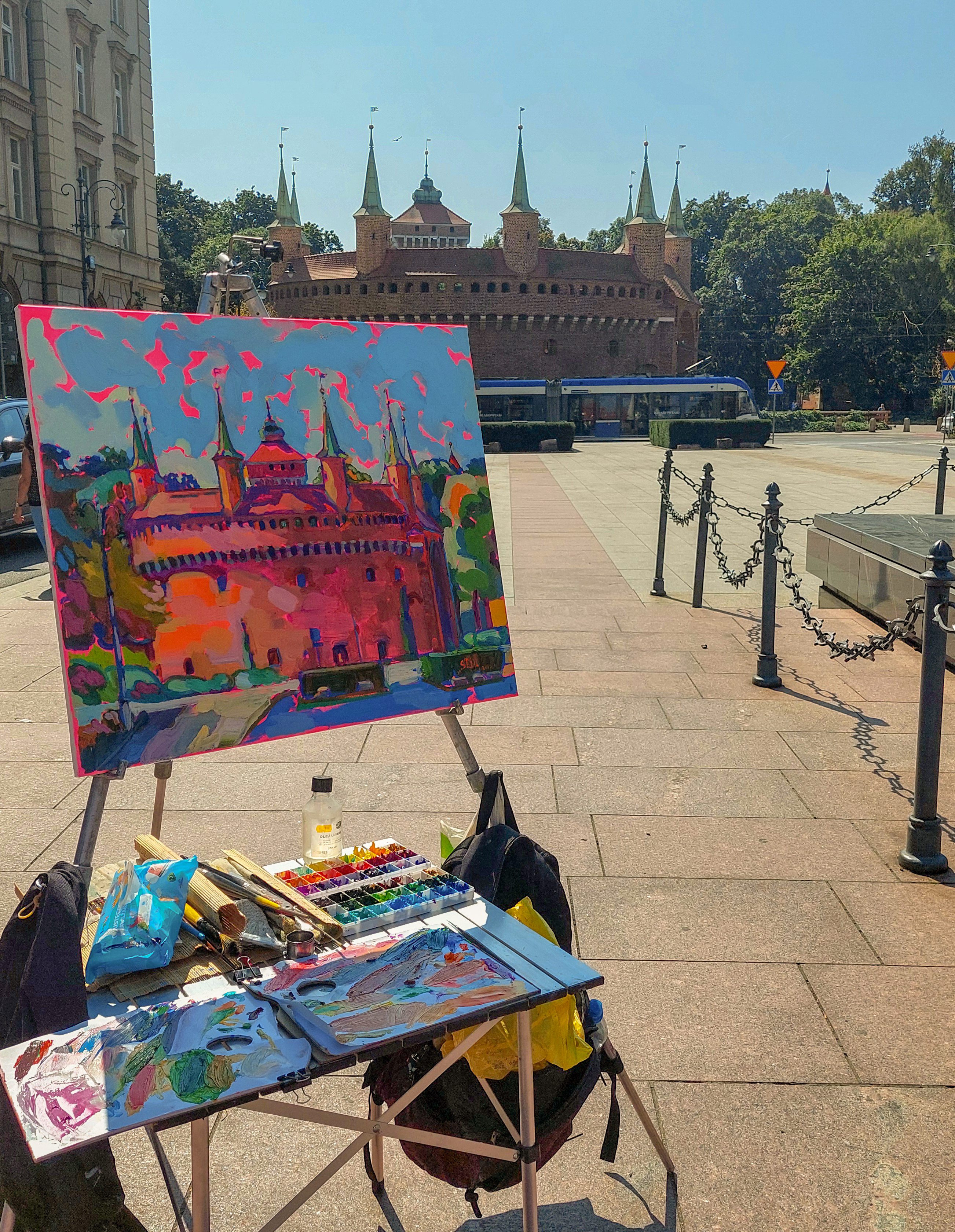 Polska, stare historyczne centrum Krakowa i jego słynna perła — Barbakan. Ten zabytkowy element dawnej bramy miejskiej został namalowany przeze mnie w plenerze, w stylu impresjonizmu, i przedstawia jeden z nielicznych zachowanych reliktów rozbudowanego systemu fortyfikacji oraz barier obronnych, które niegdyś otaczały królewskie miasto Kraków.