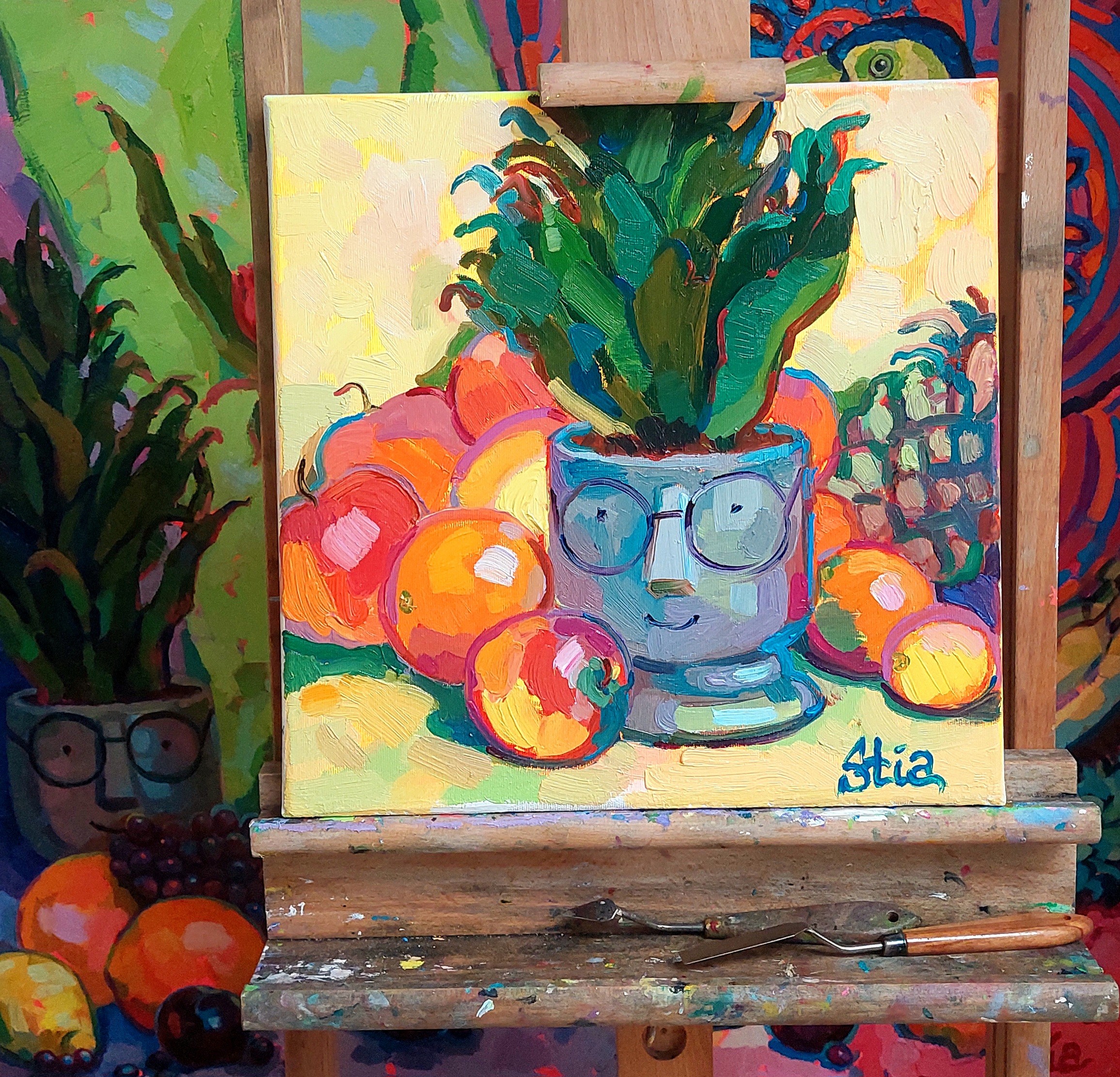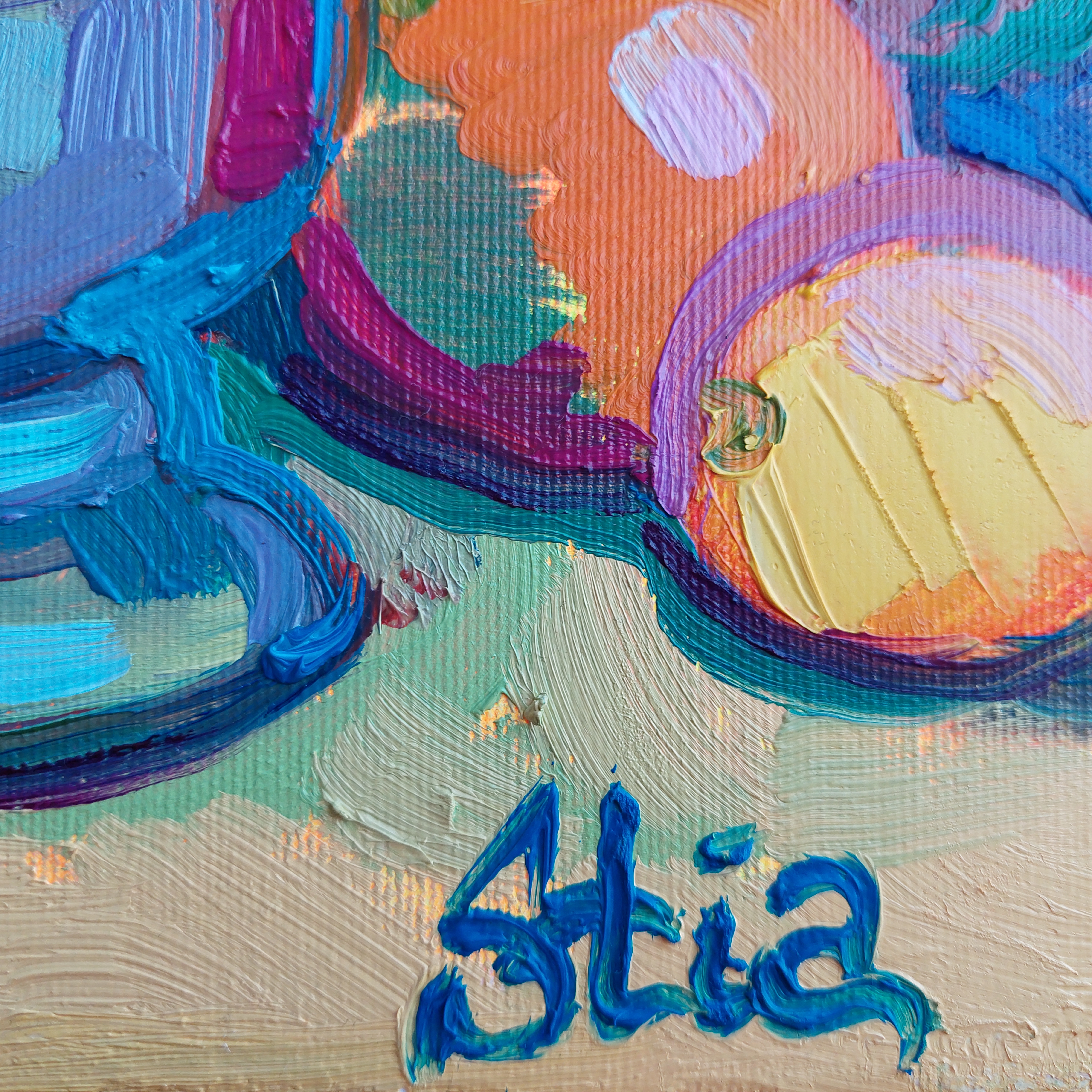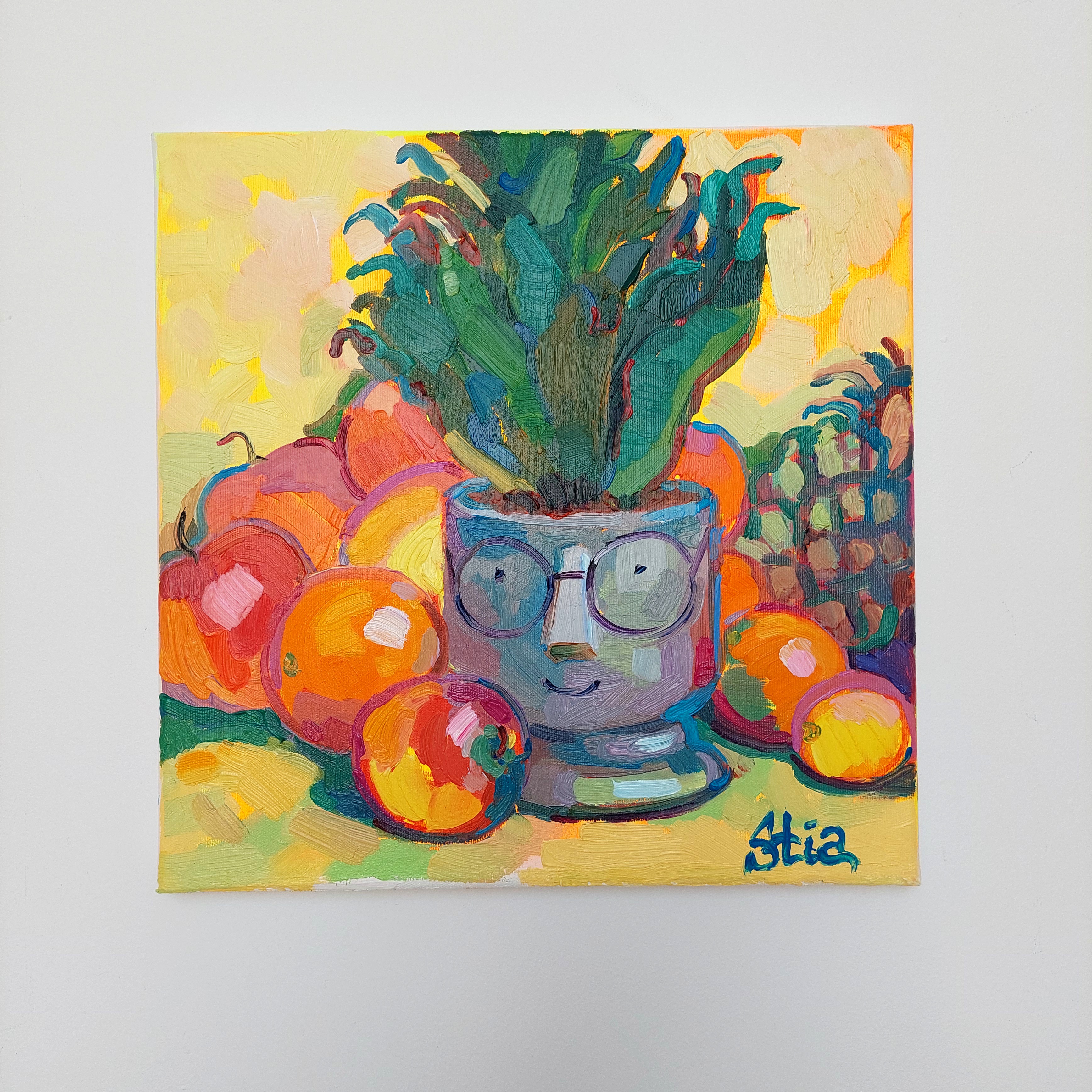 Martwa natura emanuje radością, jakby sama natura uśmiechała się ciepło do widza. Intensywne barwy owoców przywołują światło słoneczne, które rozgrzewa serce. Każdy element kompozycji, starannie ułożony w harmonii, zdaje się ucieleśniać czystą i prostą radość. To prawdziwa chwila zachwytu zatrzymana w czasie — pełna ciepła i światła, wywołująca uśmiech u każdego, kto na nią spojrzy.