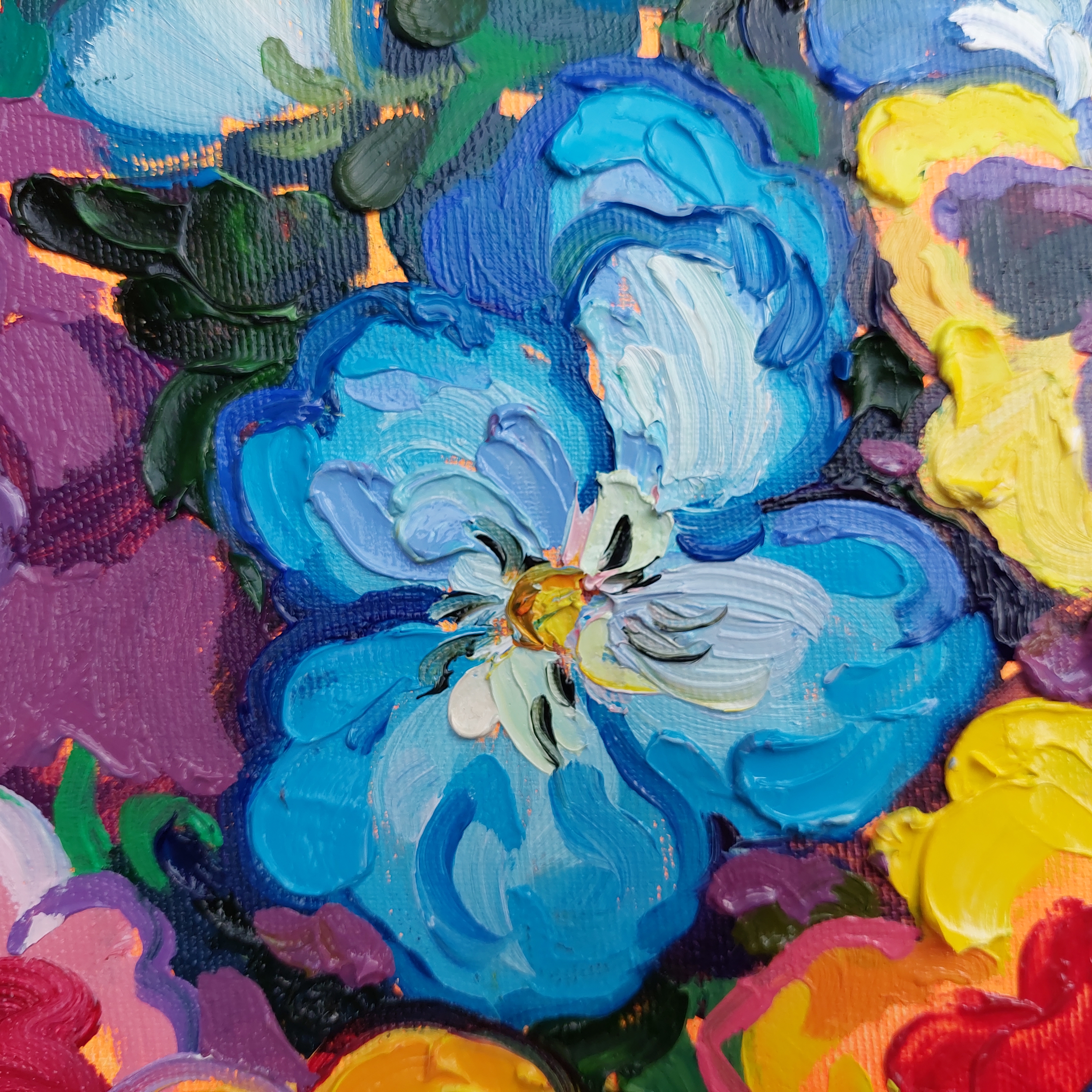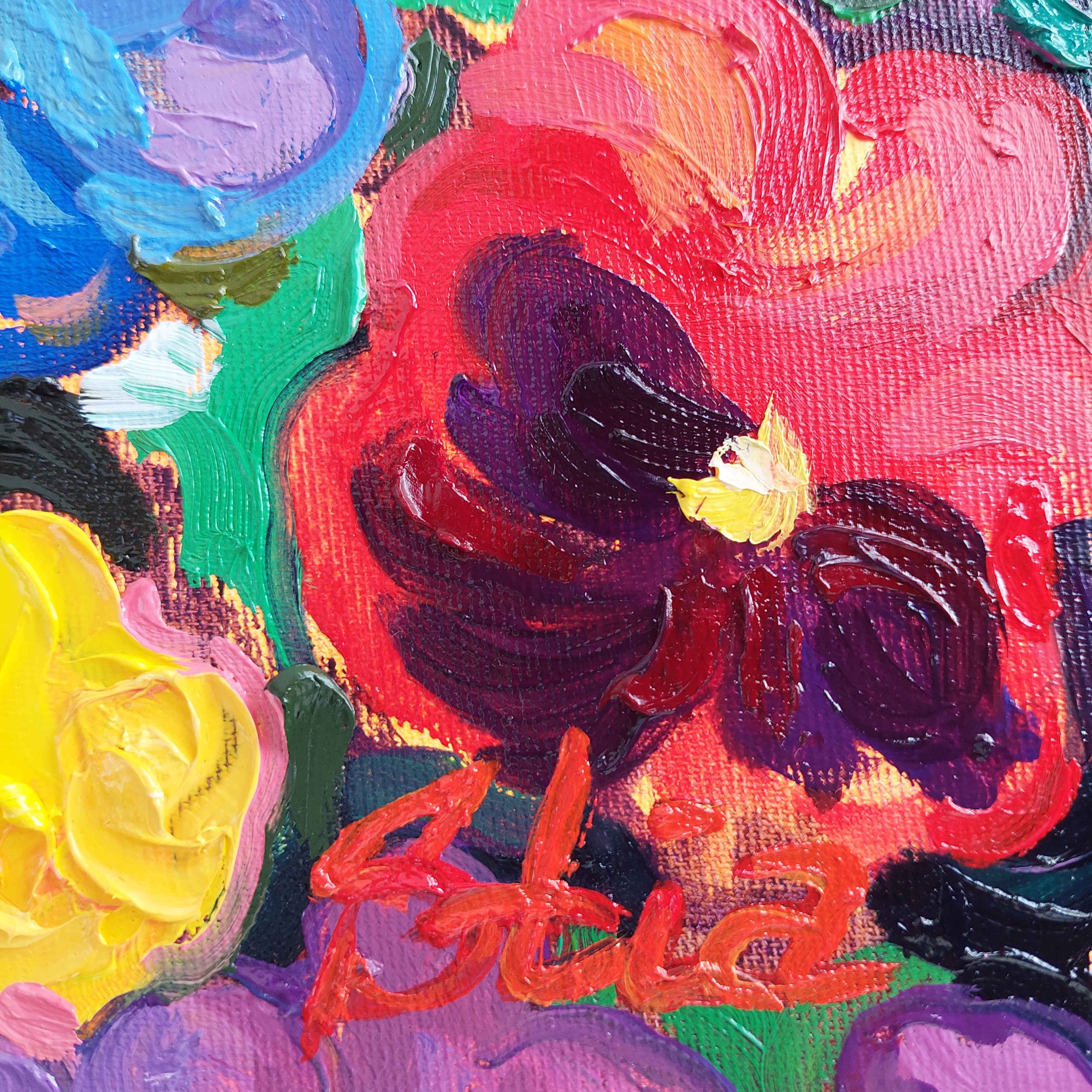 Ten obraz nie opowiada o spokoju. Mówi o burzliwym, pulsującym życiu, które przebija się przez kolor, fakturę i ruch. Fiolety nie są tu dekoracją — stają się symbolami emocji: miłości, namiętności, niepokoju, inspiracji. Wybuchają barwą i formą, tworząc na płótnie niemal muzyczny rytm. To dzieło jest dla tych, którzy czują świat intensywnie — którzy w sztuce szukają nie ciszy, lecz emocjonalnej siły samego życia. To odważny punkt centralny przestrzeni, w której ceni się ruch, głębię i odwagę — w domu, galerii lub kreatywnym studio.