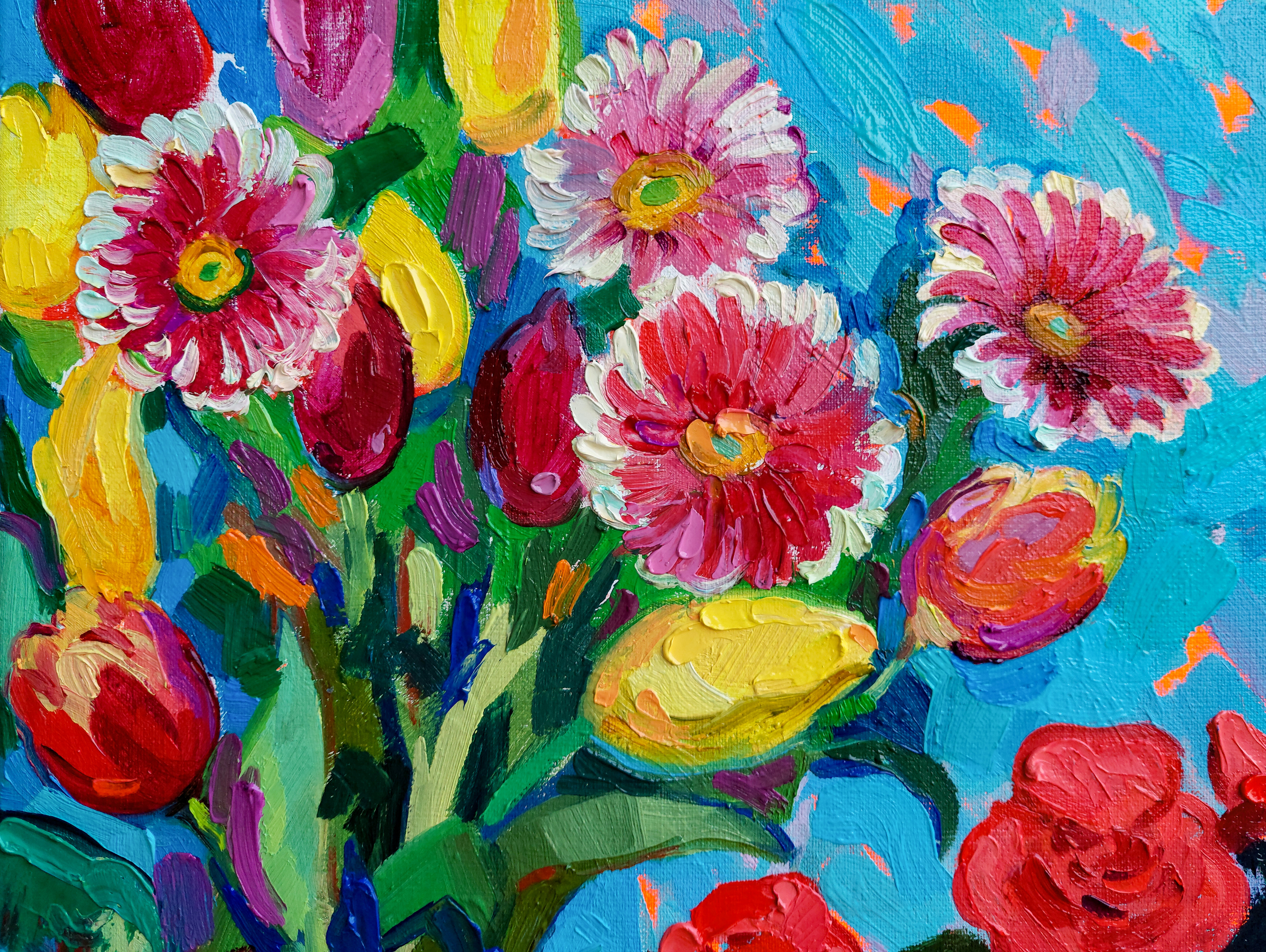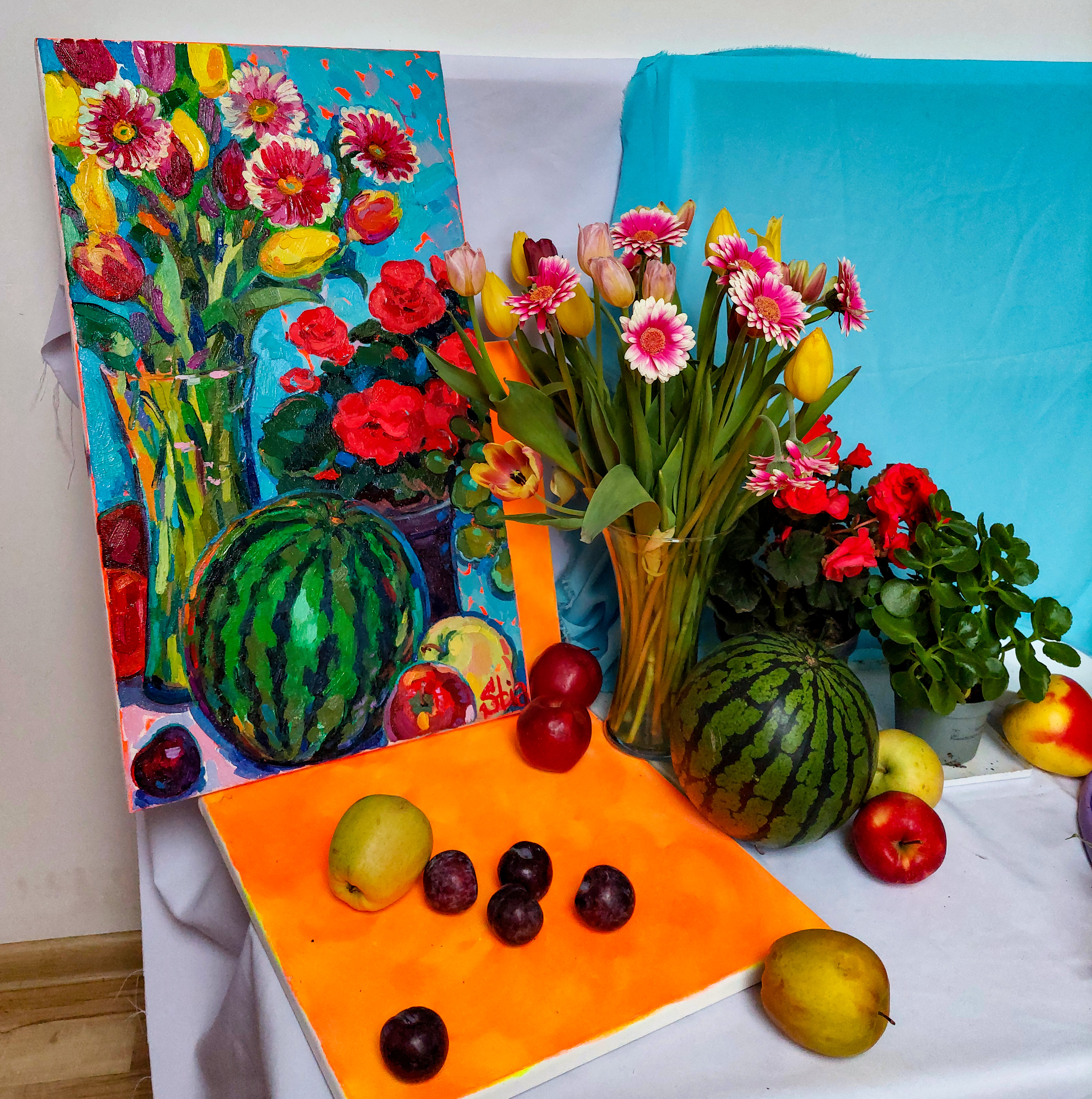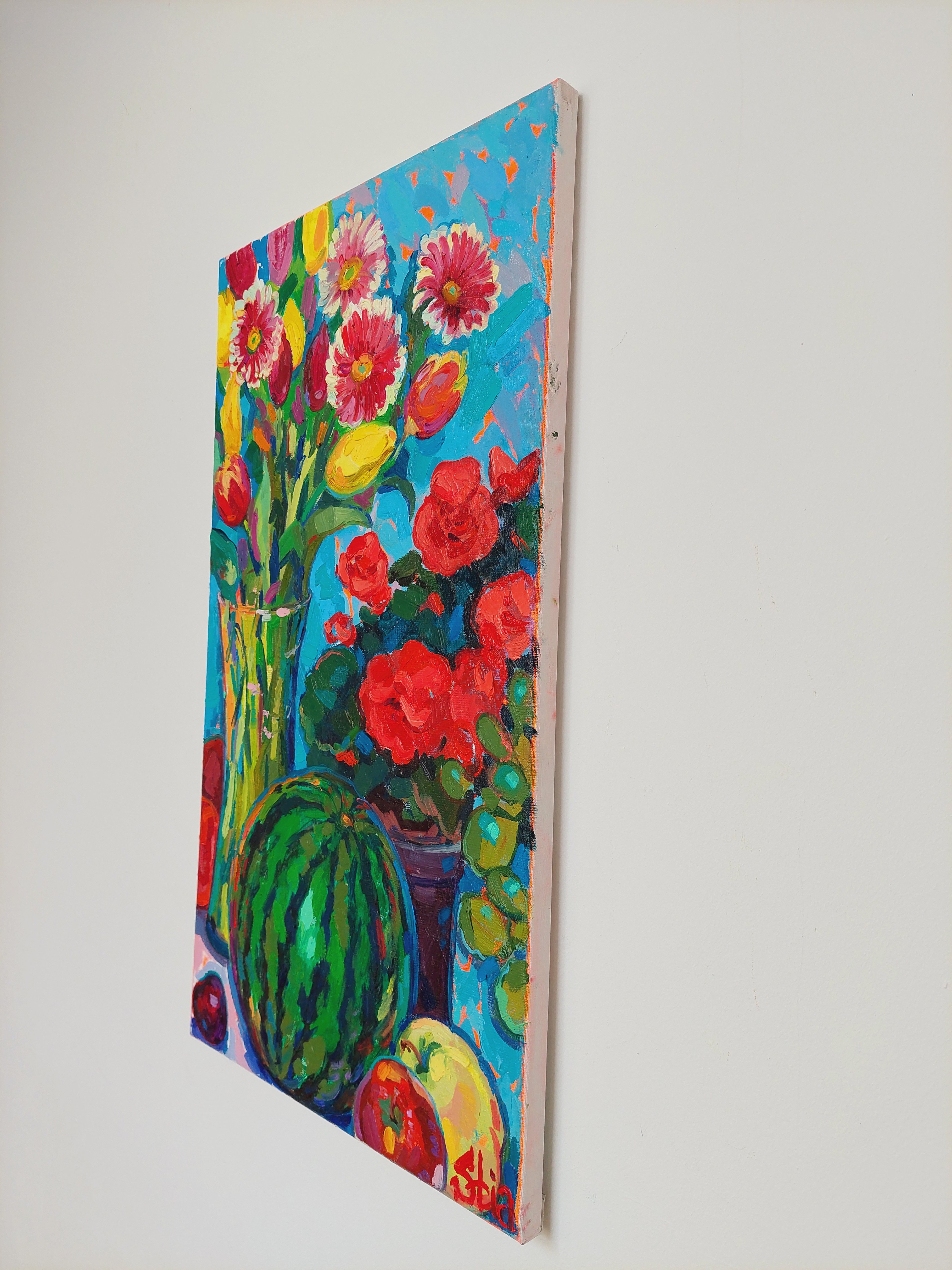 Pełna życia martwa natura, która uchwyca radosny chaos lata — odważne tulipany i pelargonie swobodnie rozkwitają obok soczystego arbuza i dojrzałych śliwek. Obraz wykonany ekspresyjnymi, impastowymi pociągnięciami pędzla emanuje ruchem, fakturą i ciepłem. Głębokie, nasycone odcienie błękitu w tle wzmacniają kontrast i wizualnie ożywiają całą kompozycję. To wyjątkowe dzieło stanowi charakterystyczny przykład stylu Stia (Anastasii Kurkovej) - współczesnej ukraińskiej artystki znanej z emocjonalnej kolorystyki, spontanicznej faktury oraz intuicyjnego, niemal muzycznego wyczucia kompozycji. Idealny wybór dla osób poszukujących wyrazistego, energetycznego akcentu do wnętrza - zarówno domowego, jak i studyjnego czy biurowego.