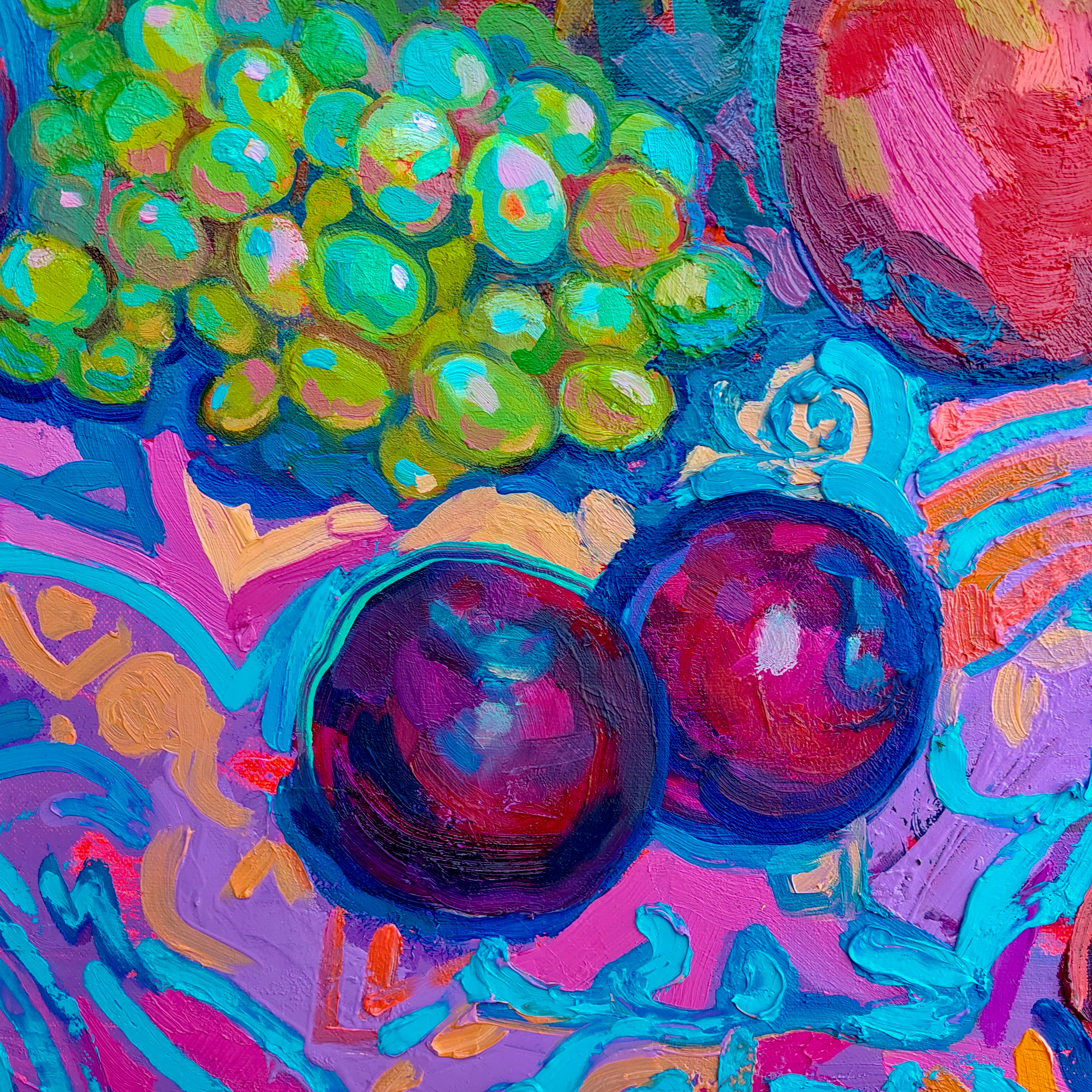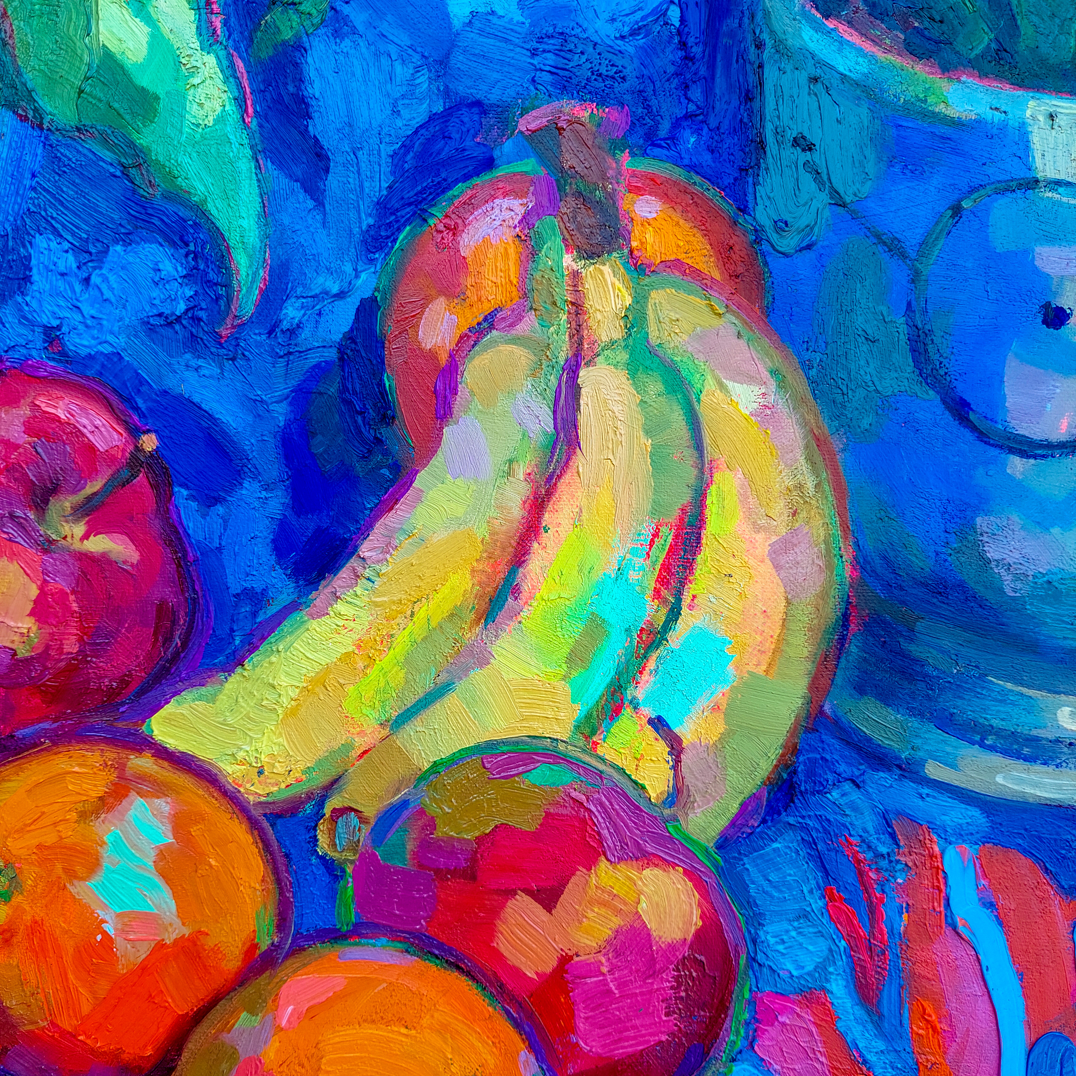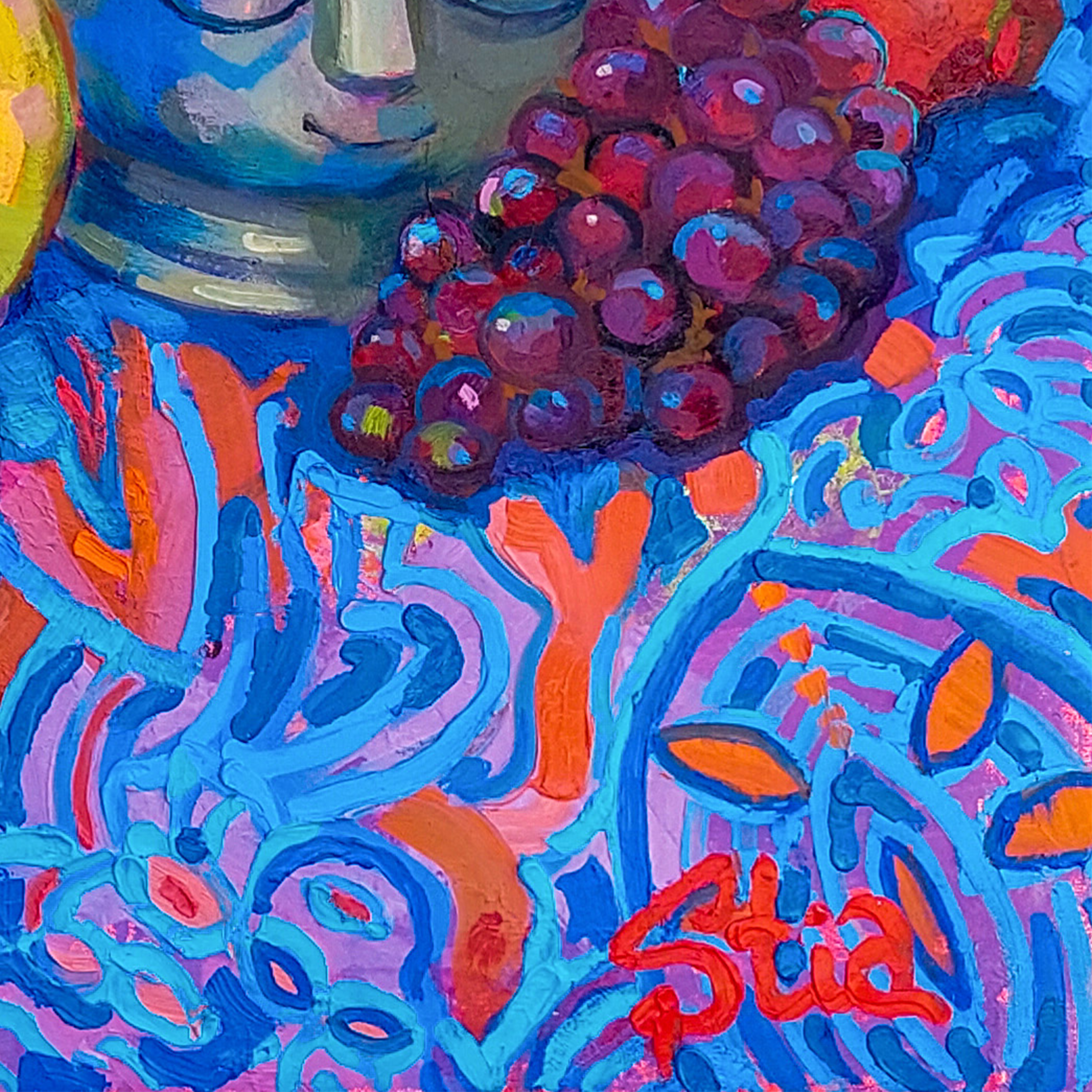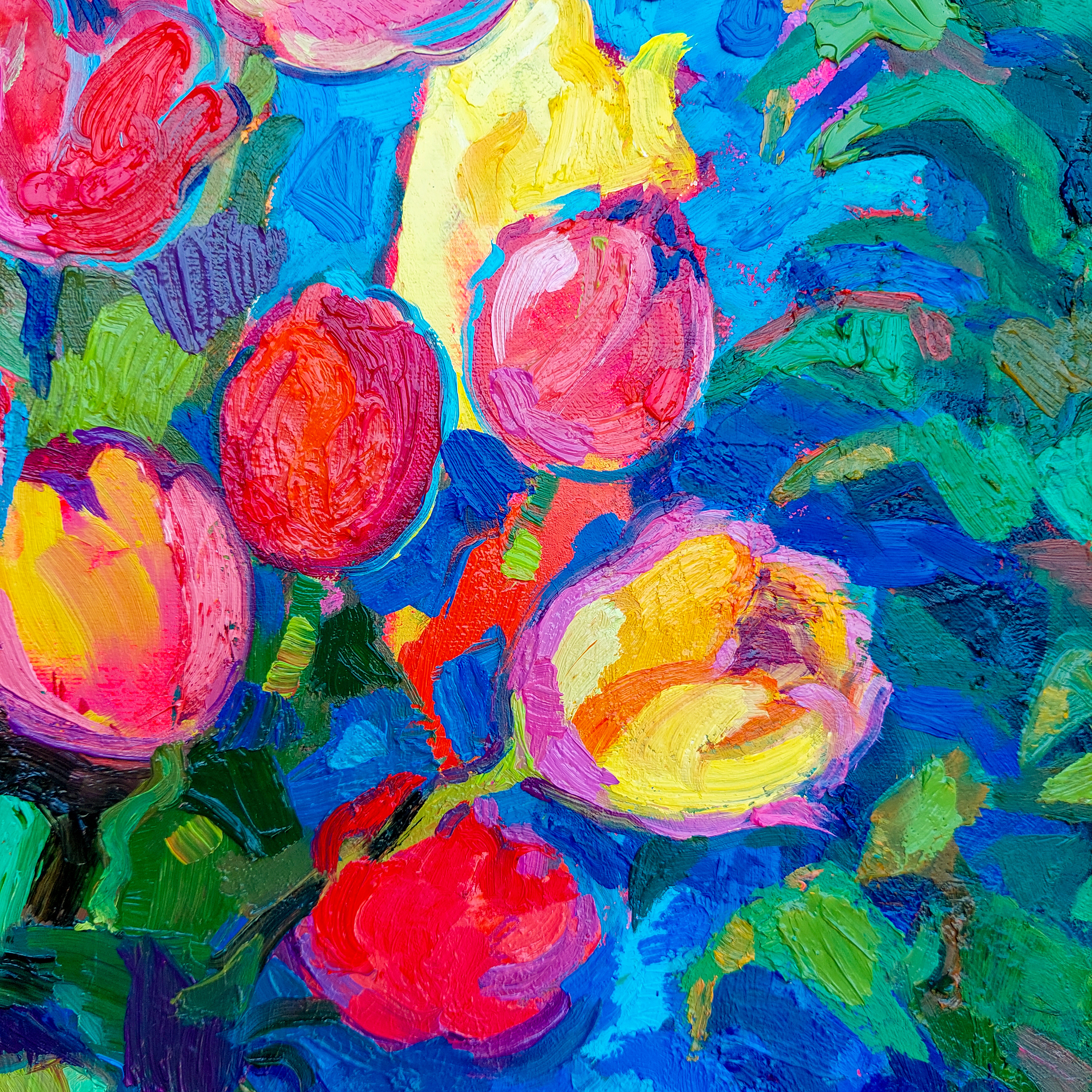„Blooming Spirit of Spring” odsłania urzekający świat, w którym natura ukazuje swoją elegancję i siłę. W centrum kompozycji znajdują się tulipany — prawdziwy tulipanowy czar — emanujące pewnością siebie i odważnym pięknem. Szklany wazon, w którym spoczywa ten wybuch żywych barw, symbolizuje jednocześnie kruchość i odporność, stając się metaforą kobiecej zdolności do pokonywania trudności. To również opowieść o wzroście i odnowie. Otaczające kwiaty soczyste owoce podkreślają odżywczą obfitość natury. Tło, utrzymane w głębokich odcieniach błękitu i fioletu, wprowadza spokojną tajemniczość, zapraszając wyobraźnię widza do wędrówki. Dynamiczne, abstrakcyjne niebieskie tło dodaje głębi i rytmu, wciągając odbiorcę w świat koloru i życia. Figlarne detale, jak doniczka w kształcie uśmiechniętej twarzy, wprowadzają lekki, ludzki akcent. Namalowany odważnym, impastowym stylem z ekspresyjnymi pociągnięciami pędzla, obraz wnosi do każdej przestrzeni ciepło i energię, uchwycając istotę rozkwitającego ducha wiosny. Sygnatura artystki „Stia” dopełnia dzieła, niosąc szept o wewnętrznej sile, pięknie i harmonii, które ucieleśnia przebudzenie wiosny. Idealny dla kolekcjonerów ceniących ekspresyjny kolor, fakturę i celebrację piękna natury.