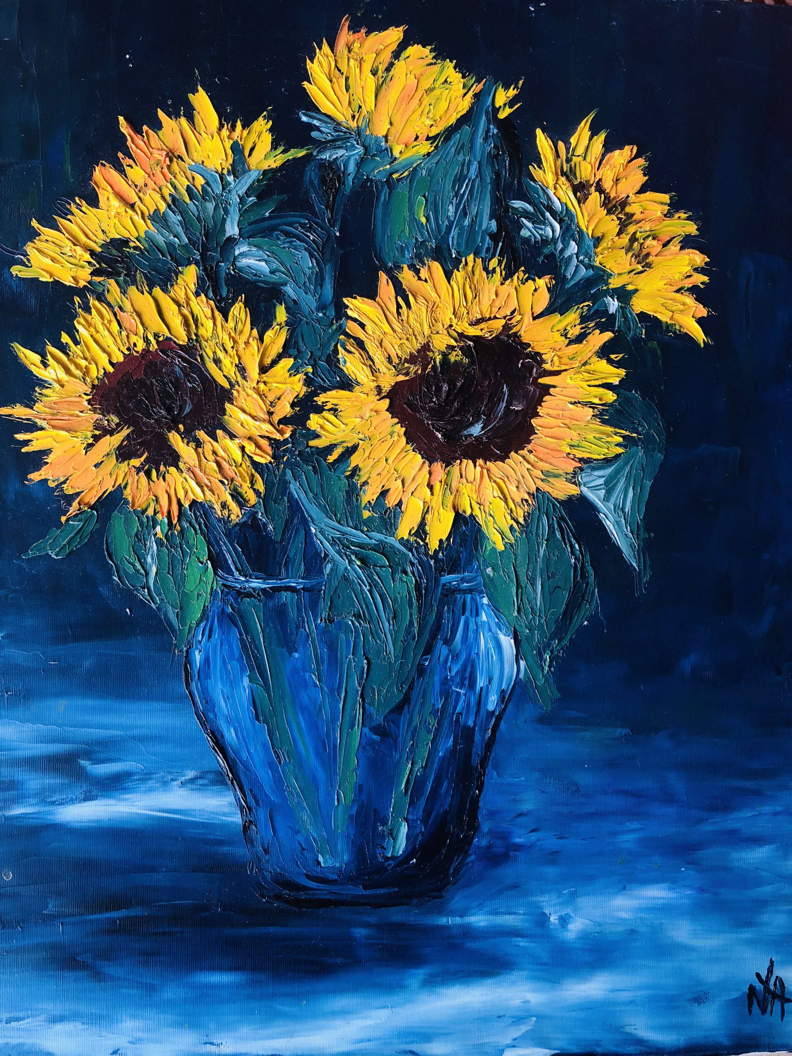 Na obrazie widzimy bukiet słoneczników w niebieskim wazonie, który od razu przyciąga wzrok. Żółte płatki kontrastują z głębokim, granatowym tłem, tworząc dynamiczną kompozycję pełną energii. Grube pociągnięcia pędzla, jakby artysta łapał moment, nadają teksturze życia. Technika impasto sprawia, że kwiaty niemal wychodzą z płótna, próbując dotykać naszego świata. Atmosfera jest nieco nostalgiczna, ale równocześnie radosna. Słoneczniki przypominają mi lato na wsi — proste, piękne wspomnienie. Czuję, jak obraz woła do mnie ciepłym słowem "sunshine". Wywołuje uśmiech i pozwala na chwilę zapomnieć o codziennych troskach. Jak gdyby słońce zatrzymało się dla mnie na chwilę. Patrząc na obraz, zadaję sobie pytanie: co tak naprawdę jest ważne w życiu? Mały Jaś powiedziałby, że to obraz kwiatów. Mistrzowskie użycie kolorów i formy sprawia, że chce się wpatrywać w tę harmonię bez końca.