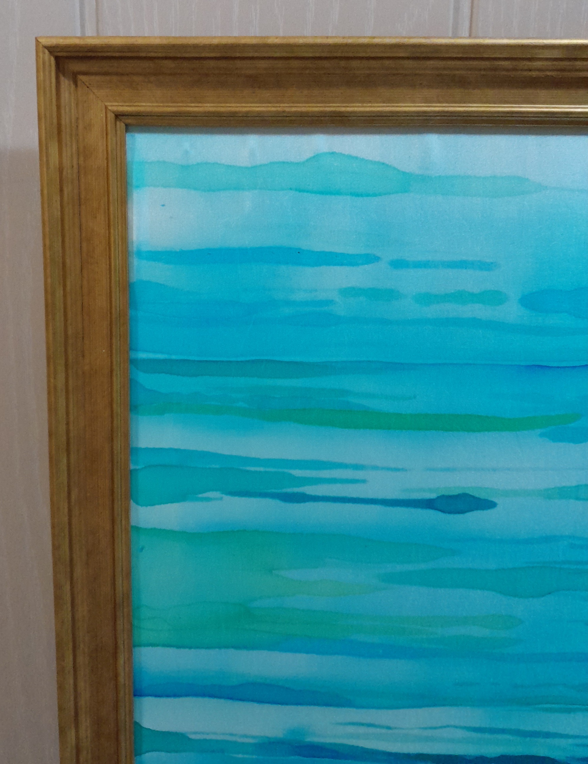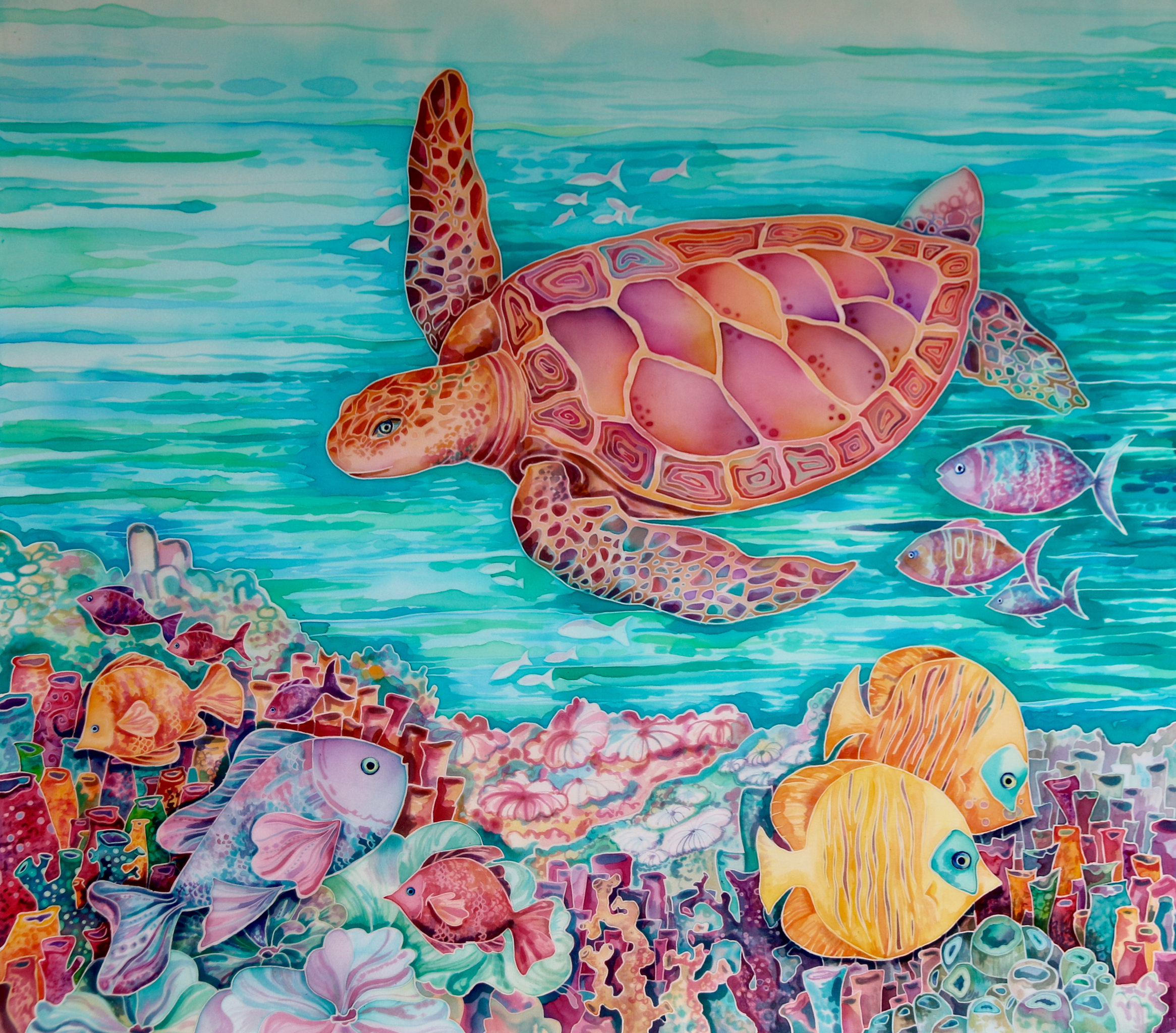 Obraz malowany na naturalnym jedwabiu. Oprawiony w ramę i gotowy do powieszania. Na obrazie widzimy kolorowy, podwodny świat pełen życia. Centralnym elementem jest ogromny żółw morski o muszli w odcieniach różu i pomarańczu. Jego łuski są misternie zdobione geometrycznymi wzorami, jakby ktoś je delikatnie, ręcznie malował. Wokół pływają różnobarwne ryby; ich łuski błyszczą niczym małe, kolorowe latreczki. Tło stanowi uspokajające turkusowe morze, które łagodnie kołysze się, przypominając widzowi o spokoju oceanu. Atmosfera obrazu jest spokojna i pełna harmonii. Człowiek patrząc na ten obraz, może poczuć się jakby sam nurkował w ciepłym, tropikalnym morzu. Artysta zastosował technikę akwareli, co dodaje pracy lekkości i zwiewności. Można odnieść wrażenie, że każda kropla farby została precyzyjnie umieszczona, a jednocześnie całe dzieło sprawia wrażenie spontanicznej eksplozji kolorów. To jest mój ulubiony obraz. Malunek emanuje radością i zachwyt nad pięknem natury. Zwraca uwagę na to, jakie cuda kryją się w oceanie. Elementy te budzą w odbiorcy zachwycająco pozytywne emocje, a całość mówi "take a break" i zachęca do chwili refleksji.