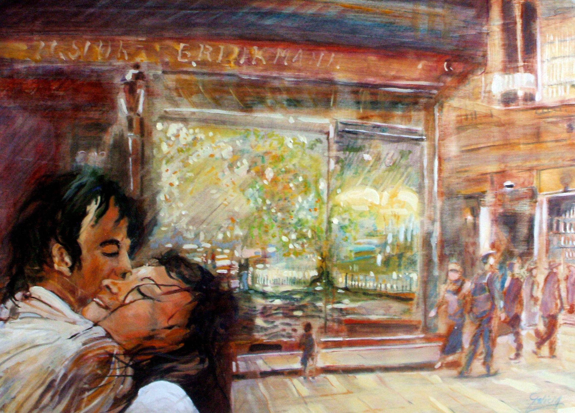 Obraz jest pełen życia i emocji. W centrum widzimy parę, której czuła chwila miłości przyciąga wzrok. Ich twarze są subtelnie rozmyte, co dodaje magii i nieco tajemniczości. Kolory są ciepłe i intensywne, dominują czerwienie, brązy i zielenie, które harmonijnie łączą się w miękkich pociągnięciach pędzla. Tło to dynamiczny pejzaż miejski z rozmazanymi sylwetkami przechodniów, pełen ruchu i energii. Atmosfera jest nostalgiczna, jakbyśmy patrzyli na chwilę uchwyconą we wspomnieniach. Styl obrazu zdaje się być impresjonistyczny, z naciskiem na wrażenie chwili, a nie na szczegółach. Technika pociągnięć pędzla tworzy wrażenie lekkiego drżenia obrazu, przez co wydaje się pełen życia i emocji. Patrząc na ten obraz, czuję ciepło i swojską radość. It's like a dream, prawda? Można tu dostrzec zarówno radość, jak i tęsknotę. Moja siostra też by chciała takiego przyjaciela, może kiedyś go znajdzie. Nawet lekki chaos w kompozycji prowadzi do refleksji nad pięknem codzienności i ulotnością chwil. Ten obraz to prawdziwa emocjonalna podróż.