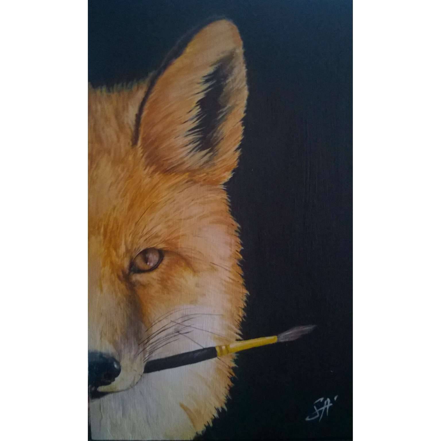 Na obrazie widzimy przebojowego lisa z pędzlem w pysku, który niczym artysta emanuje twórczą energią. Pół twarzy lisa wypełnia ramę obrazu. Jego intensywne oko, osadzone w ciepłych, rdzawych odcieniach futra, hipnotyzuje. Uchwycone szczegóły futra są oszałamiające. Tło to głęboka czerń, która dodaje dramatyzmu i podkreśla ogniwisty kolor lisa. Artysta zastosował realistyczną technikę, dbając o subtelne przejścia tonalne. Ten obraz jest po prostu wow! Obraz emanuje nieco ironicznym, ale i zabawnym nastrojem. Czy lis chce coś namalować? A może po prostu wygląda na uradowanego z nowo zdobytej zdolności tworzenia? Styl artysty zdaje się nawiązywać do realistycznej sztuki, jednocześnie bawiąc się konwencją i humorem. To dzieło zachęca do uśmiechu, refleksji nad rolą kreatywności w naturze. Małe dzieci pewnie powiedziałyby: "On chce być malarzem!" A ja sobie myślę, że ten lis jest jakby trochę artystą duszy. Tego typu obraz zapada w pamięć - odważny i pełen życia. Widać, że lis ma talent, prawda?