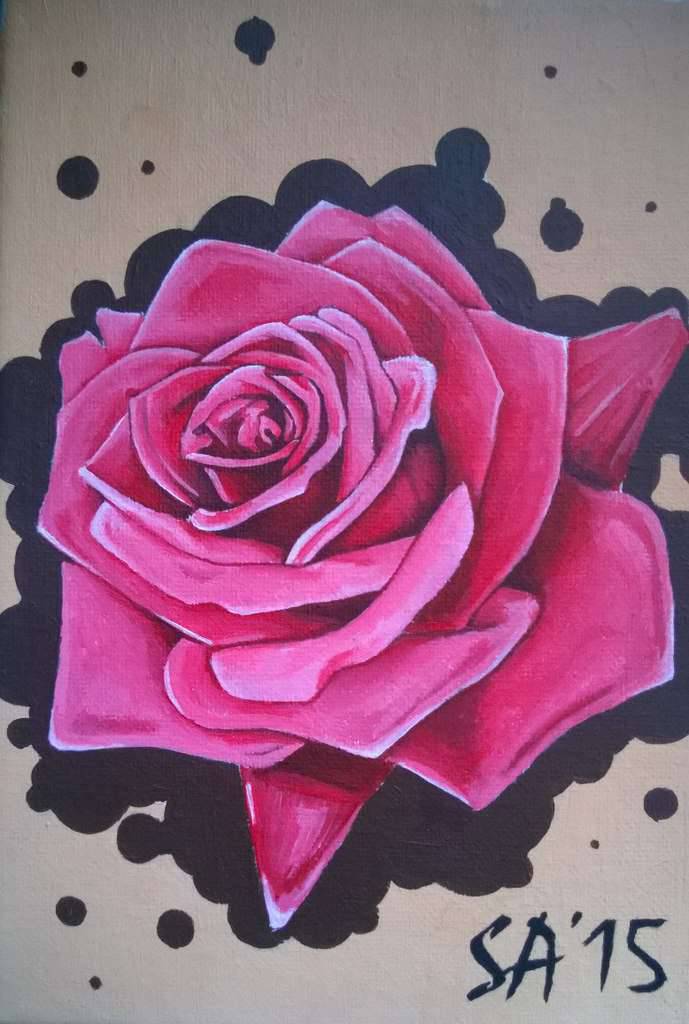 Obraz przedstawia intensywnie różową różę, której płatki zdają się tańczyć na tle beżowego płótna. Ciemne cienie otaczające kwiat dodają mu głębi, a kontrast między kolorami podkreśla jego delikatność. Kompozycja jest prosta, ale skutecznie skupia uwagę na pięknie kwiatu. Rozlane, czarne plamy, które niespodziewanie pojawiają się wokół róży, nadają obrazowi nowoczesny twist, jakby artysta chciał dodać element zaskoczenia. Atmosfera dzieła jest pełna romantyzmu i tajemniczości. To jak baśń opowiedziana na płótnie, gdzie róża jest główną bohaterką. Styl artysty przypomina graffiti art, z odważnymi konturami i dynamicznymi liniami. Technician - czy dobrze to napisałem? Udało się uchwycić wrażenie spontaniczności i kreatywności poprzez ostrą kolorystykę i zróżnicowaną fakturę. Ten obraz może wzbudzać różne emocje. Może kojarzyć się z młodzieńczą miłością, a może z ulotnością piękna. Wywołuje zarówno nostalgiczny uśmiech, jak i pewien smutek, jakby sugerując, że wszystko, co piękne, kiedyś przemija. Dla mnie jest jak ukryty skarb, który można odkrywać na nowo, za każdym razem dostrzegając coś innego. Dzieci mogą powiedzieć: "Róża wygląda jak cukierek!" Bo kto nie lubi cukierków? Ten obraz to prawdziwa uczta dla oczu i serca.