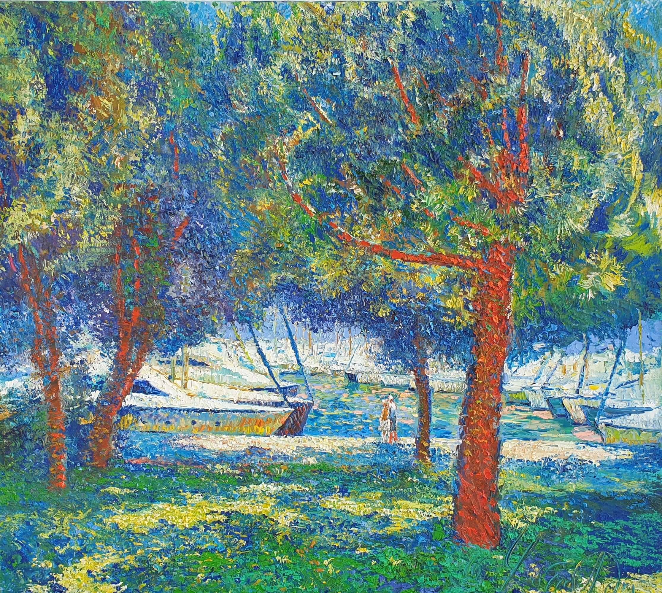 It was a sunny day. I painted this landscape in a good mood. The sun blinded my eyes. People walked along the quay of Antibes. Ultramarine shadows catch the eye of the beholder, while bright white yachts can be seen in the background.