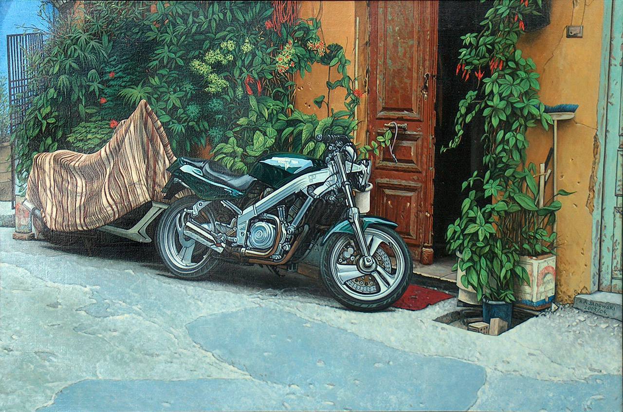 Na obrazie zauważamy motocykl, który z gracją opiera się o starą, drewnianą drzwi, otoczoną zielenią. Rośliny pną się po ścianie, tworząc bujne tło, a ich soczyste odcienie przeplatają się z ciepłymi, stonowanymi barwami budynku. Kompozycja jest jednocześnie harmonijna i dynamiczna. Artysta zastosował realistyczny styl, z dbałością o detale, co sprawia, że patrząc na ten obraz, czujemy jakbyśmy mogli niemal usłyszeć szelest liści i stukot metalu. Nastrój tutaj jest nostalgic, przypomina letnie popołudnie pełne spokoju. Dla niektórych to może być symbol wolności, przypomina o podróżach i odkrywaniu nieznanych zakątków. A może to tylko zwykły dzień, którym żyjemy na własnych warunkach. Oj, chyba bym chciał się teraz tam znaleźć i poczuć ten klimat! A truck lorry would envy the elegance of this vehicle. Obraz wywołuje uczucie tęsknoty za przygodą i odkrywaniem świata. Dziecko powiedziałoby: "Chciałbym pojechać tym motorem do babci!" Twórca wprowadza nas w świat, gdzie codzienność miesza się z marzeniami.