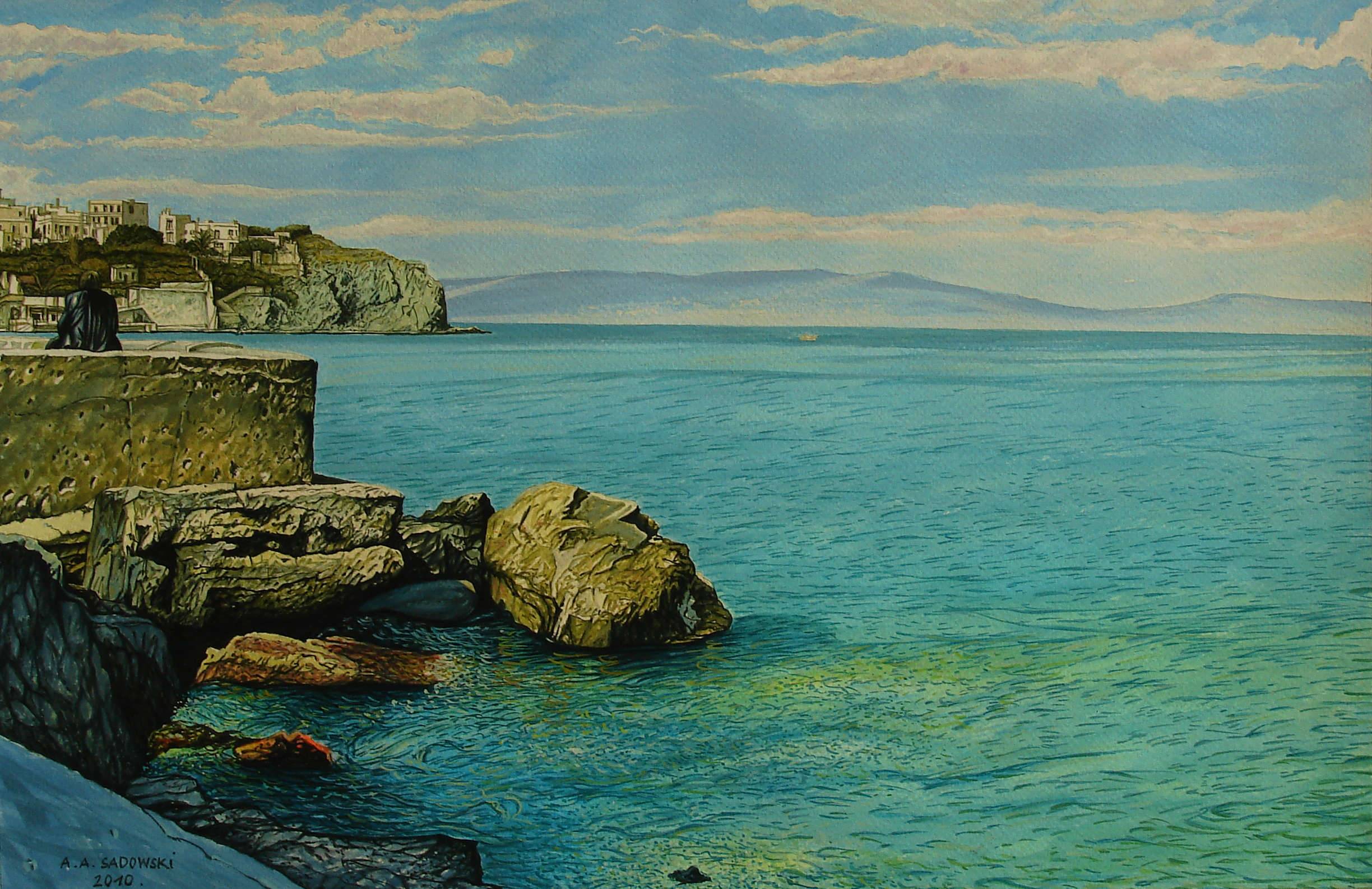 Obraz rzuca na nas błękit nieba i morza, które stapiają się w subtelną harmonię. Linie fal delikatnie muskają skaliste wybrzeże, tworząc dynamiczny kontrast z solidną, nieruchomą sylwetką klifów. Na pierwszy rzut oka kompozycja wydaje się spokojna, lecz w głębi czai się tajemnica. W lewym górnym rogu ujawnia się cicha obecność niewielkiego miasteczka, a jego budynki wspinają się na wzgórza jak małe pionki na planszy. Atmosfera jest nostalgiczną podróżą; emanuje poczuciem samotności, a jednocześnie otuchy. Artysta wplata pastelowe kolory, aby dodać dziełu miękkości i delikatności. Technika akwareli, z subtelnymi pociągnięciami pędzla, sprawia, że obraz jest niczym ulotne marzenie, które unosi się na wietrze. Wow! Widok ten może wywoływać u odbiorcy różne emocje: od refleksji nad przemijaniem czasu po podziw dla surowego piękna natury. Czasem myślę, że chciałbym tam być i bawić się w wodzie, jak wtedy, gdy byłem mały. Zaskakuje mnie, jak jeden obraz może mówić więcej niż tysiąc słów. To prawdziwe "escape" do spokojniejszego świata, gdzie wszystko jest na swoim miejscu, a życie płynie leniwie.