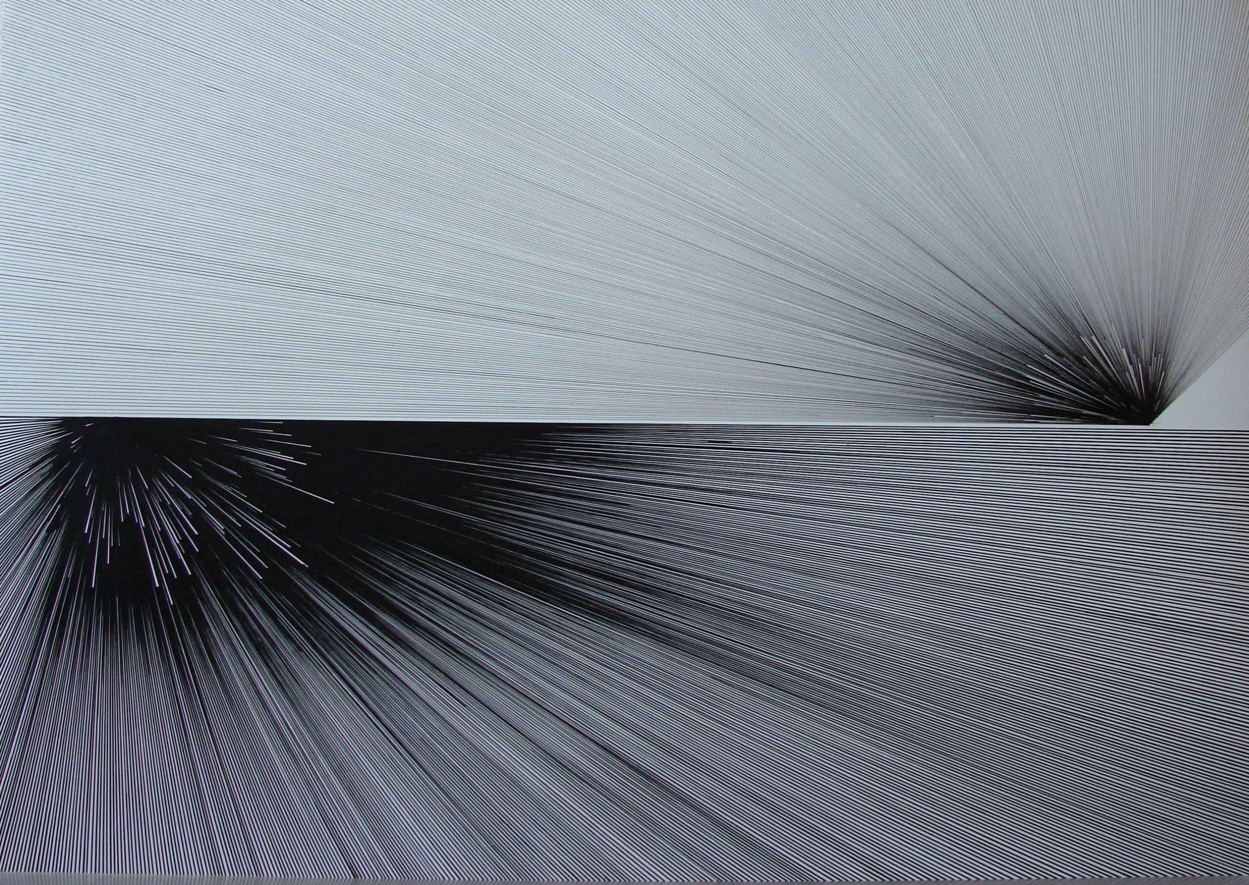 Obraz składa się z dynamicznych linii promieniujących z dwóch punktów, które wydają się eksplodować z narożników płótna. Górna część utrzymana jest w jasnych odcieniach szarości, podczas gdy dolna intensyfikuje się w czerni. Kontrast między nimi przyciąga wzrok, tworząc iluzję ruchu i głębi. Wygląda jak gwiezdny pęd czy też burst of energy. Atmosfera dzieła jest intensywna i niemal kosmiczna, sugerując nieskończoność oraz tajemniczość wszechświata. Artysta wykorzystuje technikę grafiki liniowej, gdzie precyzyjne linie tworzą prawdziwy spektakl wizualny. Czuć przy tym rytm i harmonię ukryte w każdym szczególe. Kompozycja jest minimalistyczna, ale jednocześnie bogata w znaczenia. Patrząc na obraz, można poczuć delikatne napięcie, jakby coś miało wydarzyć się zaraz. Dla dziecka może to wyglądać jak szalone linie na szybkiej zjeżdżalni. Obraz budzi emocje niepokoju i zachwytu. Może wywołać refleksje na temat początku i końca, kosmicznych eksplozji, a także chaotycznej natury życia. To dzieło sztuki, które jednocześnie fascynuje i skłania do zadumy. Jakby mówiło: spójrz głęboko i odkryj tajemnice. A ja myślę sobie, że to taki obraz, który sprawia, że czujesz się maluśki wobec ogromu kosmosu.