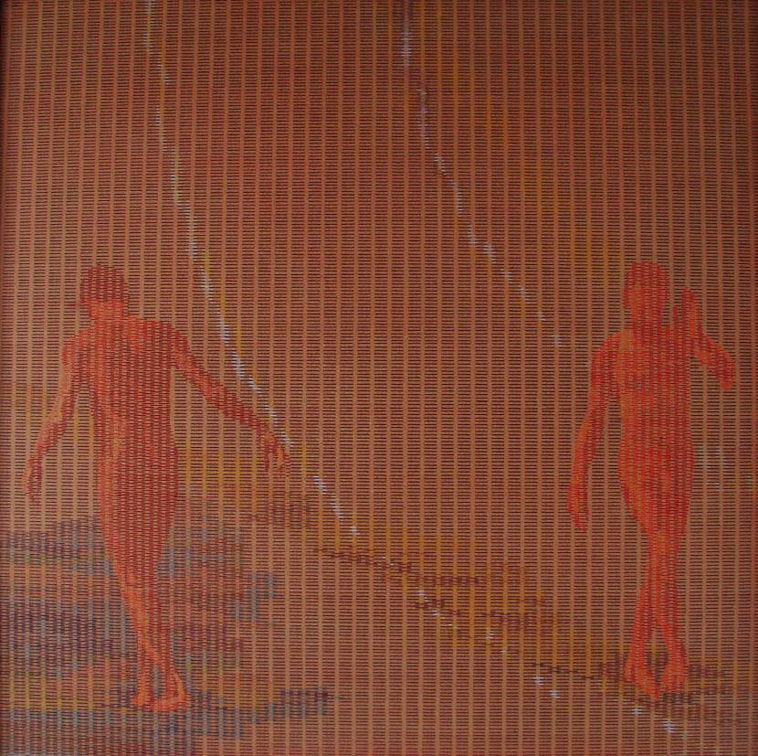 Na obrazie dominują ciepłe, ziemiste barwy, przeważa głęboki czerwień i brąz. Są tu dwie postaci, które zdają się być zatopione w tańcu lub tajemniczym dialogu. Ich sylwetki są subtelnie zaznaczone, jakby malowane lekkim pociągnięciem pędzla przy użyciu drobnych kropek. Tło pełne linij i tekstur, niby pajęczyna, dodaje im głębi. Atmosfera obrazu jest nieco surrealistyczna i introspektywna, jakby wpuszczała odbiorcę w inny świat. Tak, jakby czas się zatrzymał tylko dla tych postaci. Artysta używa techniki pointylizmu, tworząc szczegółowy wzór, który hipnotyzuje odbiorcę. Wrażenie ruchu wzbudza ciekawość i zachęca do refleksji nad tym, co dzieje się między postaciami. Obraz przywołuje emocje związane z tajemnicą i napięciem, jednocześnie dając poczucie harmonii. Gdy na to patrzę, myślę o tym, jak ludzie potrafią być blisko, a jednak tak od siebie oddaleni. Dziecko powiedziałoby: "Oni chyba tańczą w deszczu. " Emocjonalny rollercoaster, jakby na chwilę zatrzymał się świat. Po angielsku powiedziałbym, że to true art.