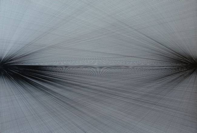 Obraz oszałamia grą linii i cieni, gdzie dominują głębokie odcienie szarości. Linie rozchodzą się promieniście od dwóch punktów, jakby były ciągnięte przez niewidzialne siły. Kompozycja przywodzi na myśl pękniętą przestrzeń, jakbyśmy spojrzeli przez soczewkę na rozwijający się wszechświat. Czuje się tu pewną dynamikę, choć wszystko pozostaje nieruchome. To jak patrzenie w otchłań, która niby ciągnie wzrok do swojego wnętrza. Nastrój emanuje z obrazu spokojem, ale też pewnym niepokojem. Jakby zaraz coś niesamowitego miało się wydarzyć. Artysta użył finezyjnych technik linearnego rysunku, tworząc iluzję trójwymiarowości i głębi. Efekt jest hipnotyzujący, i to jak magiczne zaklęcie. Człowiek patrzy i nie może oderwać oczu. Obraz może wywoływać różne emocje u widza. Jedni mogą czuć zafascynowanie, inni subtelny lęk. "It's like a mystery" - powie ktoś. To niezwykle fascynujące, jak coś tak prostego może być tak skomplikowane. I ja sobie myślę, że to jak patrzeć na samą istotę rzeczy. Jeden siedmiolatek mógłby powiedzieć: "To wygląda jak dziwna pajęczyna!". Każdy inaczej to odbiera, i to jest w tym piękne.