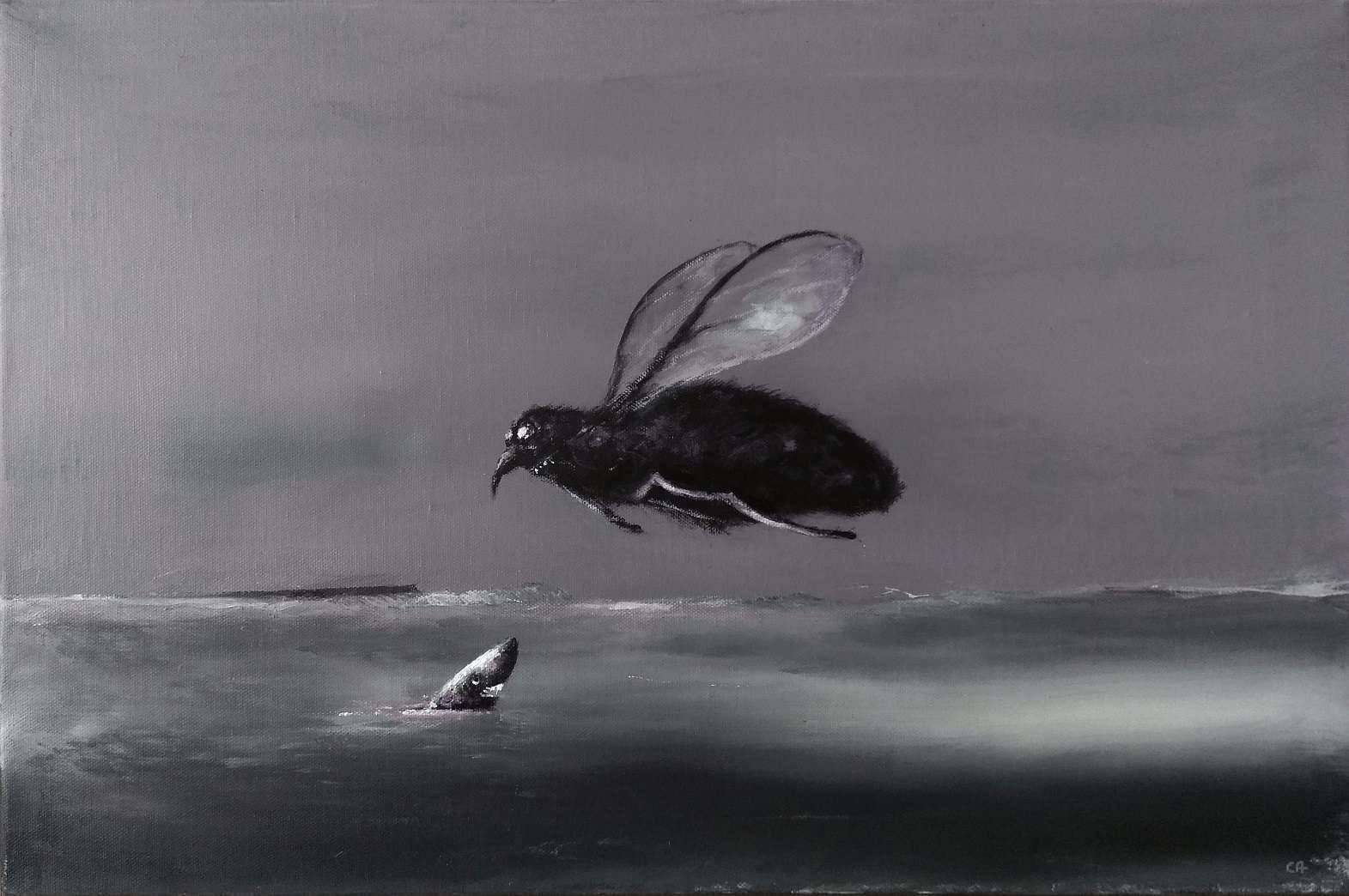 Na obrazie dominują odcienie szarości, budując tajemniczy i nieco ponury nastrój. Centralnym punktem jest ogromna mucha unosząca się nad wodą. Jej ciemne, niemal czarne ciało kontrastuje z półprzezroczystymi skrzydłami odbijającymi delikatnie światło. Poniżej, w wodzie, wynurza się głowa rekina, jakby obserwował nieproporcjonalnie dużego owada. Kompozycja jest nietypowa, a jednocześnie intrygująca, zmuszając widza do zatrzymania się na dłużej. Artysta użył techniki olejnej, co nadaje płótnu głębi i faktury, a jednocześnie dodaje obrazowi realistycznego i surrealistycznego charakteru. Obraz może wywoływać wrażenie niepokoju, jakby coś, co wydaje się niemożliwe, nagle stało się realne. A może wcale nie chodzi o muchę i rekina, tylko o coś zupełnie innego? Bo dzieciak by powiedział: "Mucha i rekin są przyjaciółmi i bawią się w wodzie!". Osobiście uderza mnie dualność tej sceny. Jest trochę creepy, ale też fascynująca. Co jeśli ten obraz to metafora jakiegoś większego chaosu? Takiego, gdzie małe jest duże, a duże - małe? Może to po prostu "weird dream" przeniesiony na płótno?